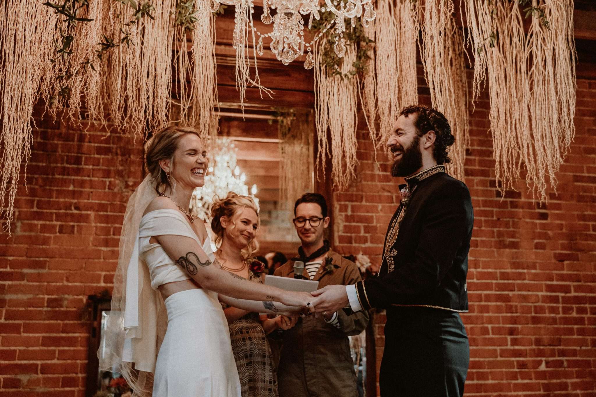 The choices they made for the ceremony and reception broke away from standard formats. Collin had left a conservative religious upbringing, and none of his family attended. That absence shaped the day and gave weight to the idea of chosen family. They walked down the aisle together, their two best friends officiated, and the vows were rewritten into something raw and specific. “Instead of the usual do you take this person in sickness and health etc, we placed our hands on each others’ chests and took each other in our power, pleasure, and pain”, they explained.
