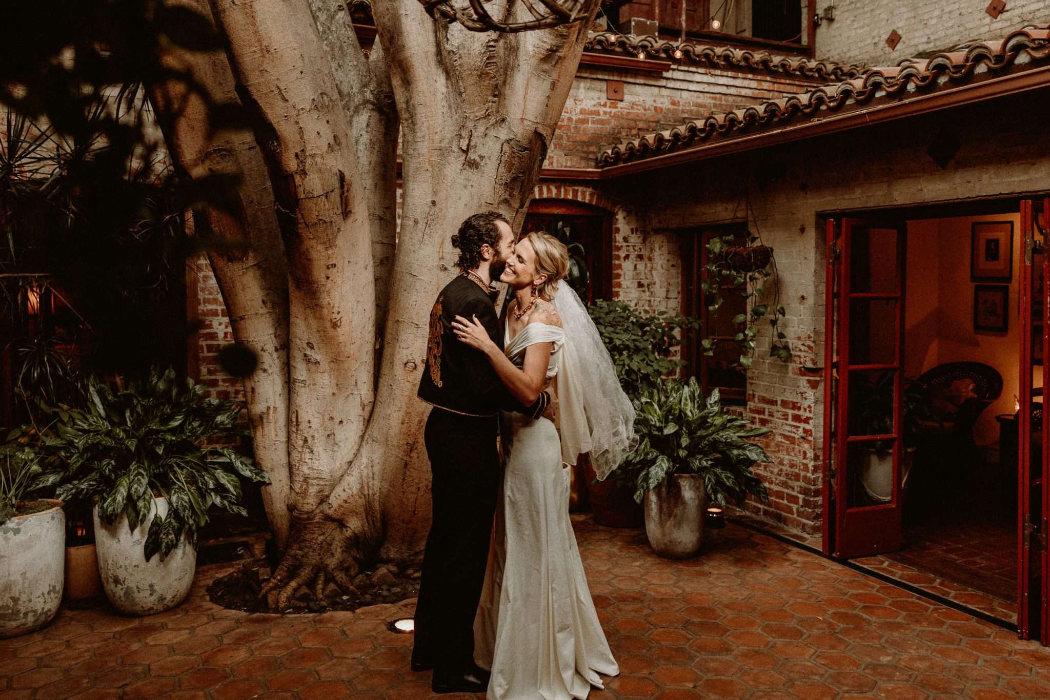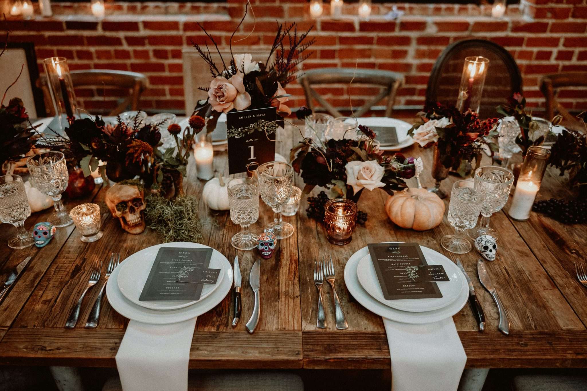 Maya and Collin chose Halloween season as the backdrop for their wedding. They kicked things off with a trip to Halloween Horror Nights, and wanted a day that was part goth, part fall harvest, part Day of the Dead. “We were thinking spooky romantic”, Maya said. Their florist, The Little Branch pulled their styling ideas together with dark plums, branches, moss, and skulls. The look felt old-world and atmospheric without needing much direction.