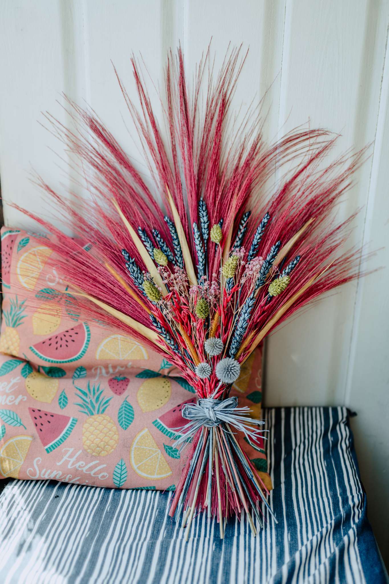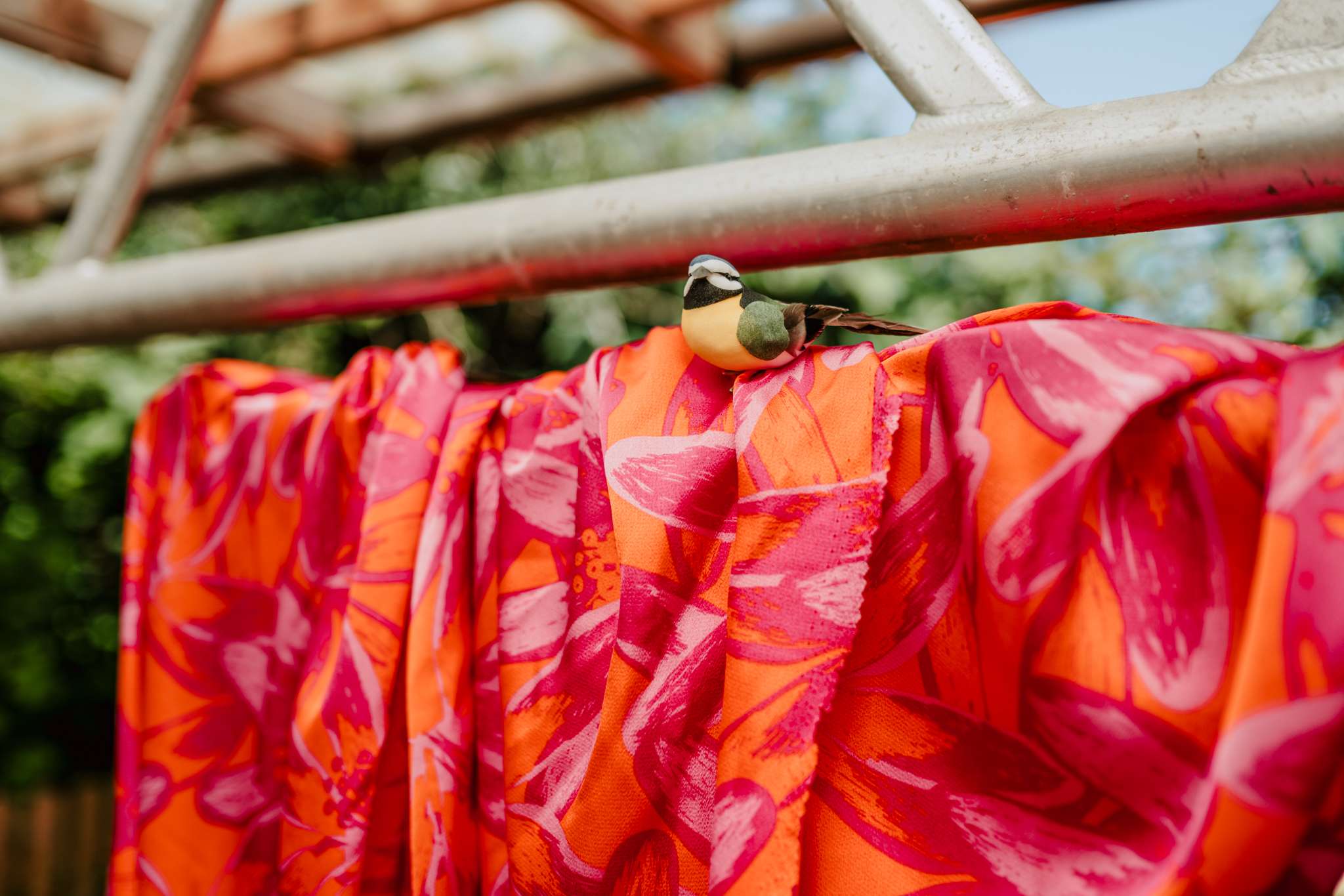 They also wanted the day to be vibrant and joyful, full of colour and handmade touches. Their palette mixed light blue, petrol blue, olive green, orange and hot pink. Marie already had her dress, which she’d found on ASOS, so once Doug chose his suit, they leaned into clashing tones to make their outfits pop. They didn’t want to fill the room with lots and lots of décor, but what they did include was personal and crafted by hand.