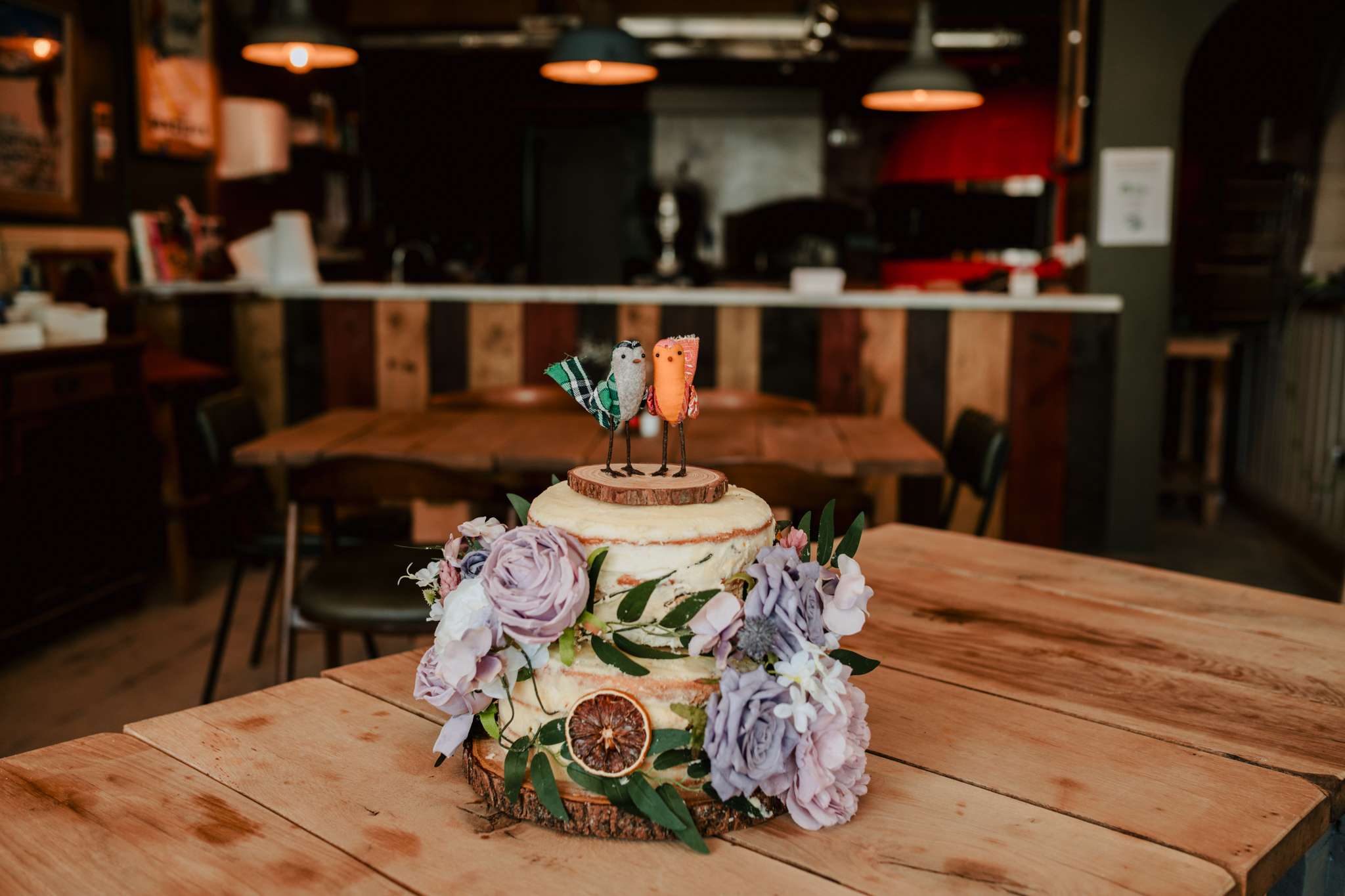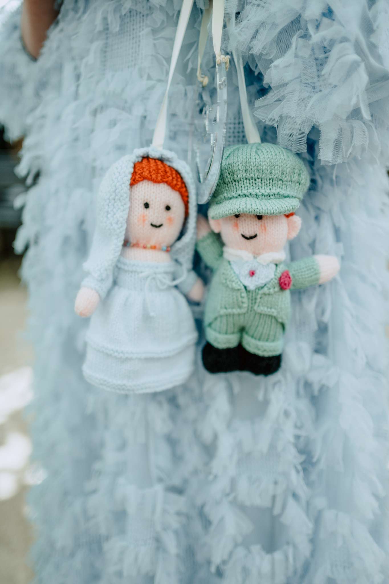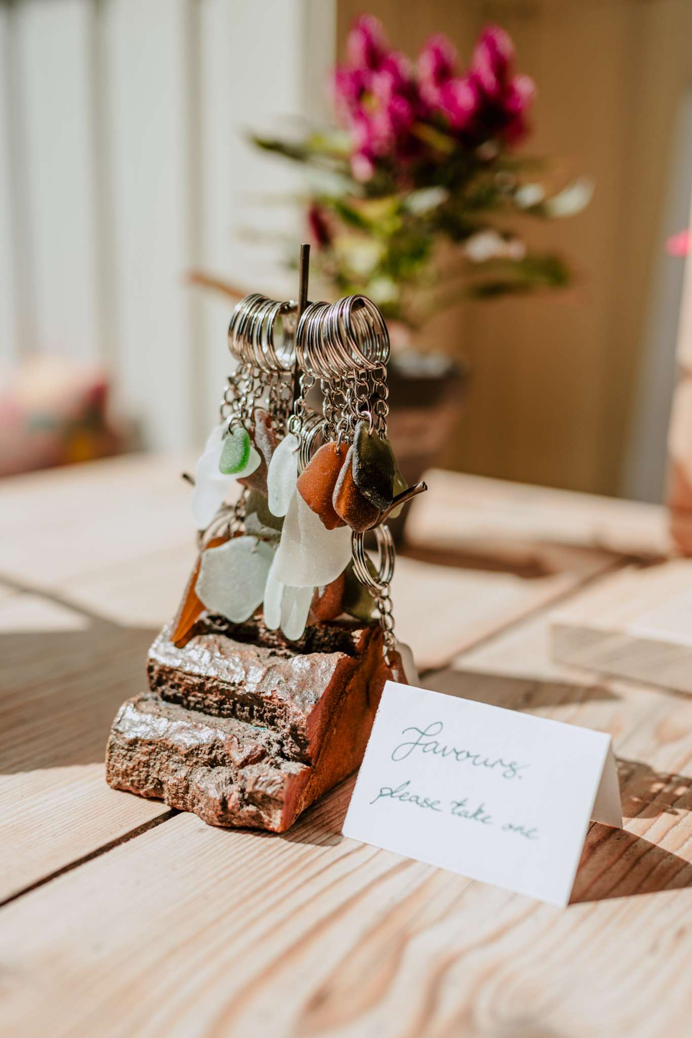 Family and friends contributed to the details. Doug made a wooden photo frame wrapped in wool. Marie made her bouquet and Doug’s lapel flowers. Her mum knitted miniature versions of the couple, her sister-in-law baked the cake, and her sister sewed two tiny fabric birds as toppers. They hammered flowers onto handmade invitations, painted their own signage, and turned sea glass from Cornish beaches into keyrings as favours.