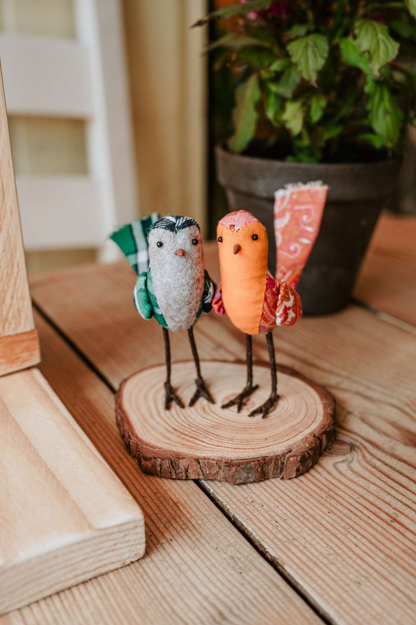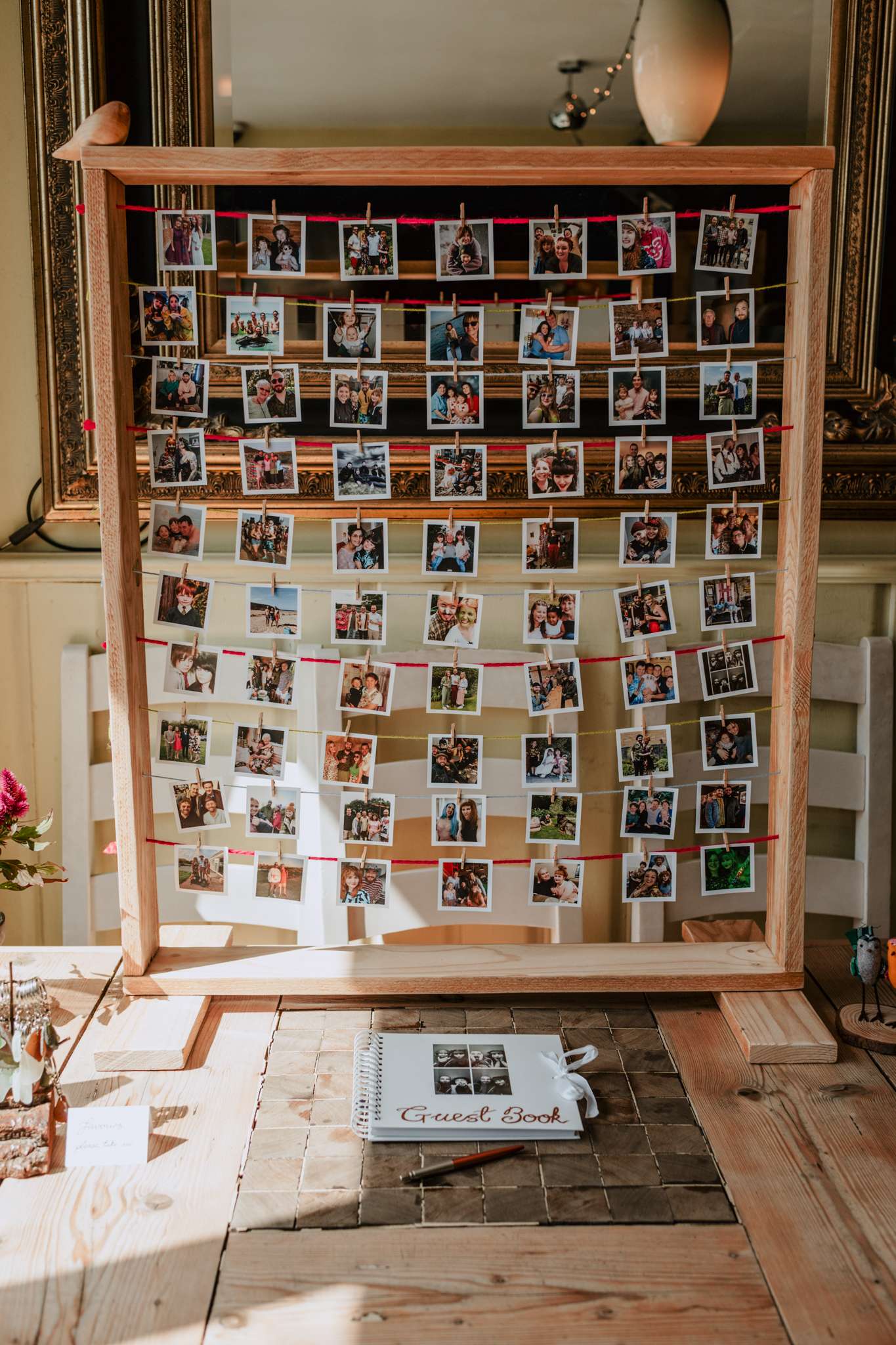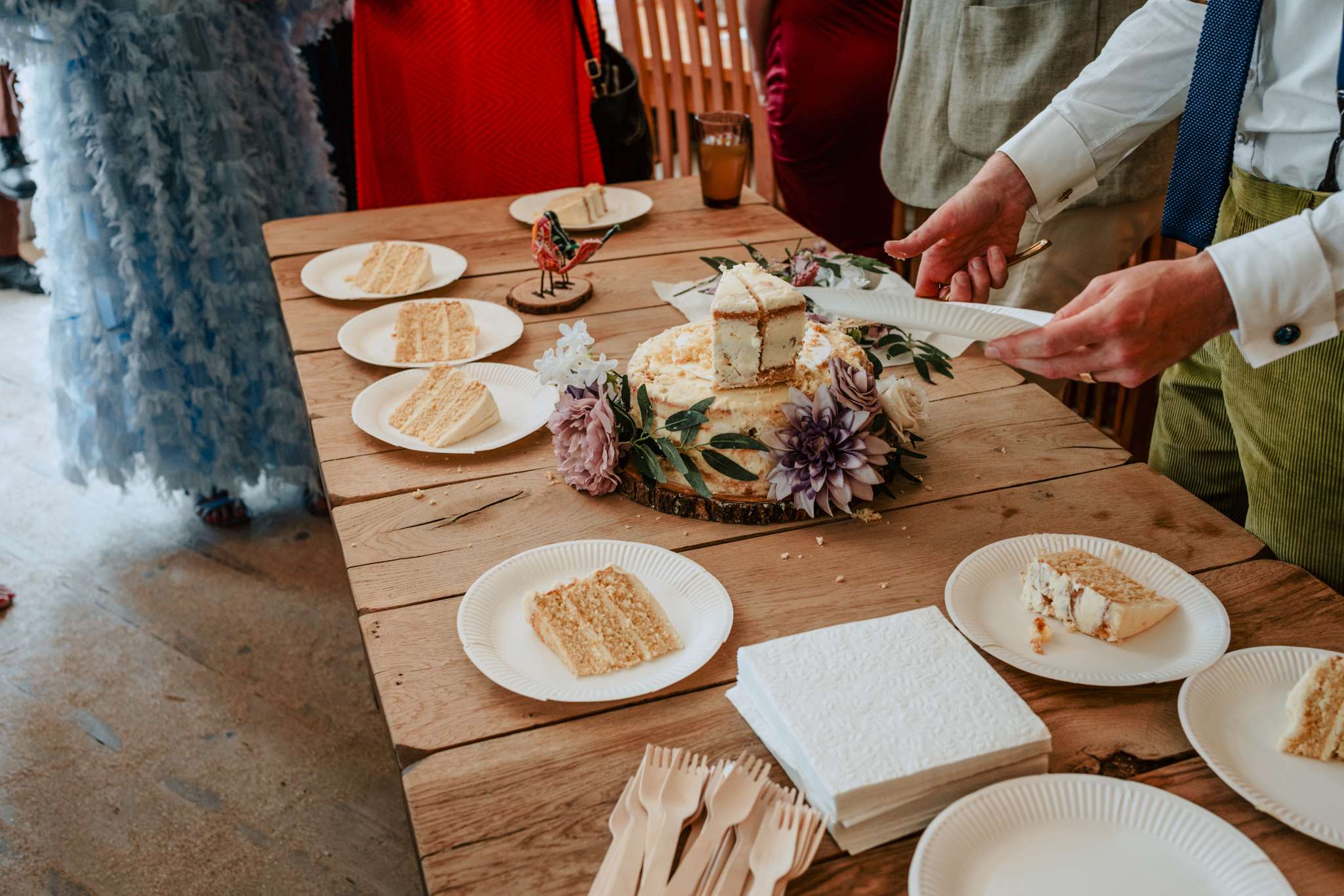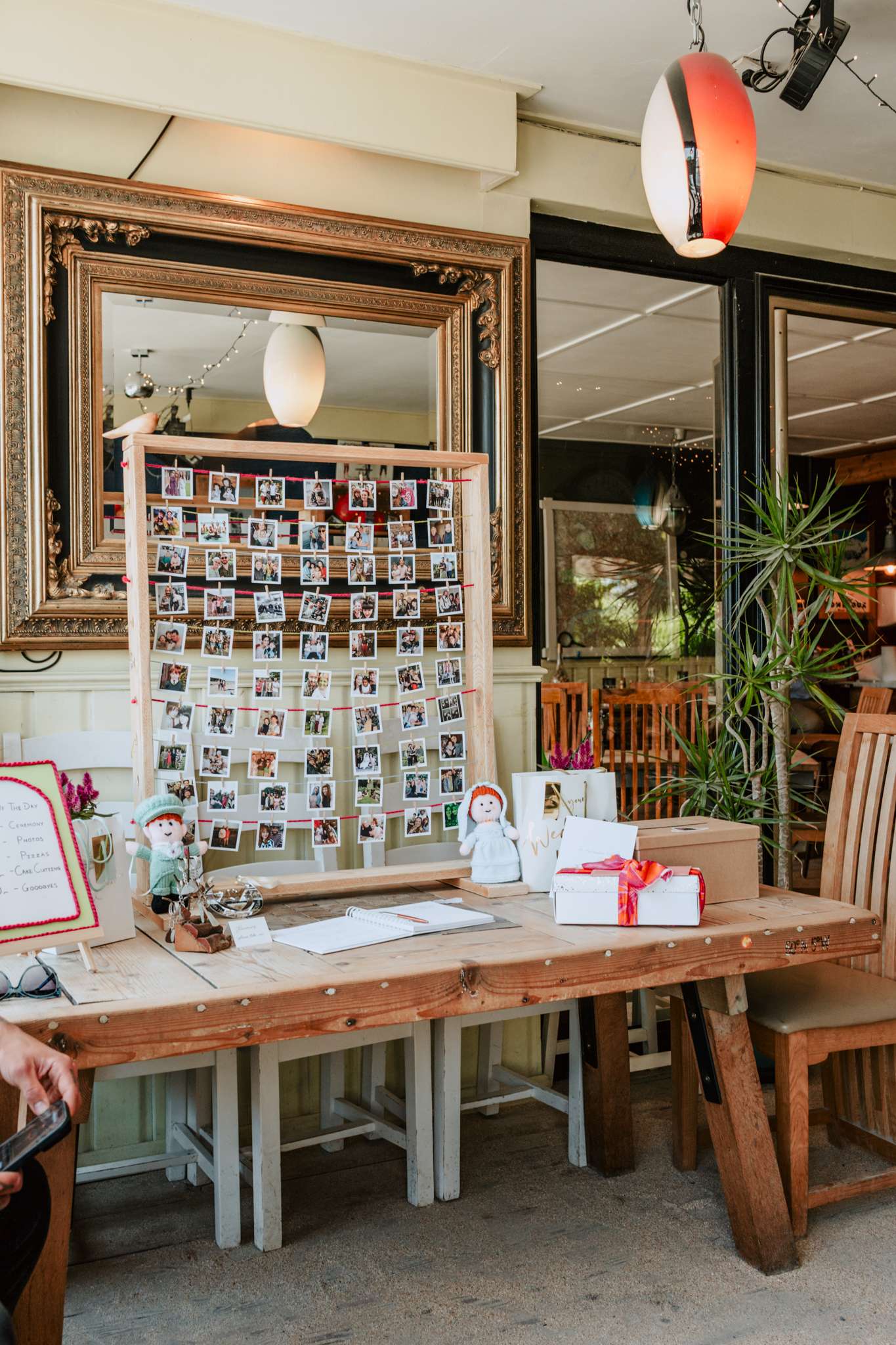 Family and friends contributed to the details. Doug made a wooden photo frame wrapped in wool. Marie made her bouquet and Doug’s lapel flowers. Her mum knitted miniature versions of the couple, her sister-in-law baked the cake, and her sister sewed two tiny fabric birds as toppers. They hammered flowers onto handmade invitations, painted their own signage, and turned sea glass from Cornish beaches into keyrings as favours.