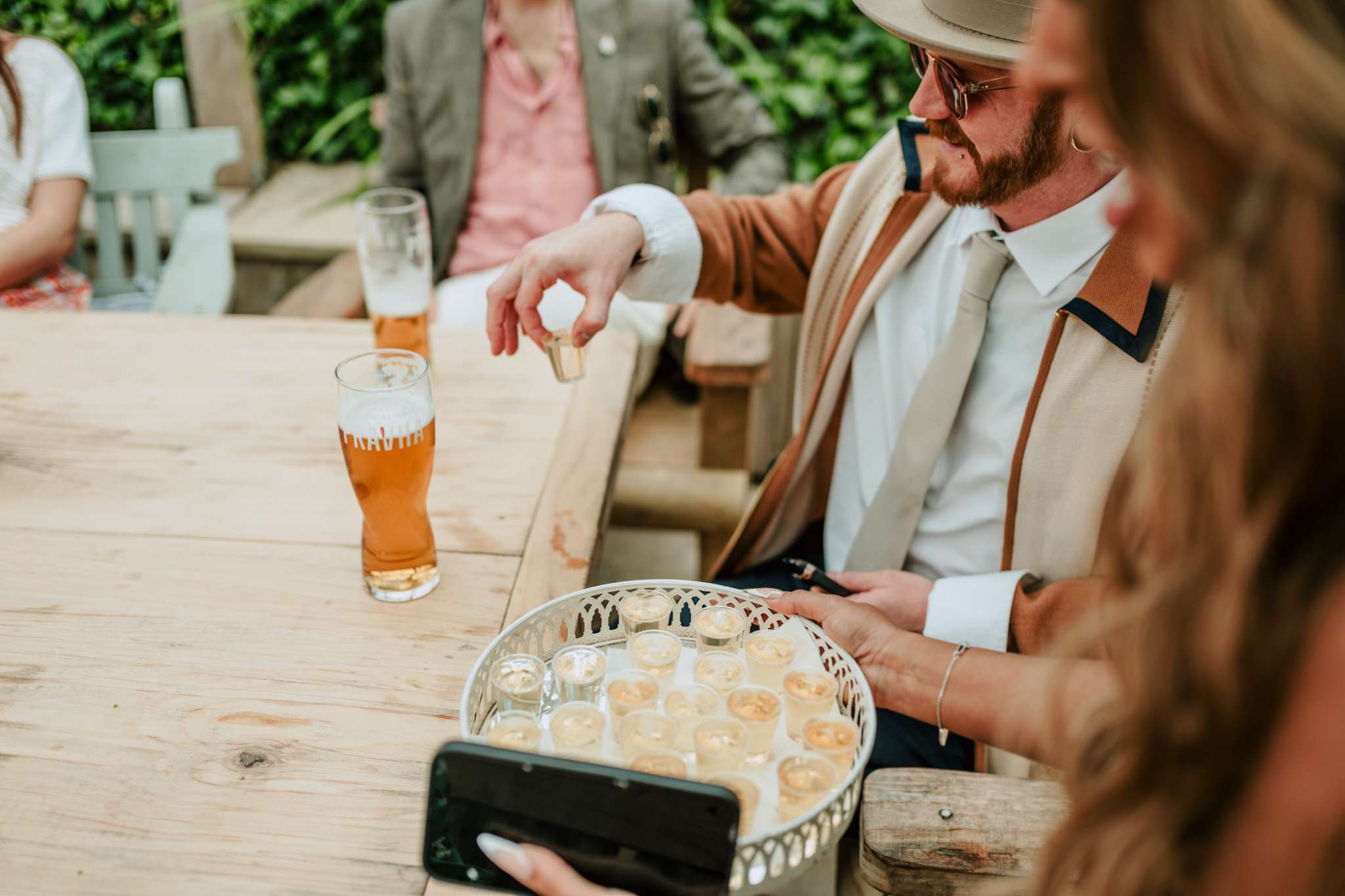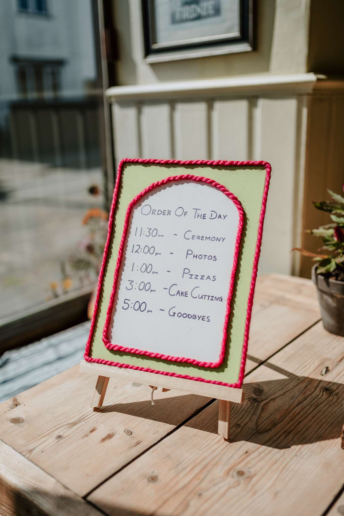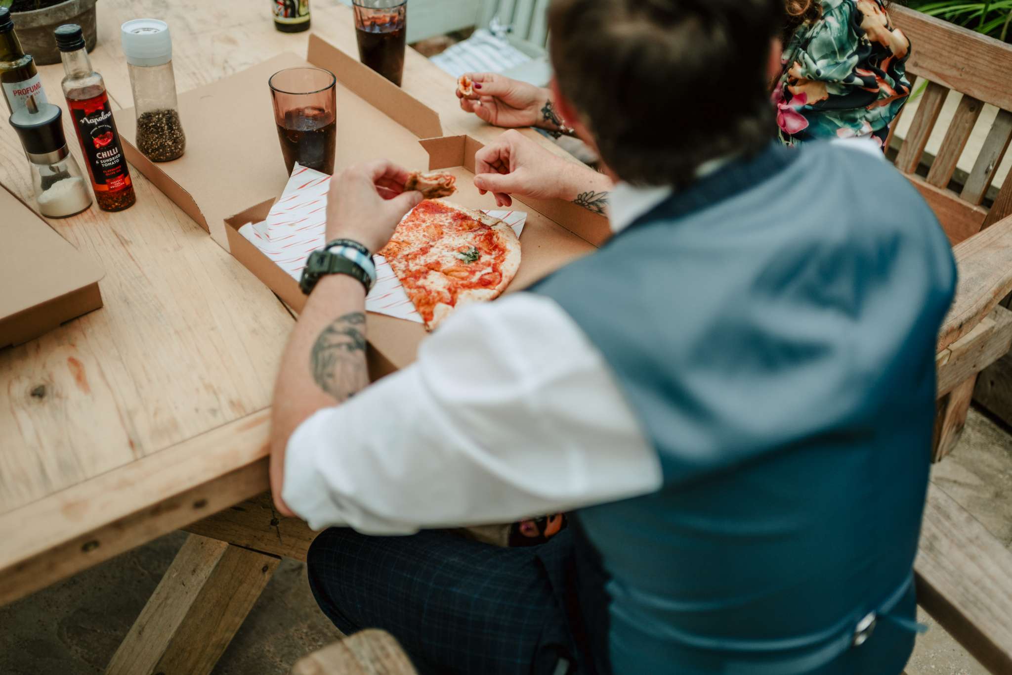 They also skipped the bridal party, stag and hen dos, and all the traditional structure that didn’t fit them. There was no seating plan or formal meal – just pizza boxes with each guest’s name so they could eat, and tequila for the toasts. Their friend Sacha officiated the ceremony, keeping it short, personal and relaxed.