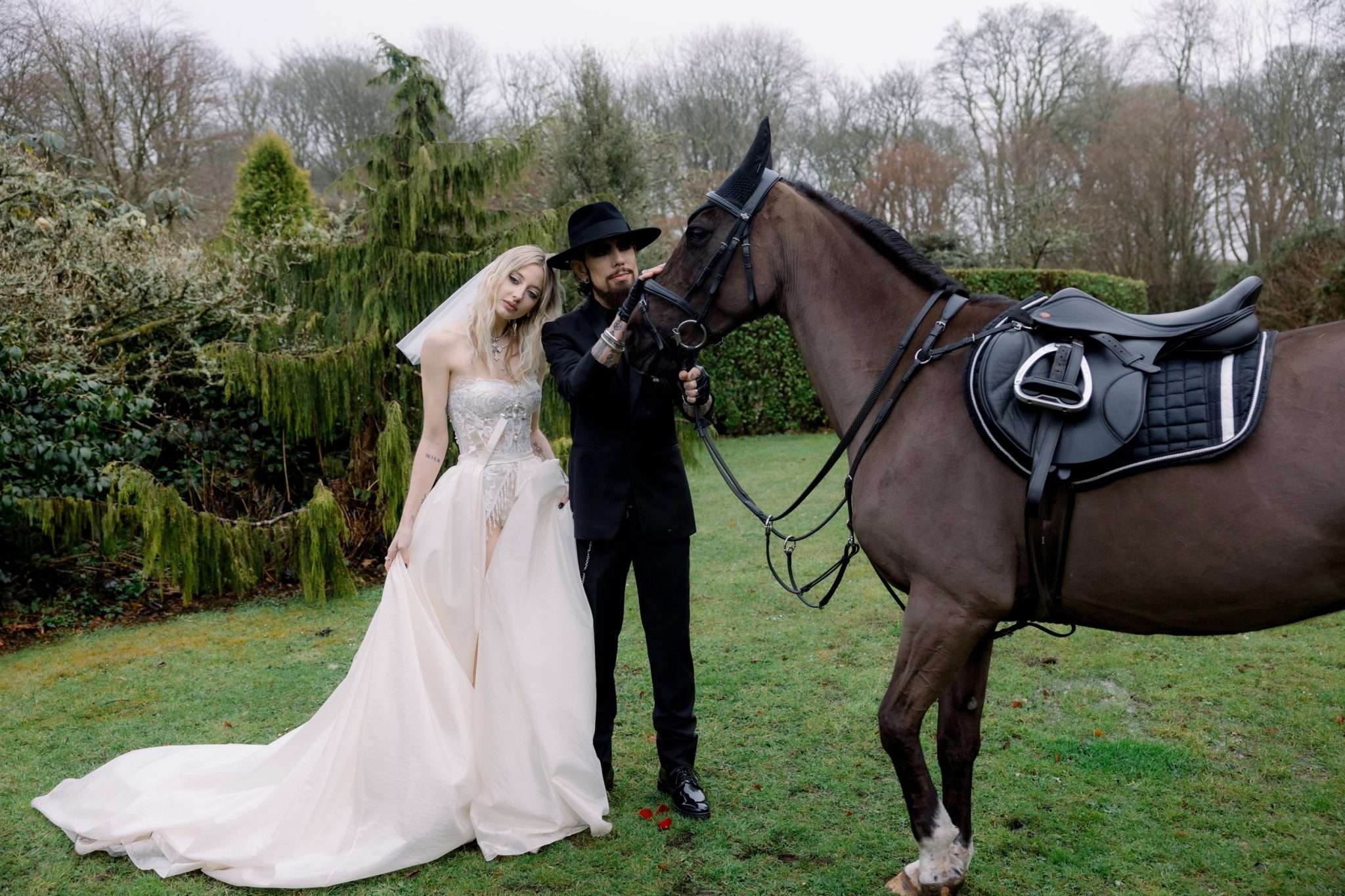Dave and Vanessa, who met eight years ago after Dave reached out after seeing her in a movie trailer, hosted a multi-day celebration at Dunskey Estate in Stranraer, Scotland. The Edwardian castle, surrounded by woodland and overlooking the sea, perfectly set the scene for a darkly romantic, gothic-inspired wedding.