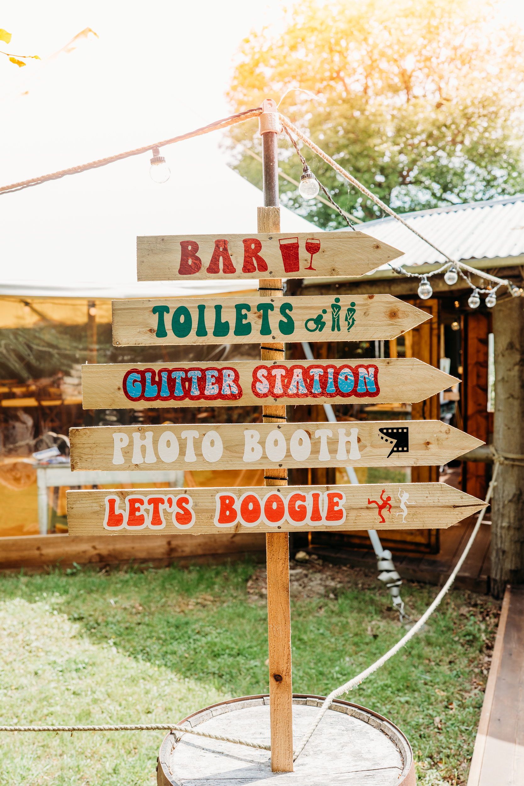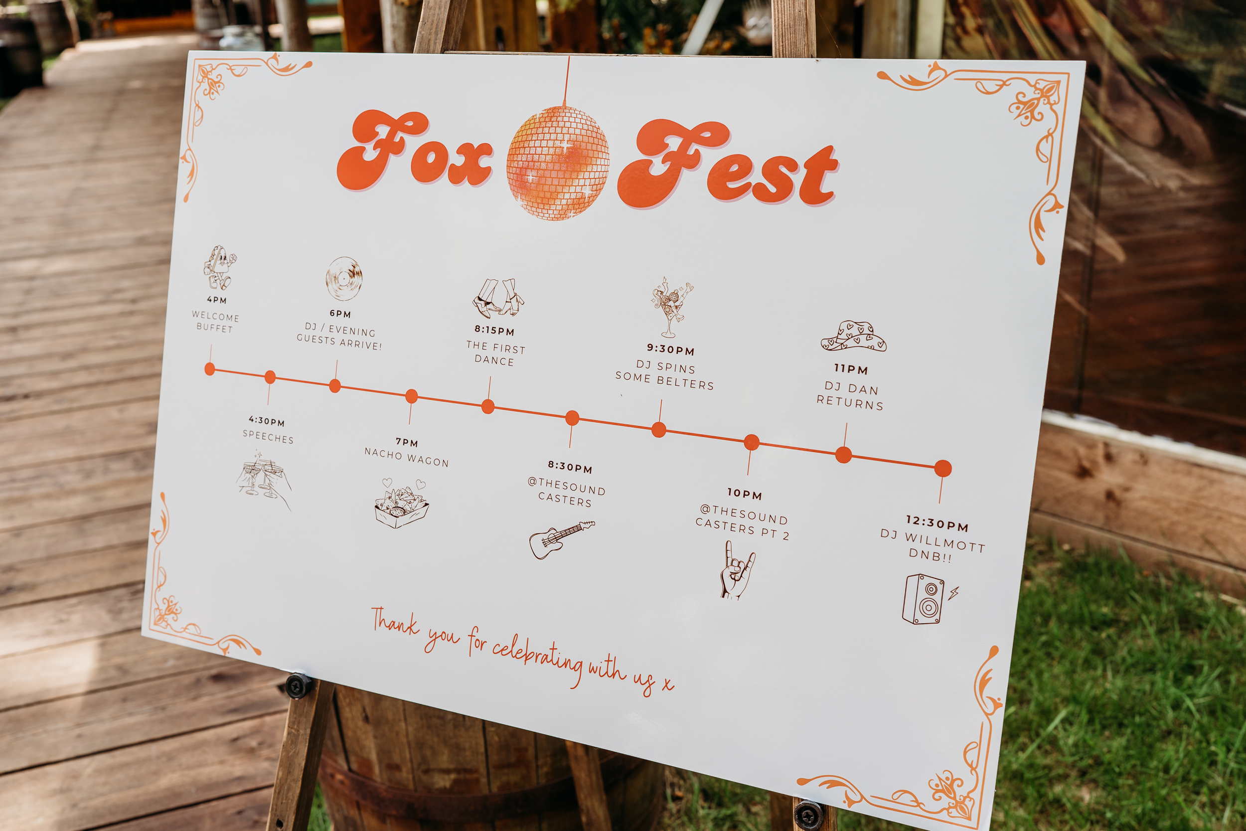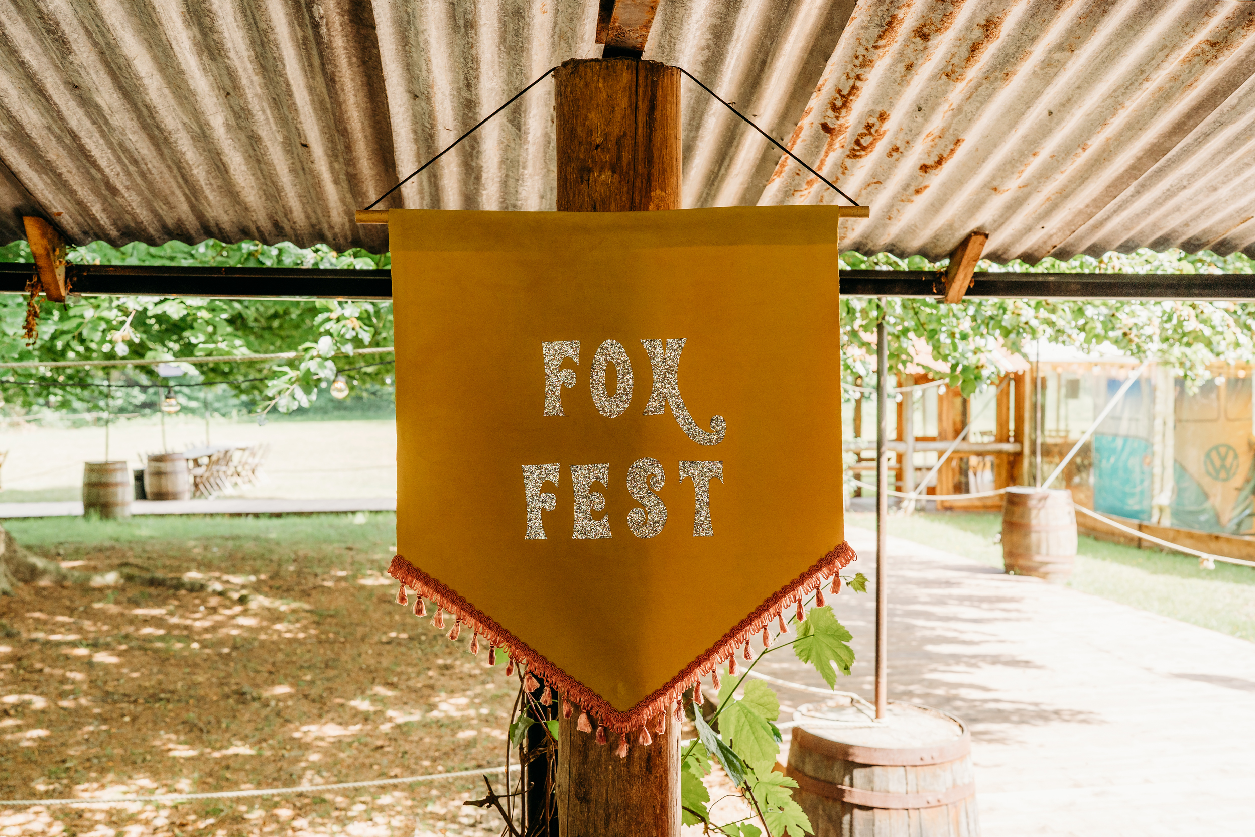 Their families pulled together to bring Fox Fest to life. Grant’s dad made the wooden signage, while Sián’s mum created all the festival signs and baked their wedding cake. Grant’s step-mum added chocolate brownie logs and trays of other sweets to the feast.