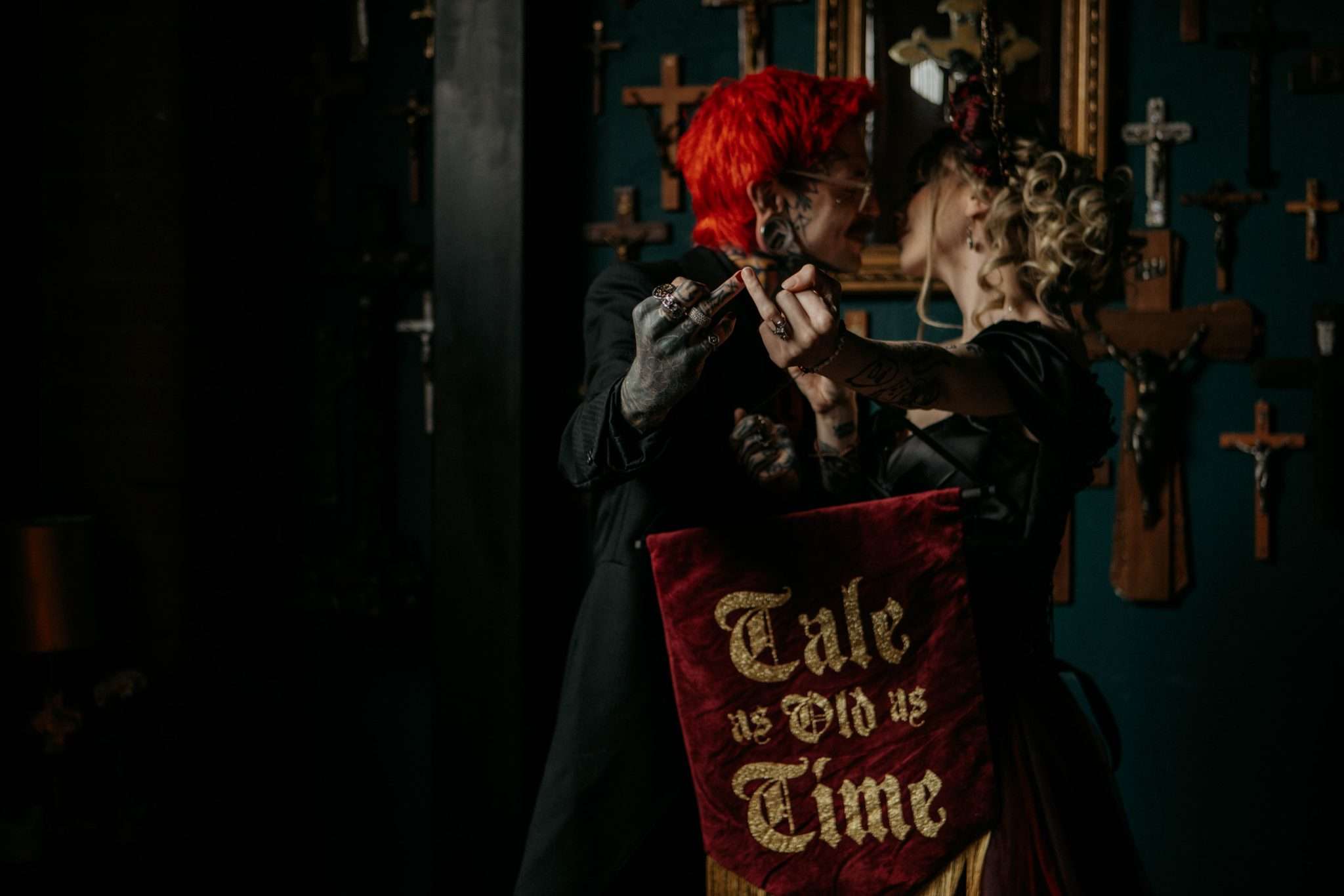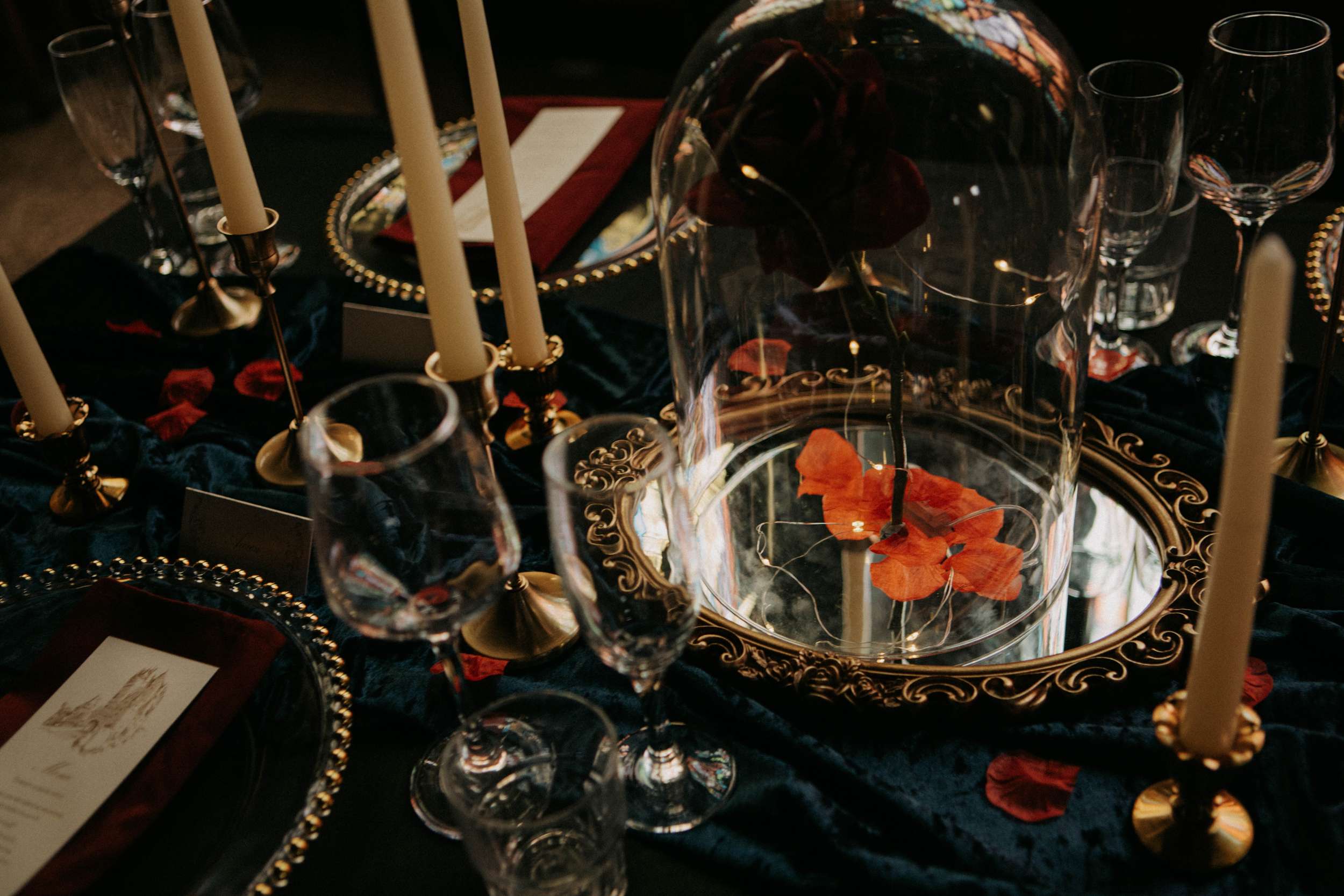 Do you love Disney but in a dark, alt way more than a girly fairytale way? Then you’re going to love this gothic-meets–Beauty and the Beast inspired wedding shoot. Although it wasn’t a real wedding, there are so many creative ideas you could steal for your own. Think: moody candlelight, corseted gowns, blood-red roses, gilded mirrors, dripping wax, and that perfectly haunting mix of romance and rebellion.