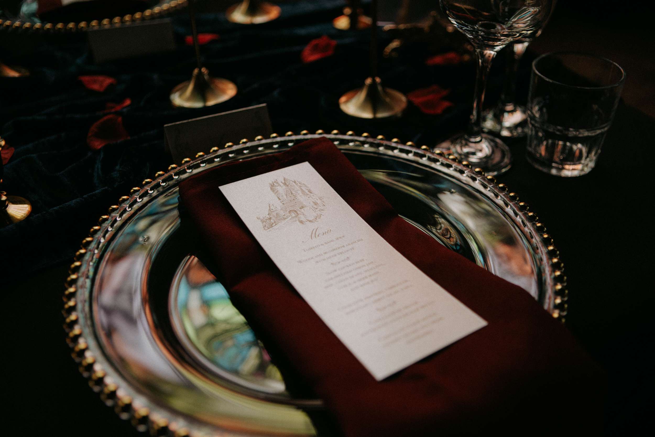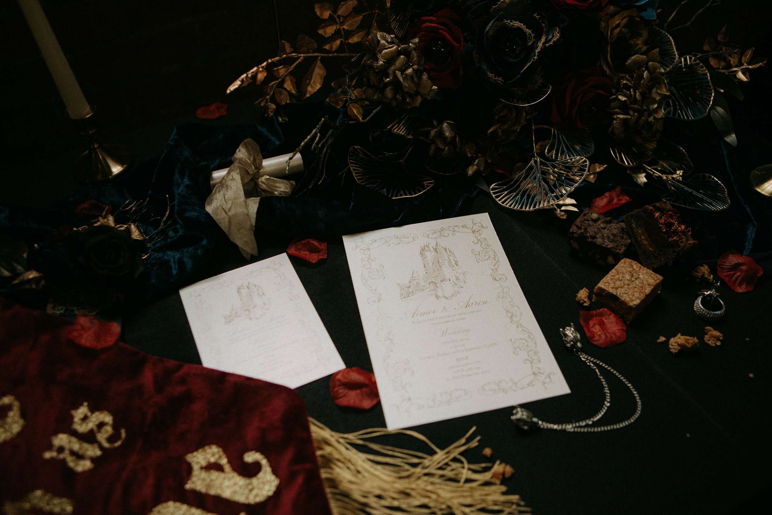 The table was drenched in candlelight and dark florals, the fashion leaned toward baroque silhouettes, and every detail felt intentionally imperfect. She explained, “We wanted to capture that balance of dark romance and timeless elegance, rich textures, moody tones, and a sense of enchantment that feels both ethereal and dramatic. The goal was to celebrate beauty in a way that feels bold, alternative, and deeply romantic, while staying true to the magic of a storybook setting.”