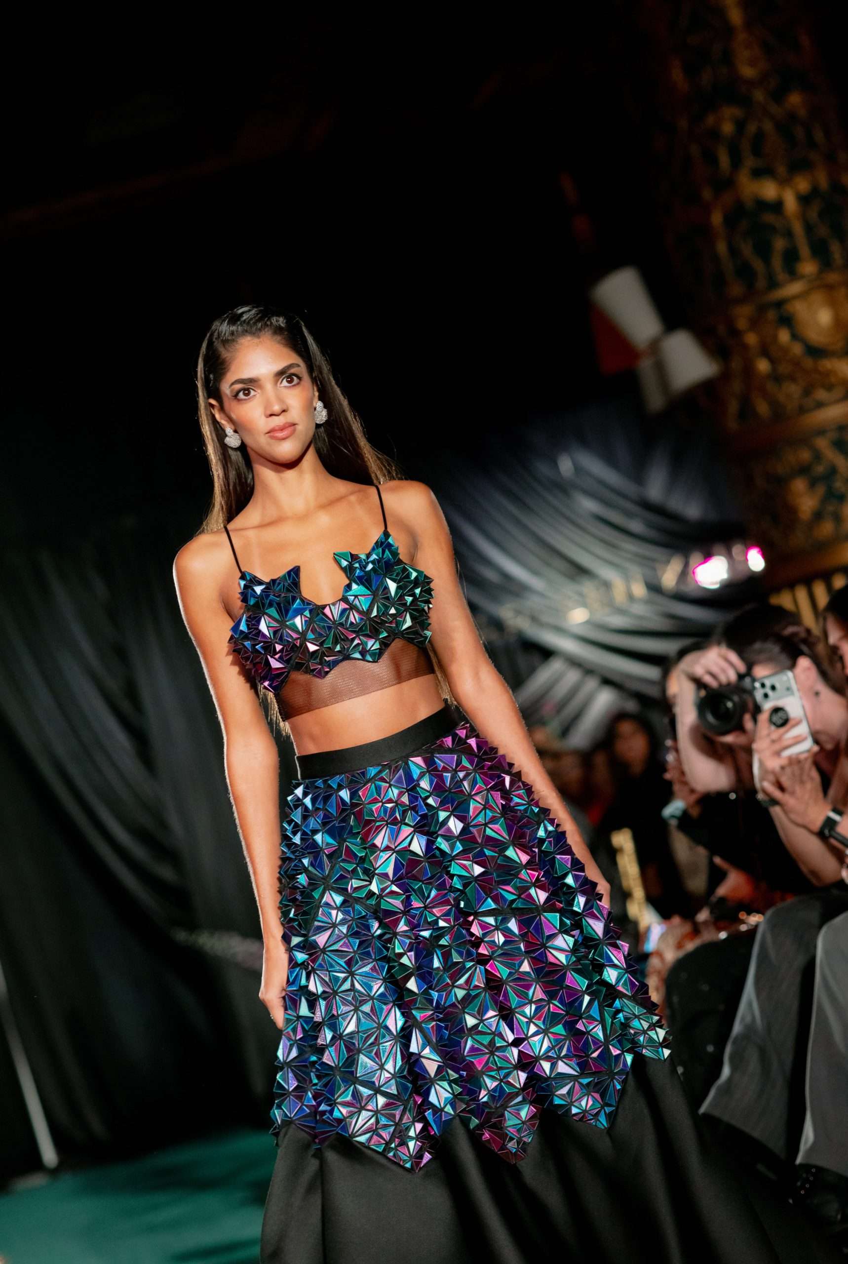 Harleen Kaur’s 2026 collection also embraced this vibrancy, blending cultural influence, sustainability, and artistry in equal measure. Kaur celebrated florals in all their stages – organic, sculptural, and futuristic. Her designs glowed with psychedelic wavy motifs, fluid metallics, and iridescent shimmer. But what really stood out was her material innovation: 3D-printed fabrics made from bio-based materials, beads recycled from glass bottles, sequins spun from recycled twill. Rooted in her Punjabi, Thai, and American heritage.