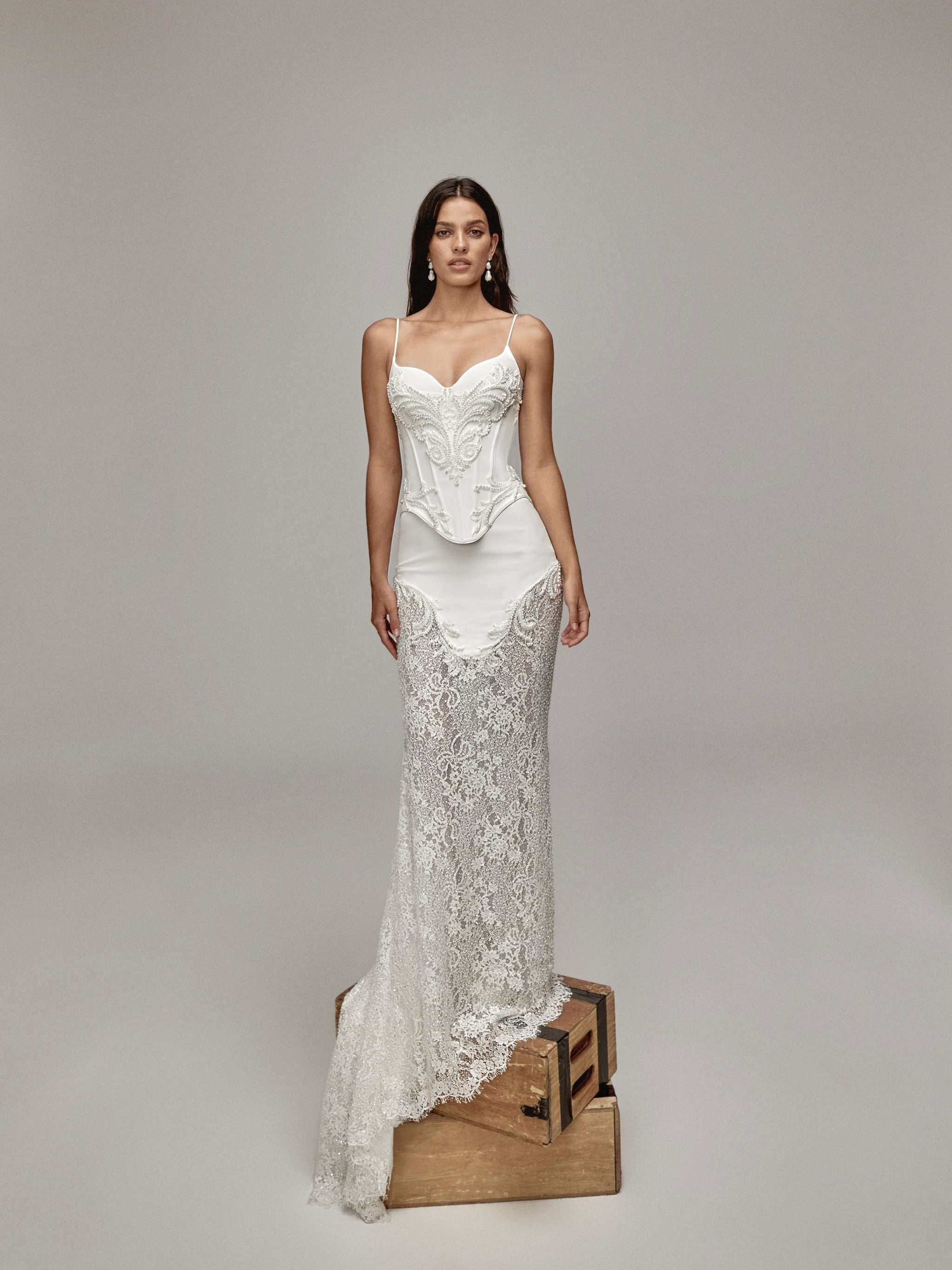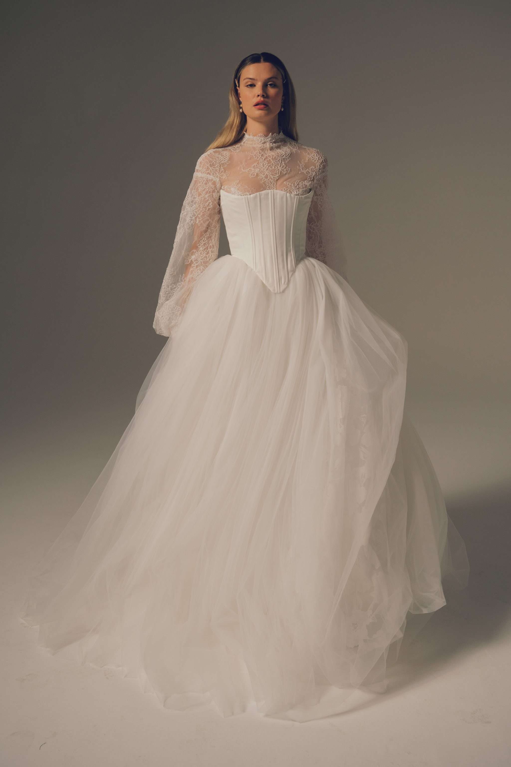 The corset has been a mainstay in bridal for a few seasons now and it doesn’t seem to be going anywhere for 2026. Hayley Paige’s “coquette corsetry” met Milla Nova’s Grace Kelly glamour, while WONÁ Concept played with contrast – cage corsetry and lace alongside mint silk chiffon – proving that structure and softness can coexist beautifully.