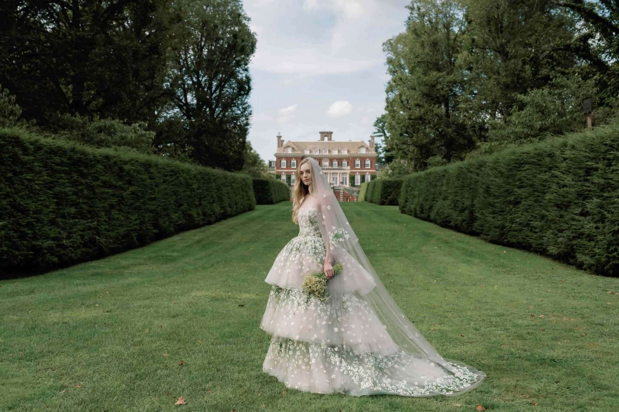 Sareh Nouri layered soft green and nude tulle over daisies in her Once Upon a Garden collection, turning nature itself into couture. The Edelweiss gown was a particular standout, a design layered with soft nude and green tulle drifting over delicate daisies inspired by the beloved song from The Sound of Music.