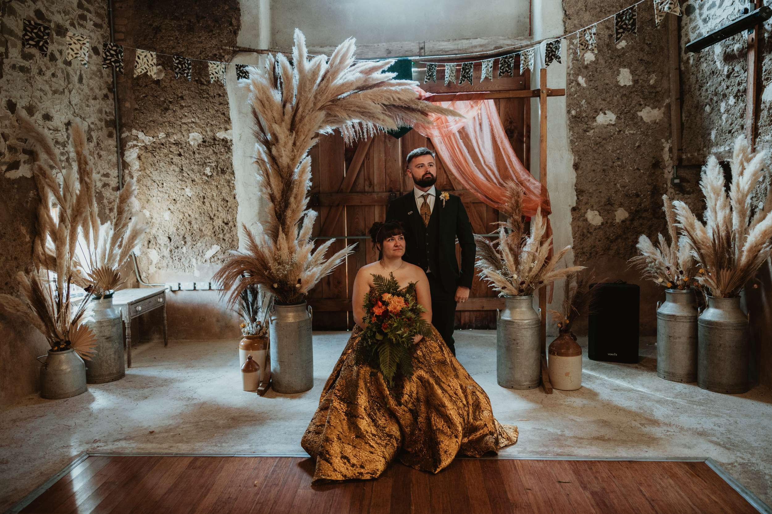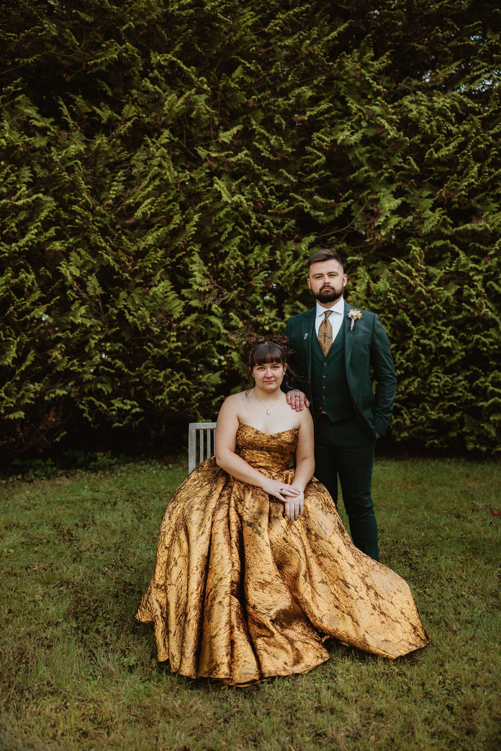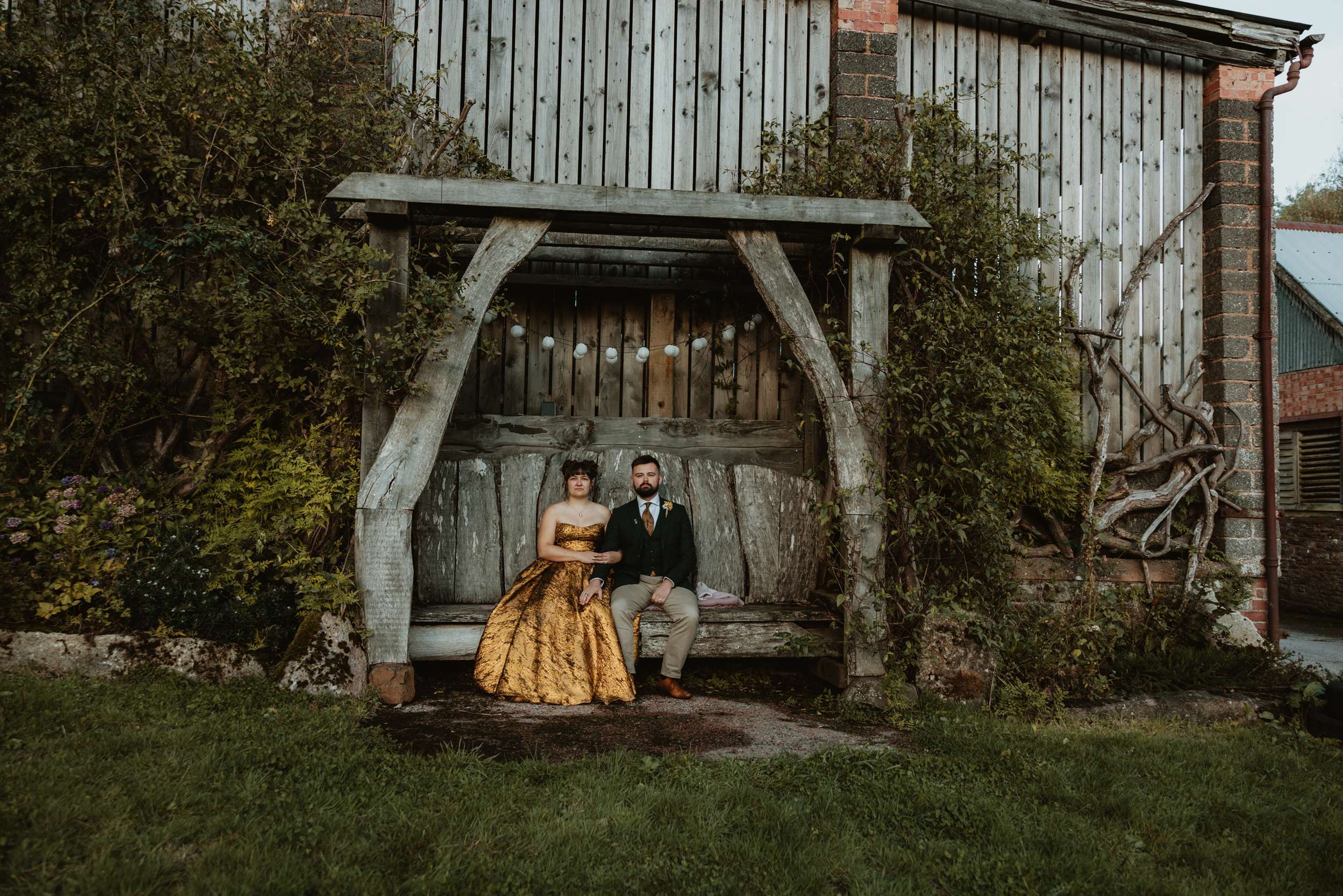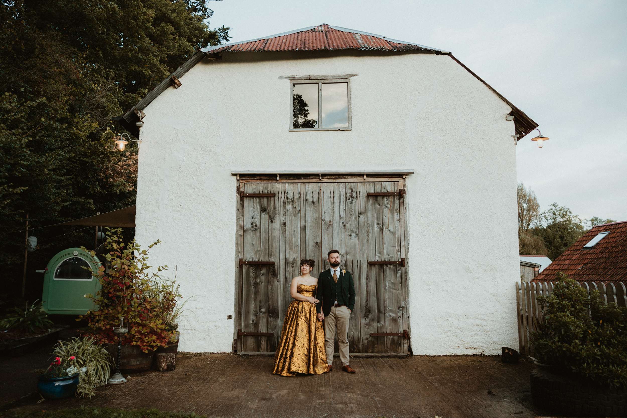 Looking back, Em says the hardest part of wedding planning was finding a colourful dress to try in person. “I would have loved more options in the South West to be able to try on non-traditional dresses in person. The lack of size options for samples and the staff not making me feel confident in the dresses I did try made it harder than it needed to be.” In the end, she bought her gold Teuta Matoshi online.