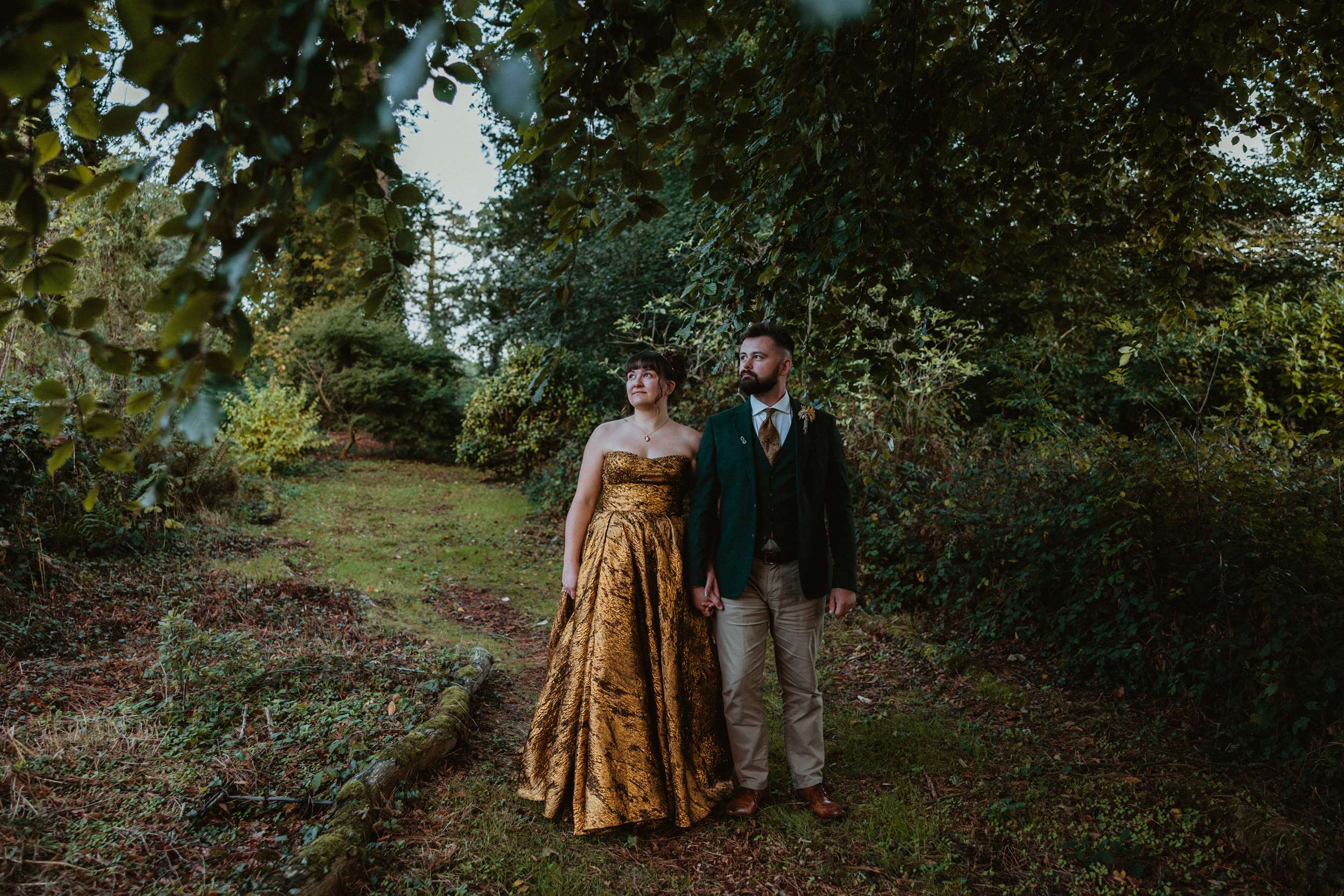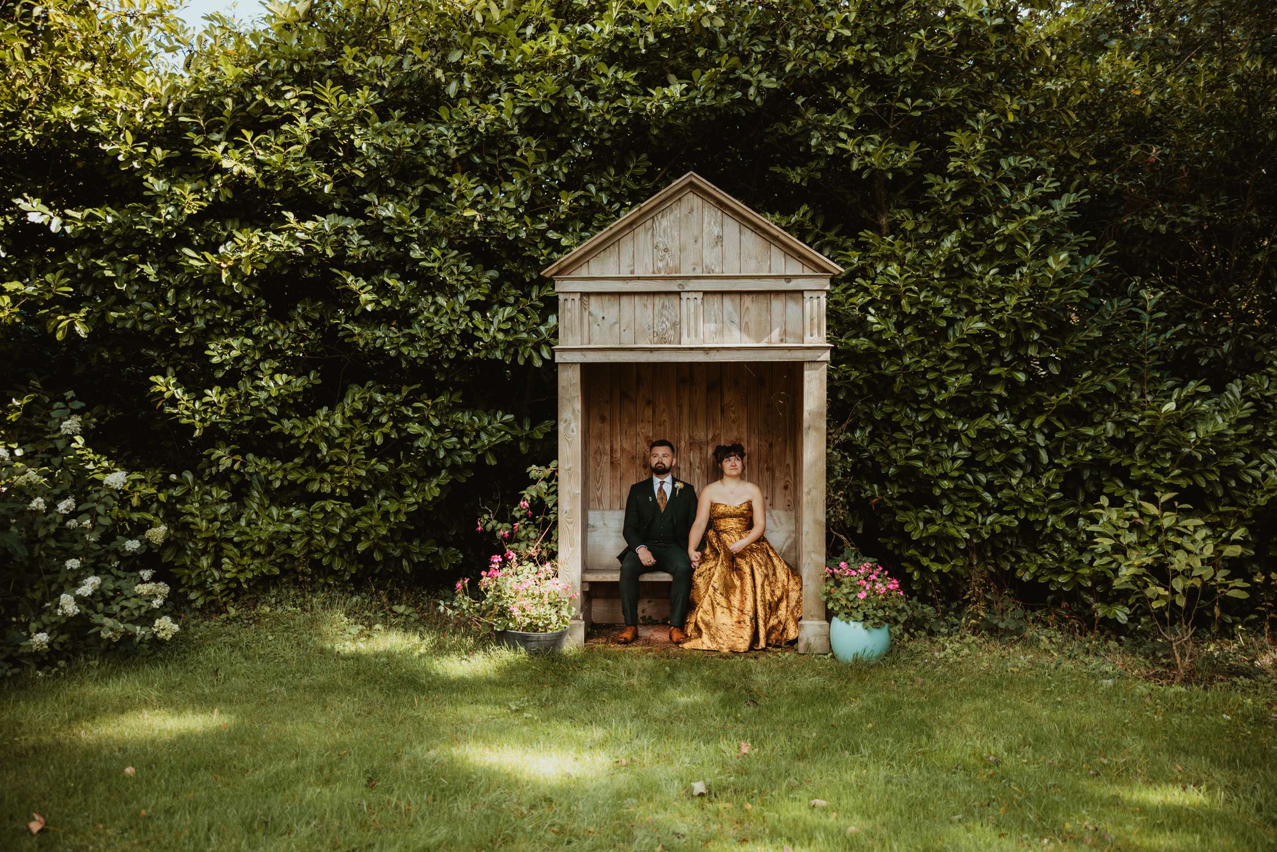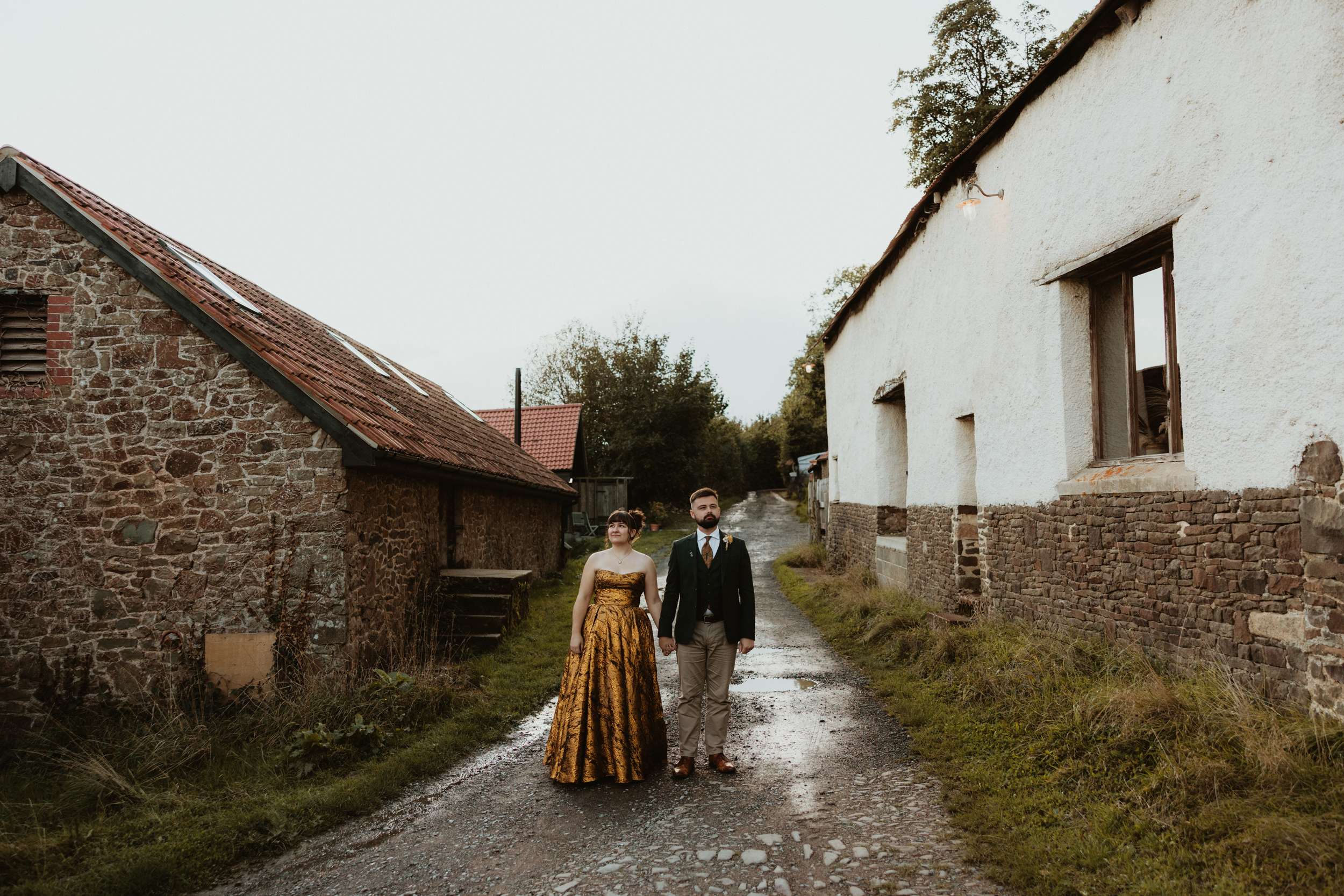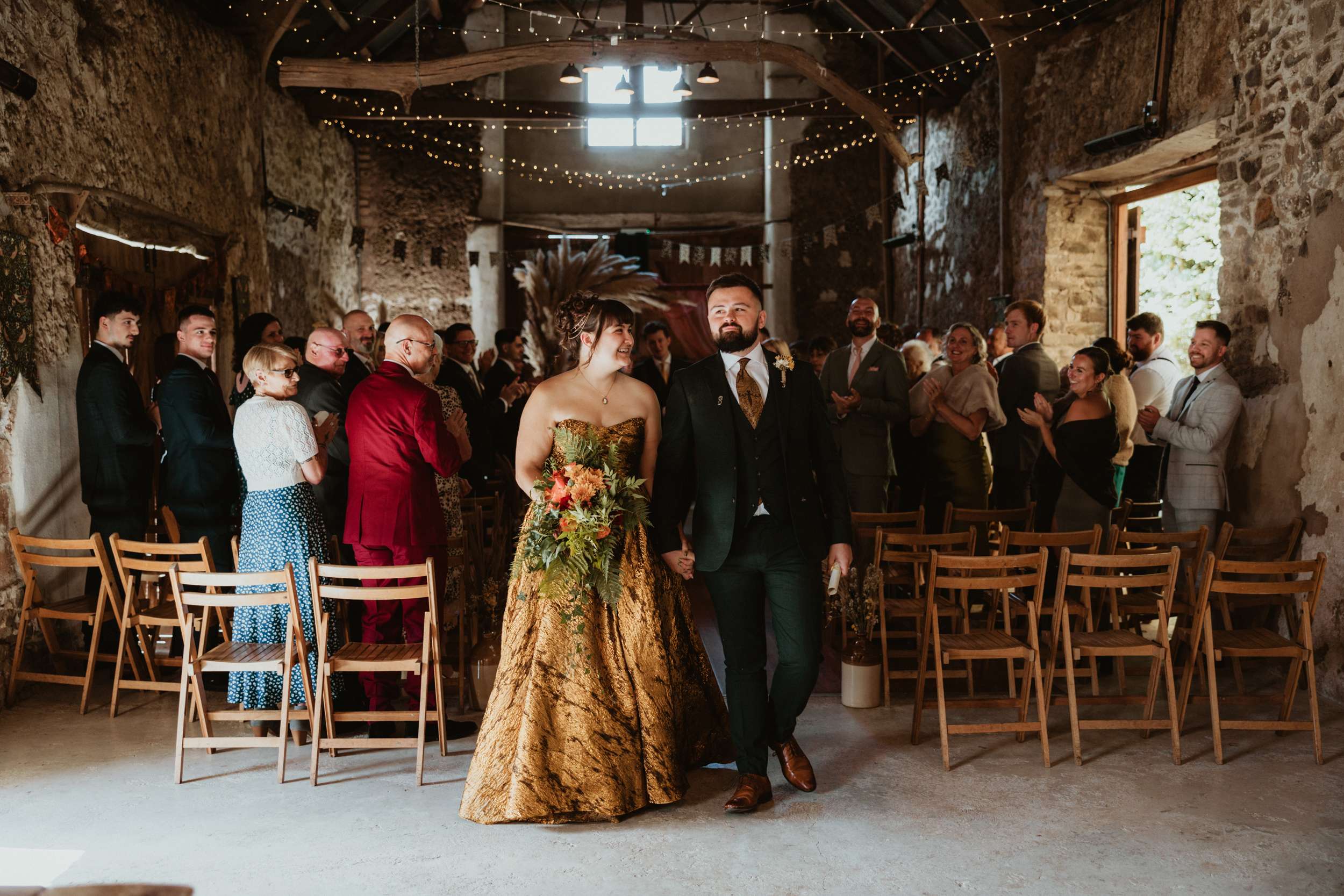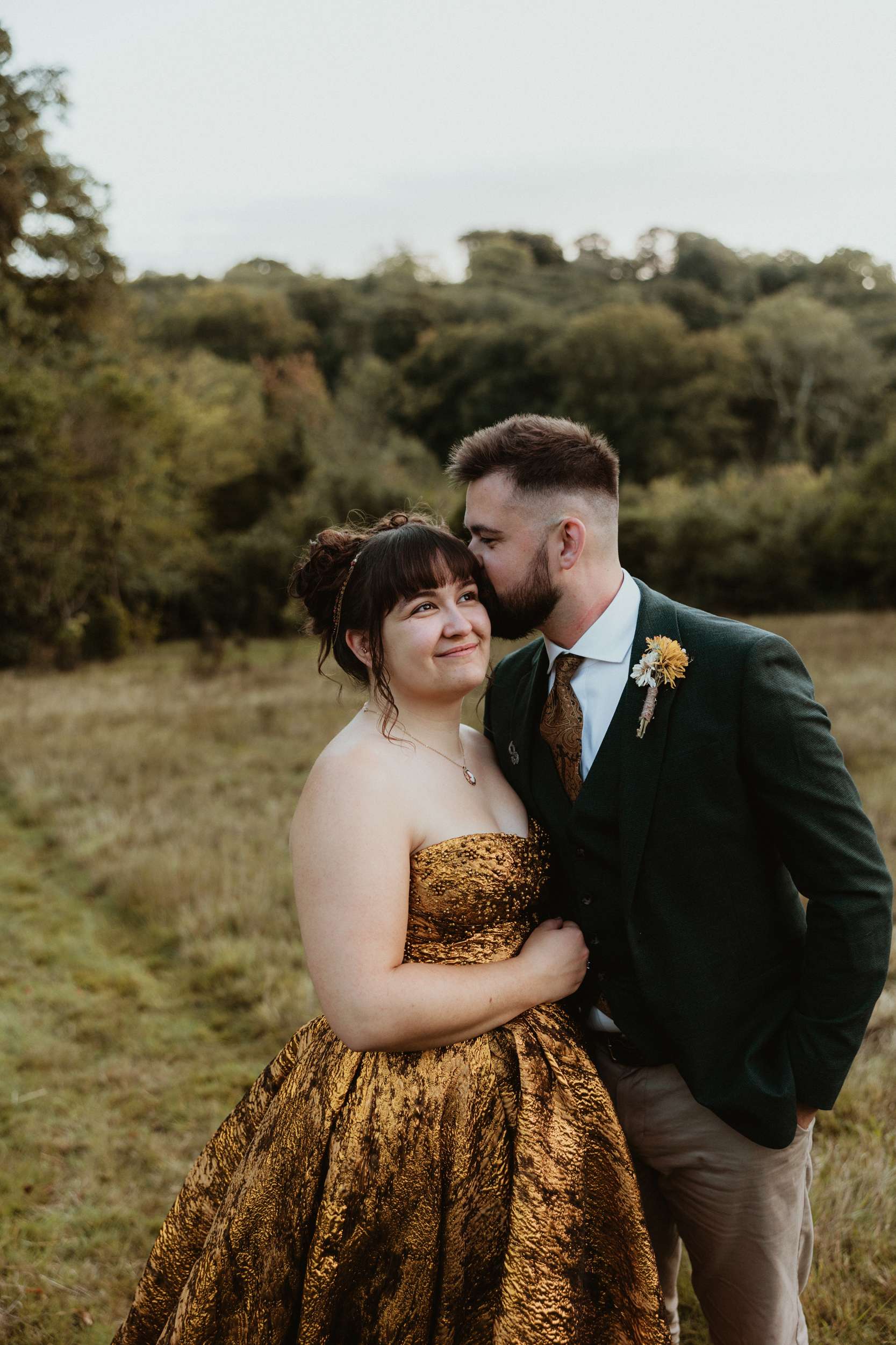Looking back, Em says the hardest part of wedding planning was finding a colourful dress to try in person. “I would have loved more options in the South West to be able to try on non-traditional dresses in person. The lack of size options for samples and the staff not making me feel confident in the dresses I did try made it harder than it needed to be.” In the end, she bought her gold Teuta Matoshi online.