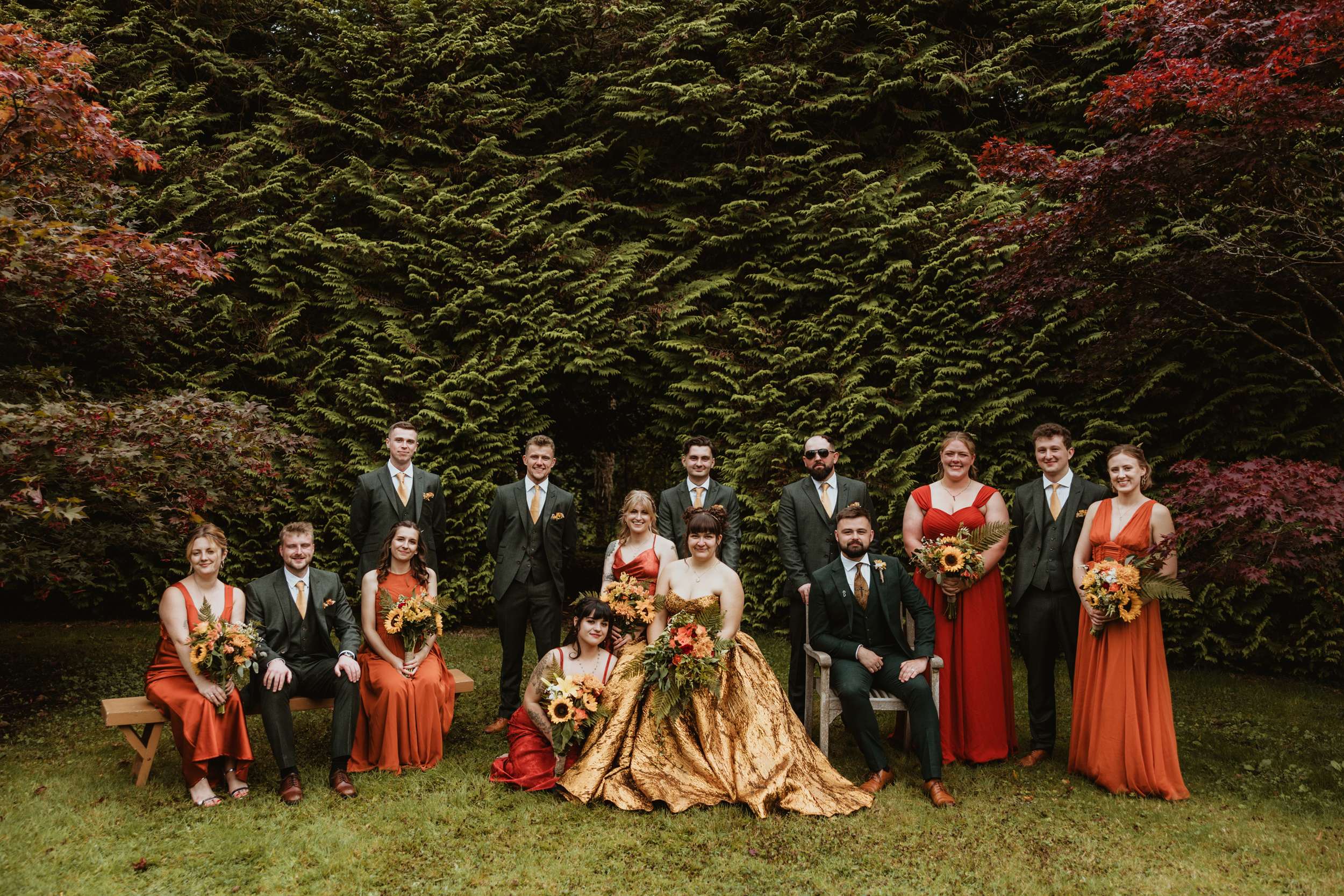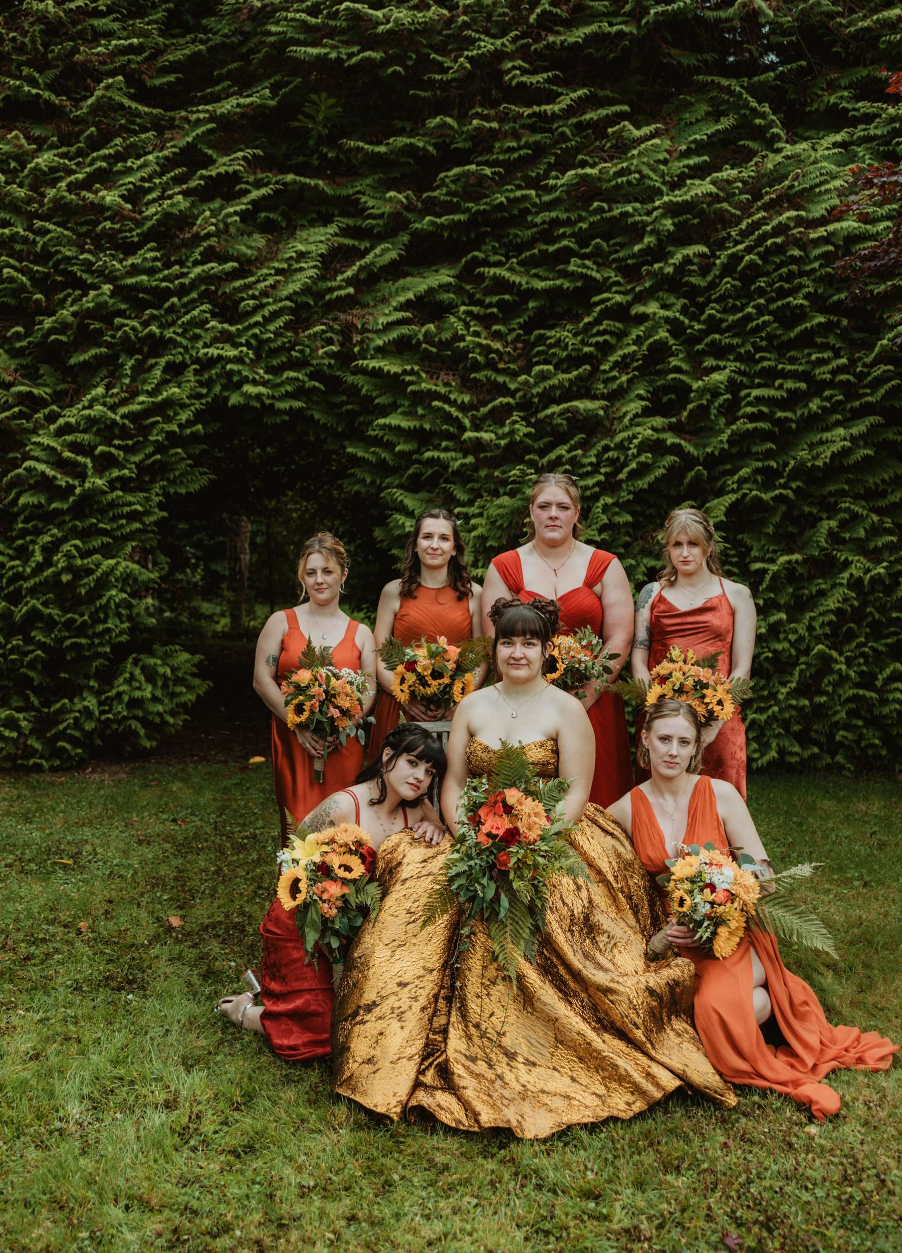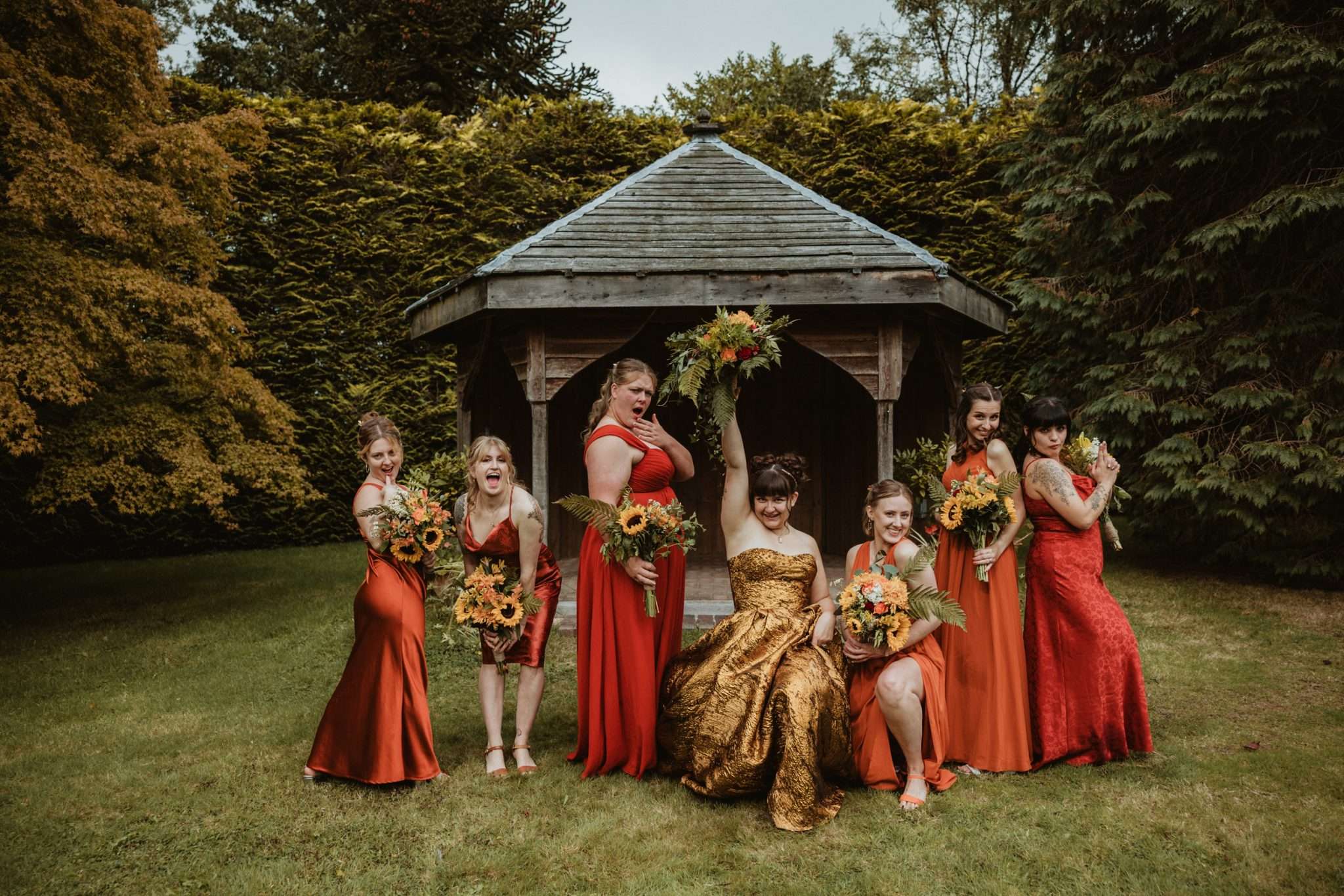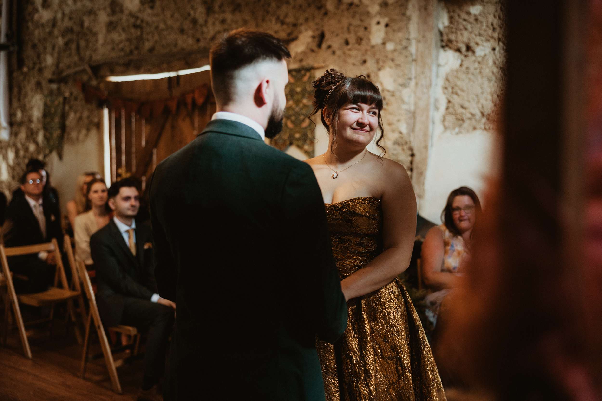 Looking back, Em says the hardest part of wedding planning was finding a colourful dress to try in person. “I would have loved more options in the South West to be able to try on non-traditional dresses in person. The lack of size options for samples and the staff not making me feel confident in the dresses I did try made it harder than it needed to be.” In the end, she bought her gold Teuta Matoshi online.