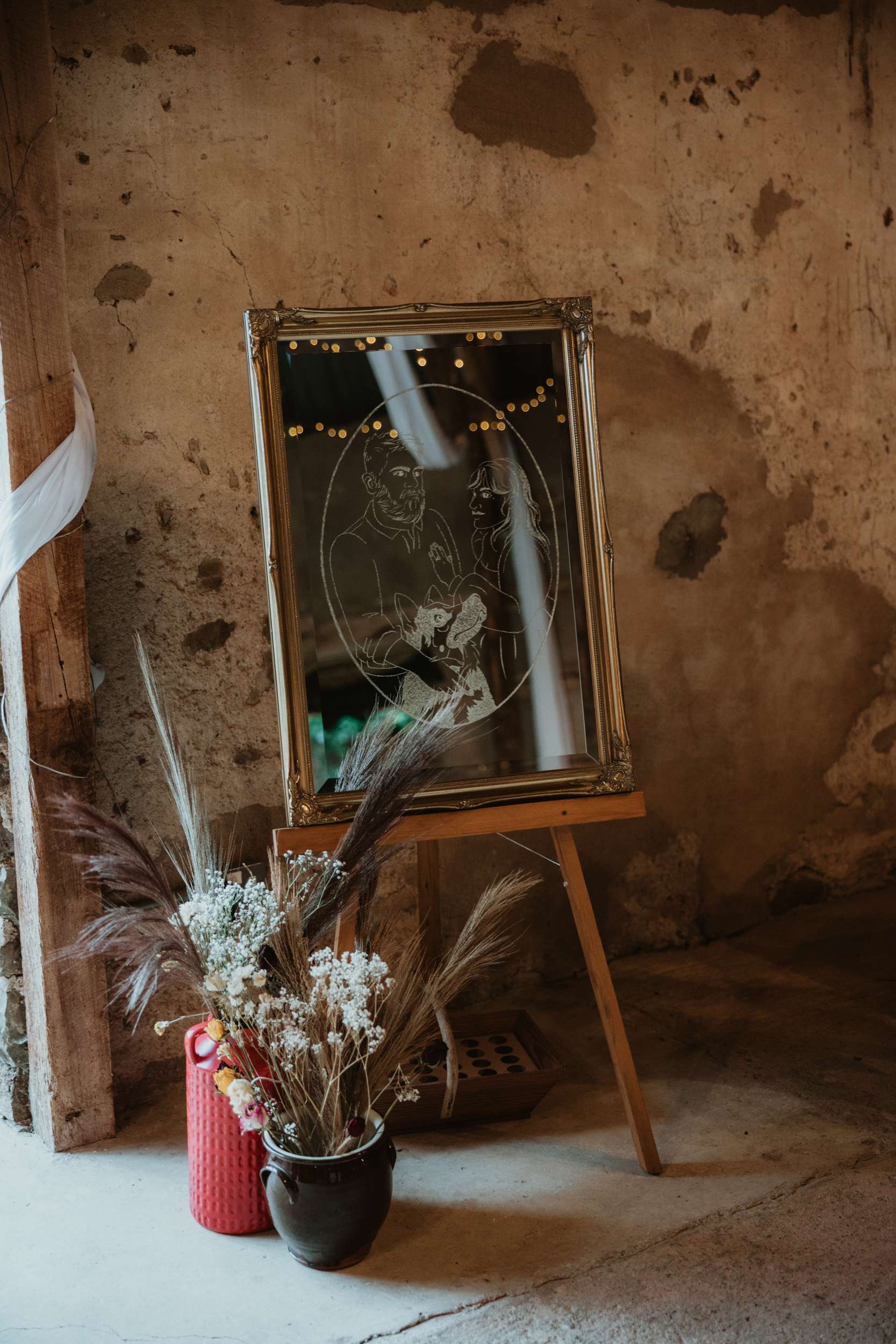 The reception was packed with handmade details. The bride’s favourite DIY project was a vintage mirror she illustrated with a family portrait and etched by hand. Her mum made bunting from thrifted fabrics, including one abandoned bridesmaid dress. They also created fabric banners featuring their German Shepherd, Winnie, who couldn’t attend. Tables were long and communal, named after Game of Thrones dragons, each represented by a metallic vinyl decal Em made and stuck to vintage books. Guests drank signature cocktails designed by their bridesmaid Jess, named after a Dungeons & Dragons character.