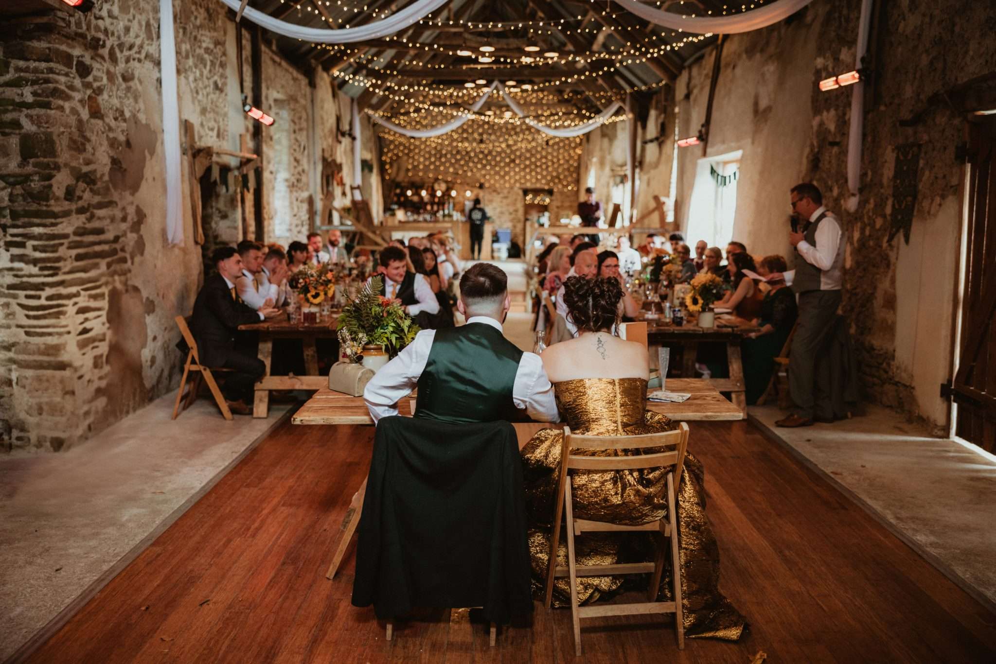 They built the day around togetherness. “We were very keen to avoid the stories we had heard about couples not seeing each other on the day,” Em continued. They planned private moments throughout, including a sweetheart table just for the two of them. Em wore gold, skipped the “something old, new, borrowed, blue” tradition, and walked down the aisle with both parents. “I don’t understand why you wouldn’t want both parents to give you away!” she said.