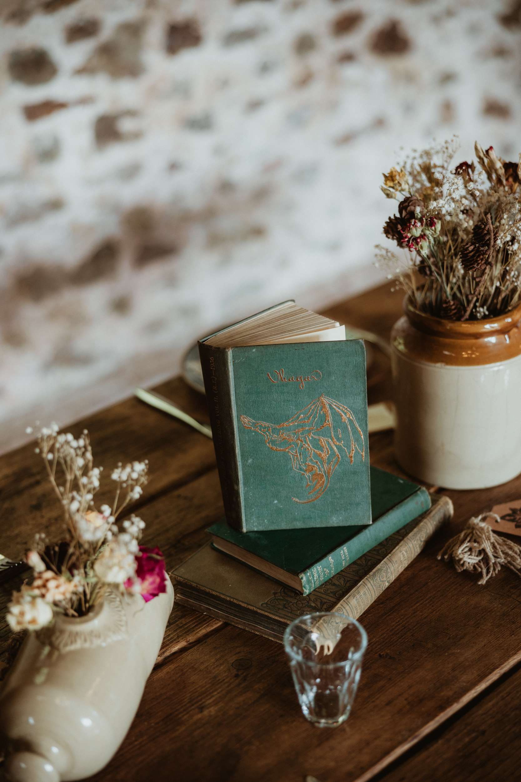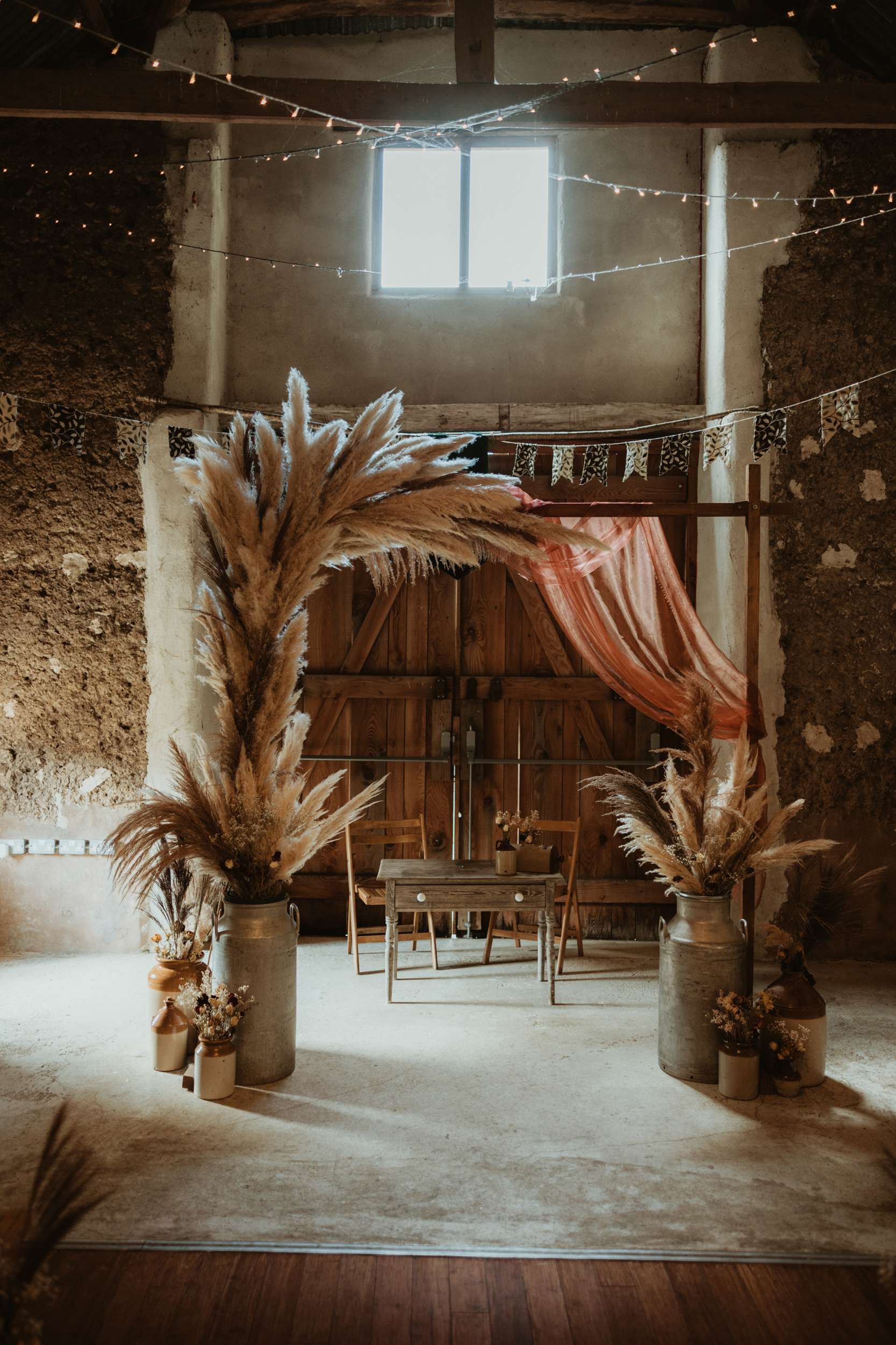 Em and George wanted their wedding to feel lived in, bathed in the Autumn light with lots of antique details. They found their perfect setting at Ashridge Great Barn in Devon, a rustic spot that already matched their aesthetic. “One of the reasons we fell in love with the venue was because they had the same stoneware jugs that we had already started thrifting from car boot sales,” said Em.