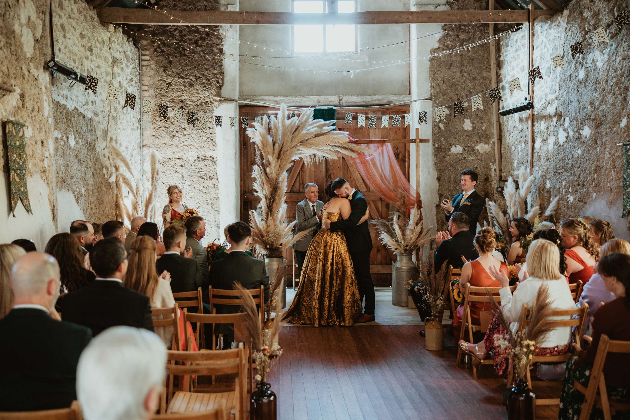 The ceremony moved indoors after a weather gamble, but the setup stayed true to their vision. Pampas grass, stoneware jugs, milk churns, and dried flowers framed the aisle. Florence and the Machine’s Dog Days Are Over played as Em and her bridesmaids entered. “I could not stop wiggling and dancing once I got to George,” she laughed. “I was told so many times after the ceremony by our guests that they’ve never seen two people so excited to get married.” Afterward, they slipped away to the Victorian garden known as the Magic Circle to exchange their personal vows in private.