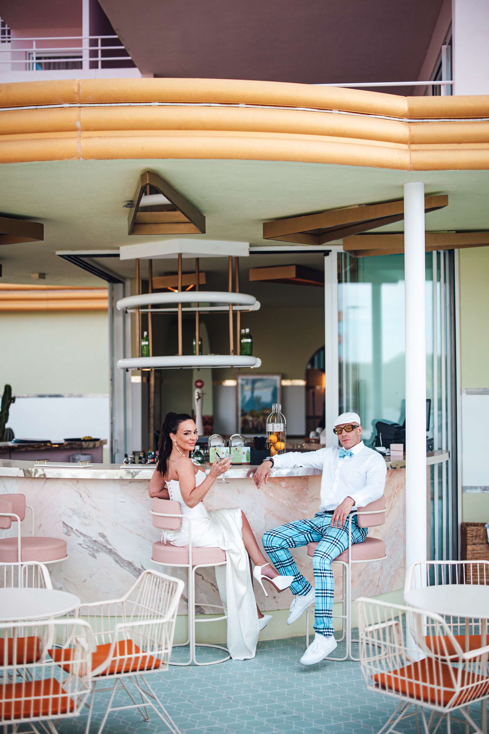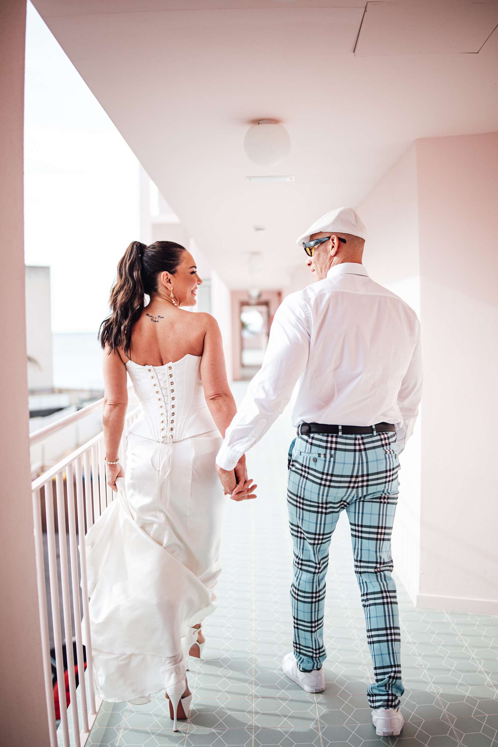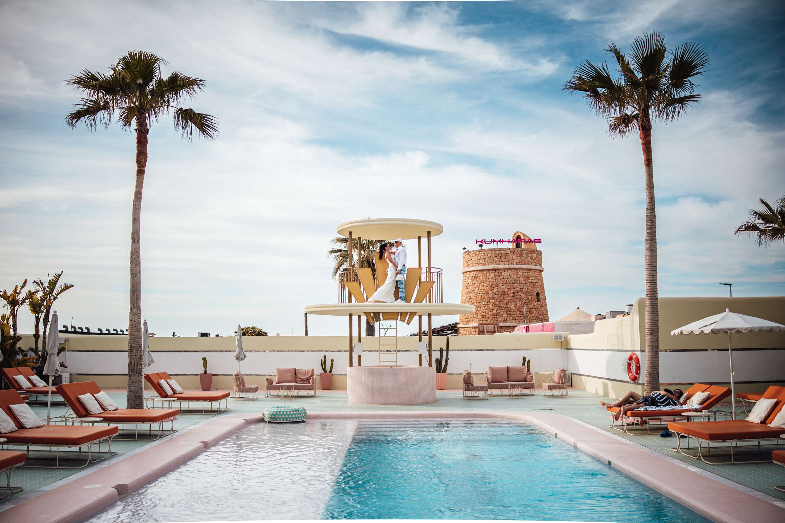 Jody and Riyston climbed a lifeguard tower in Ibiza as part of their wedding photos. Not the kind of image they might have imagined years ago, but that was the point. Their elopement was designed to be unpredictable and playful, inspired by Vegas weddings and shaped entirely around them. After Ibiza, they returned to London for a second ceremony and reception with family and friends.