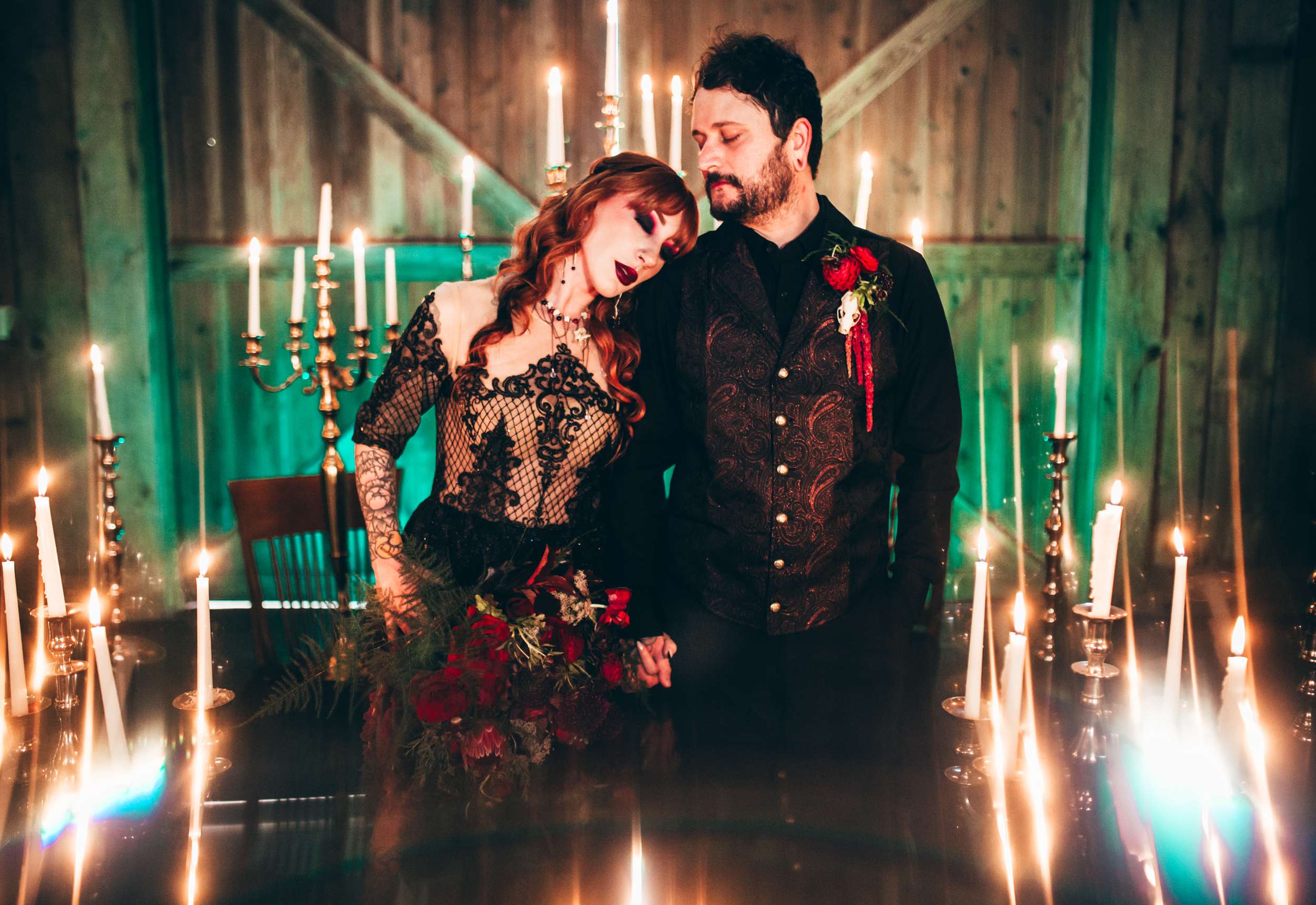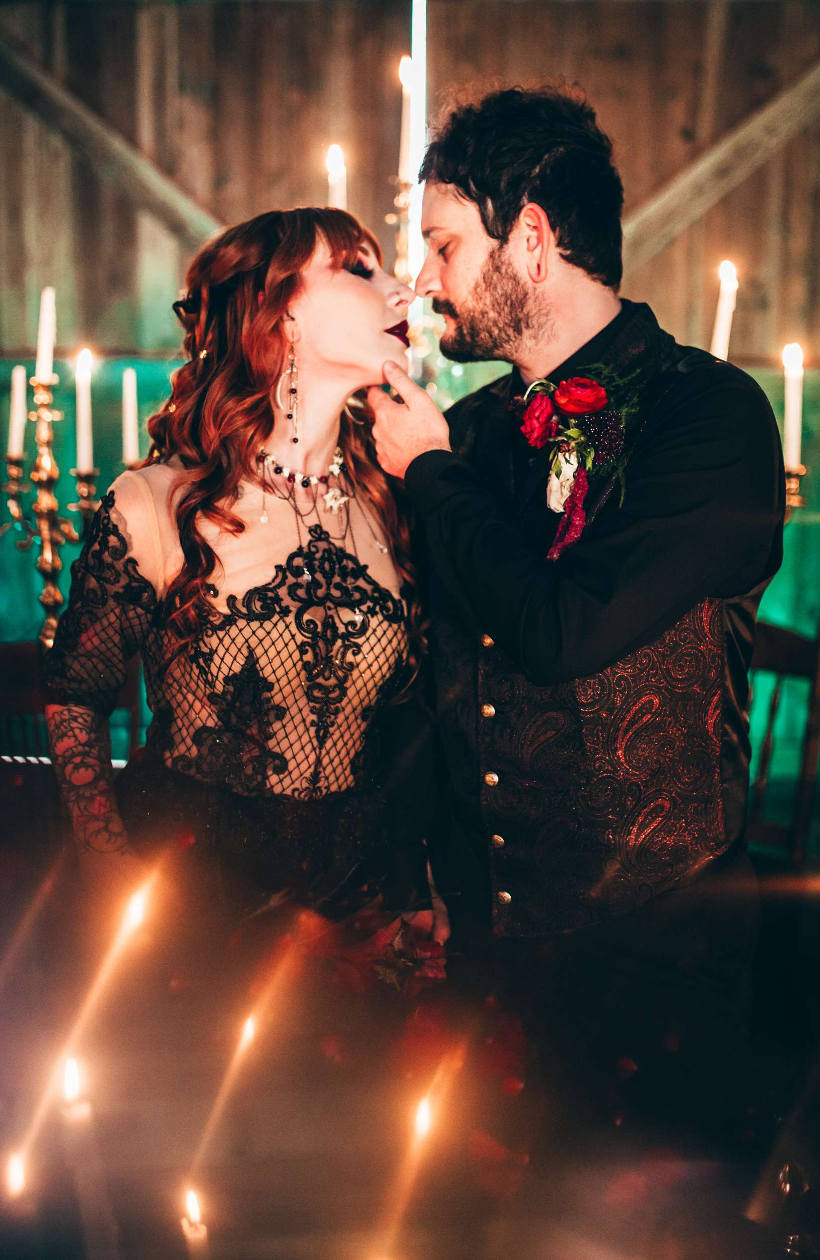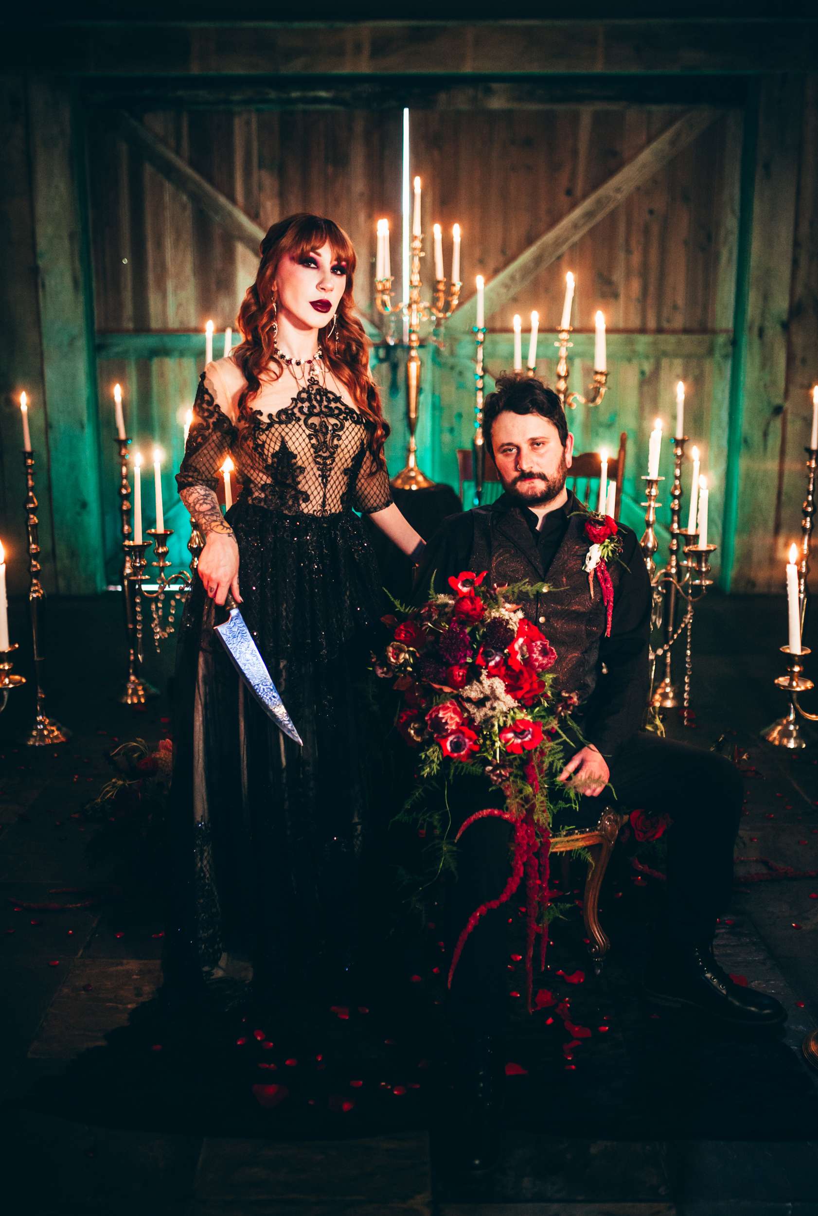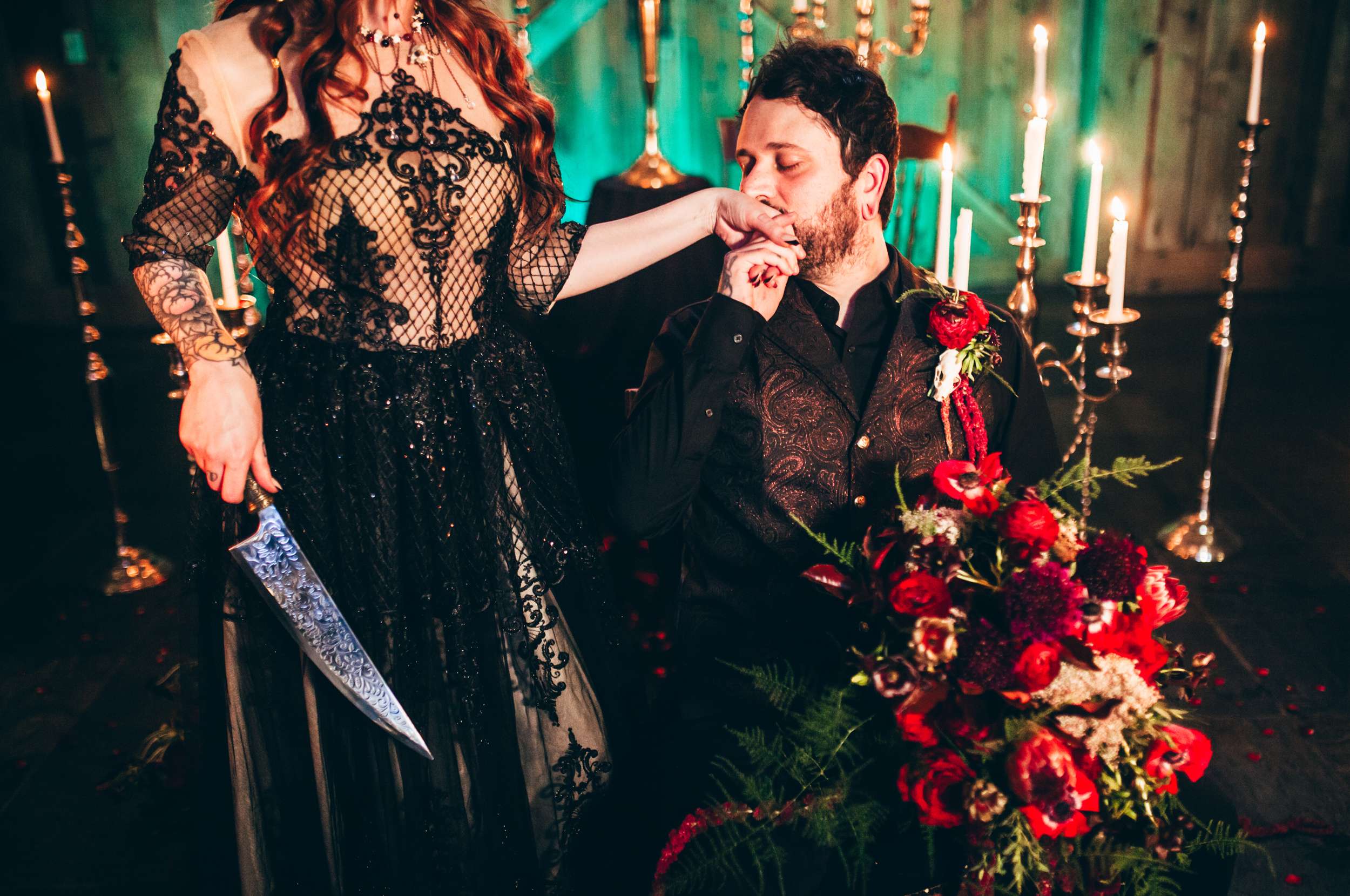 The shoot is thick with symbols. Dozens of candles surround a couple cutting a skull cake with a Vorpal Blade. “We hadn’t seen the idea done by anyone else yet,” Lauren added. “We’ve seen numerous gothic weddings or ones with a black dress, but none surrounded by numerous candles, cutting a skull cake with a Vorpal Blade, and with a whole new genre to play with.”