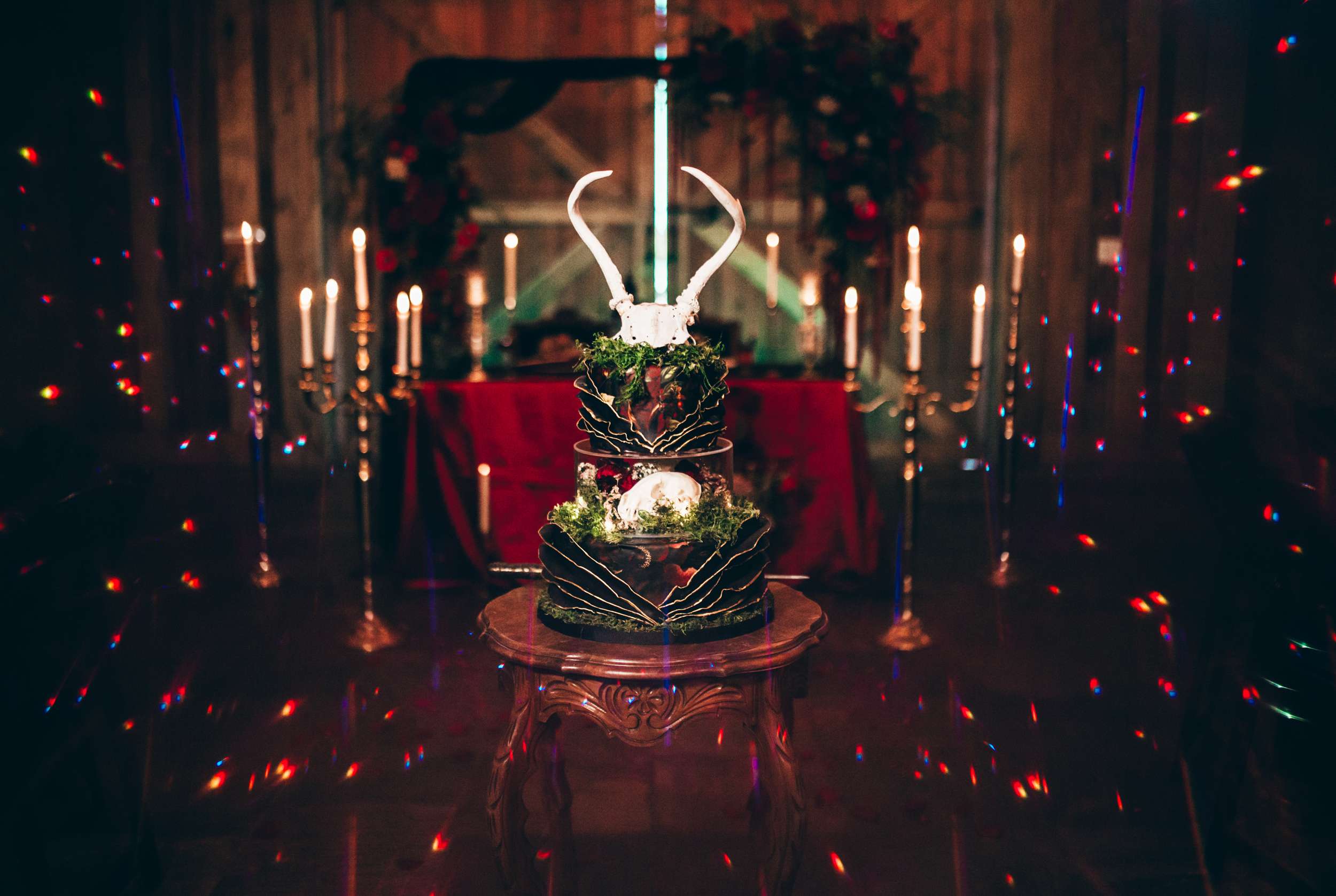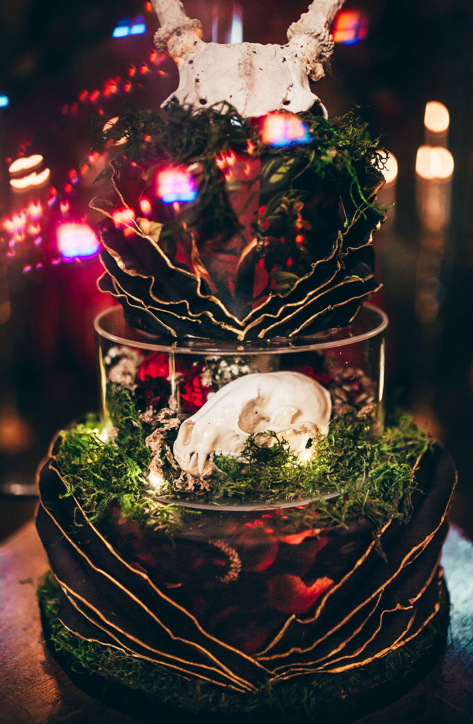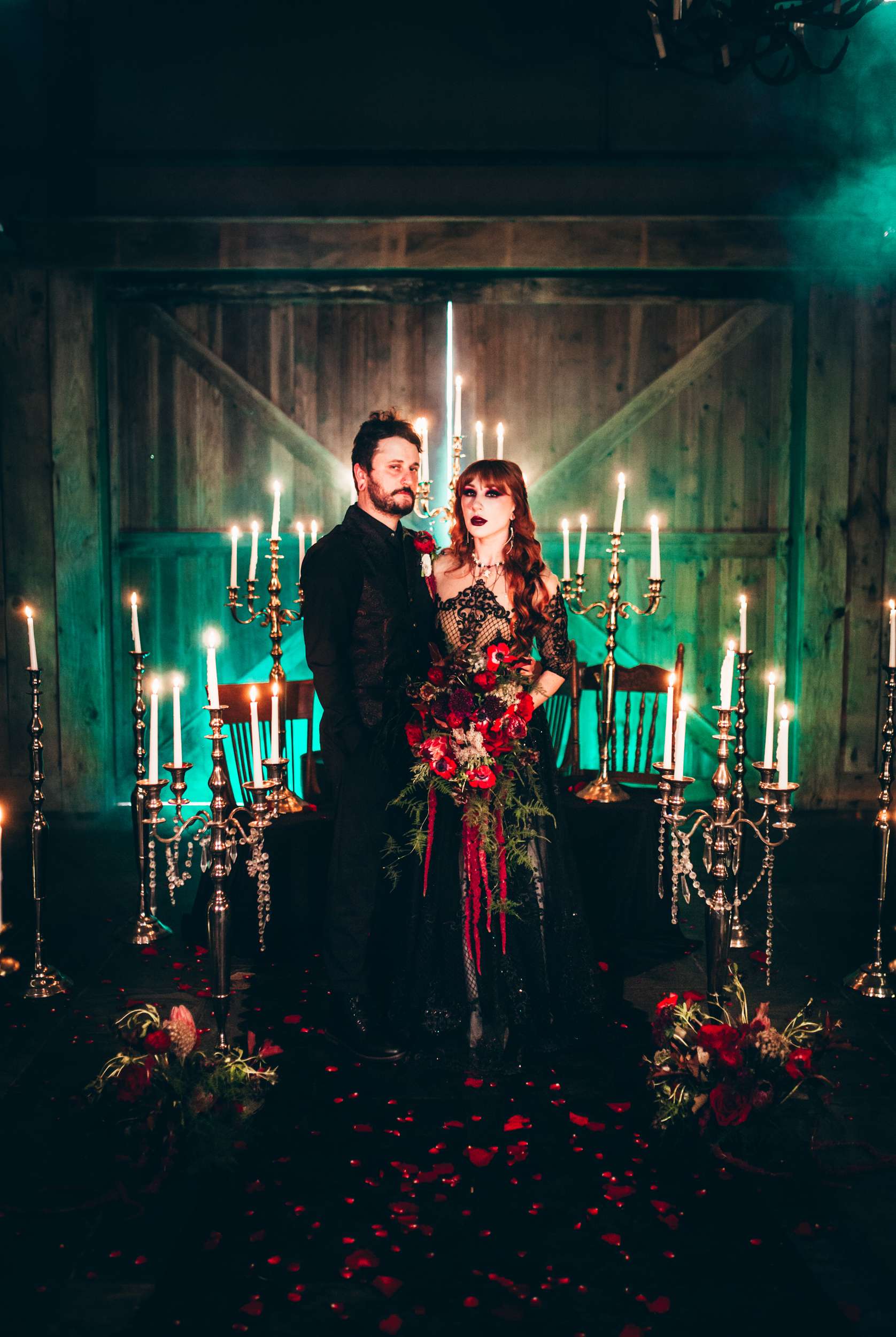 The shoot is thick with symbols. Dozens of candles surround a couple cutting a skull cake with a Vorpal Blade. “We hadn’t seen the idea done by anyone else yet,” Lauren added. “We’ve seen numerous gothic weddings or ones with a black dress, but none surrounded by numerous candles, cutting a skull cake with a Vorpal Blade, and with a whole new genre to play with.”
