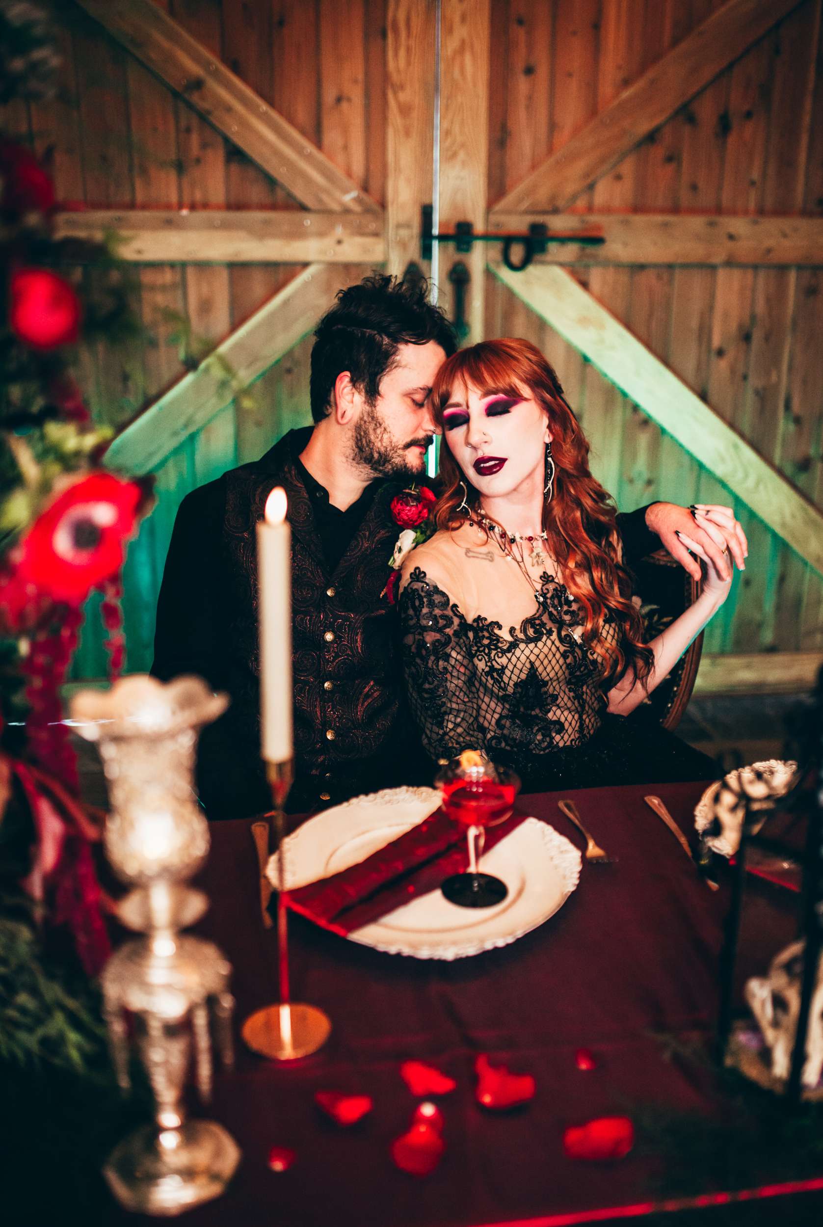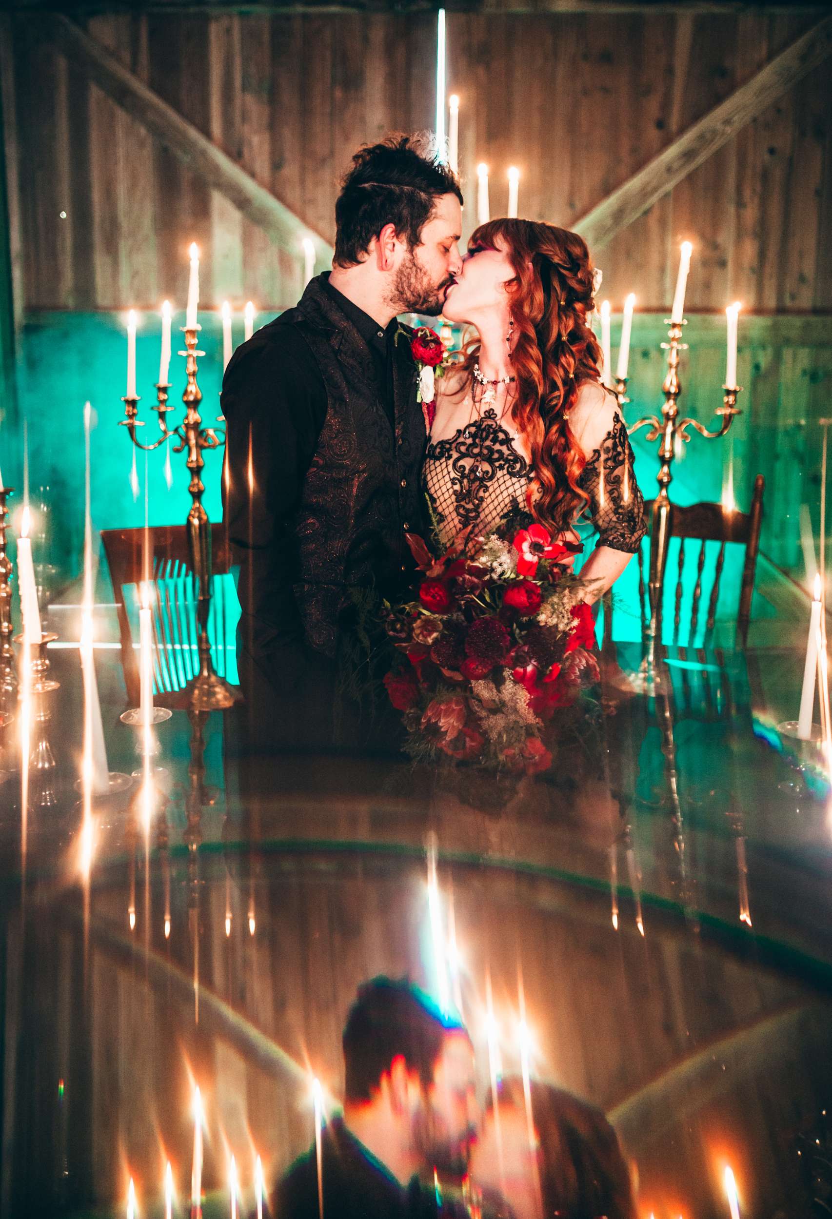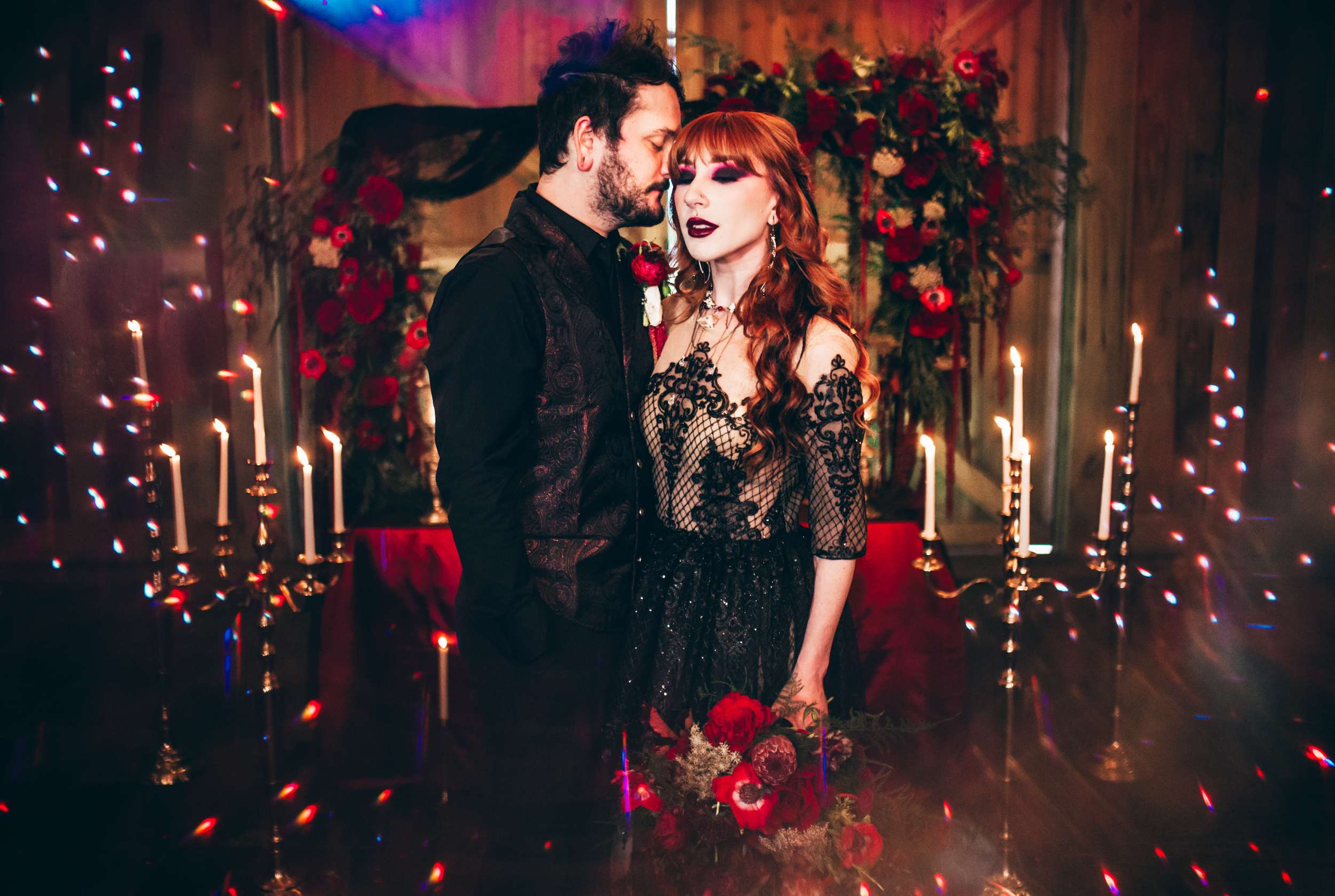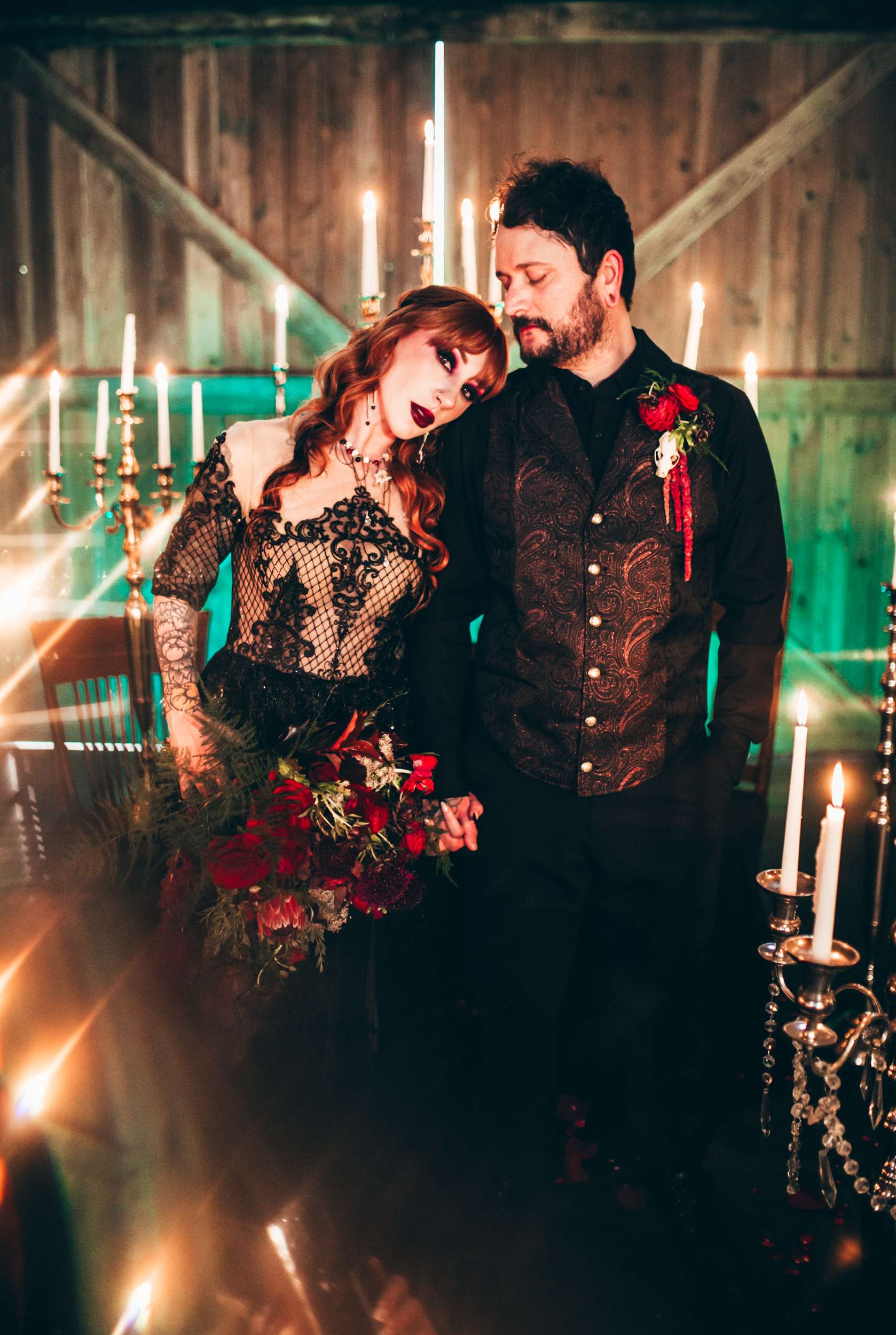 The shoot is thick with symbols. Dozens of candles surround a couple cutting a skull cake with a Vorpal Blade. “We hadn’t seen the idea done by anyone else yet,” Lauren added. “We’ve seen numerous gothic weddings or ones with a black dress, but none surrounded by numerous candles, cutting a skull cake with a Vorpal Blade, and with a whole new genre to play with.”