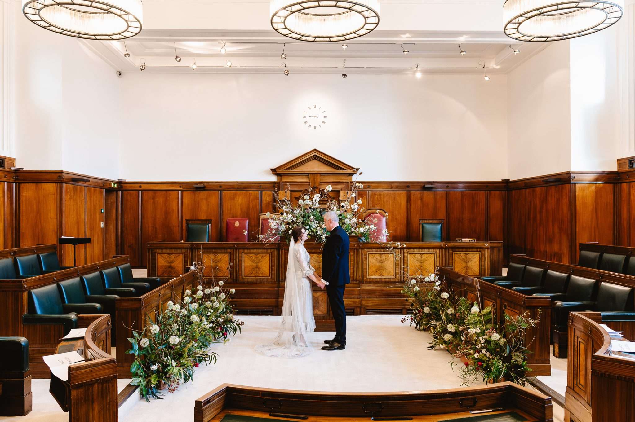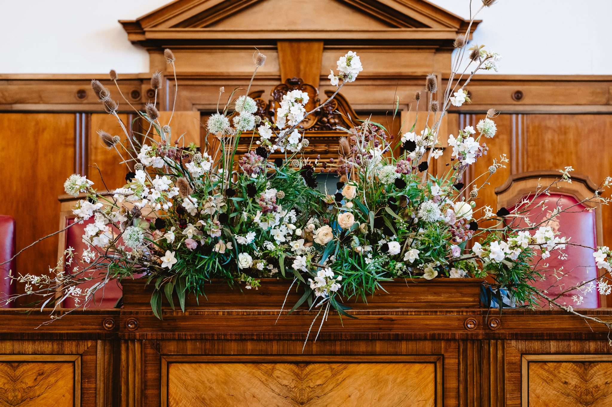 The Flower Appreciation Society brought in branches of spring blossom cut that morning and turned the ceremony room at Town Hall Hotel & Apartments into something between a meadow and a quiet hideaway. Guests walked in to birdsong and the sound of running water. A friend composed the entrance music as a gift, setting lines from The Tempest to music.
