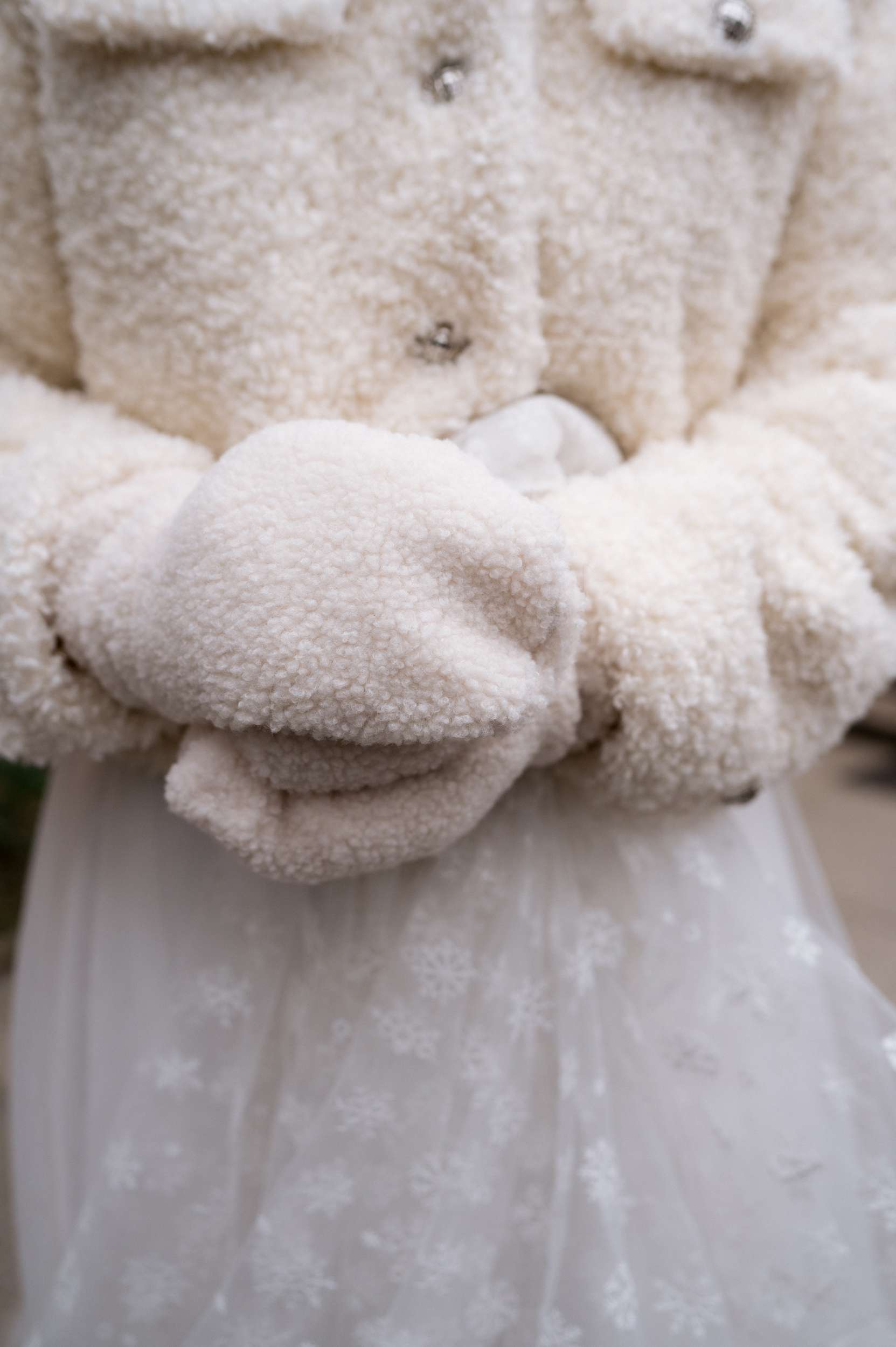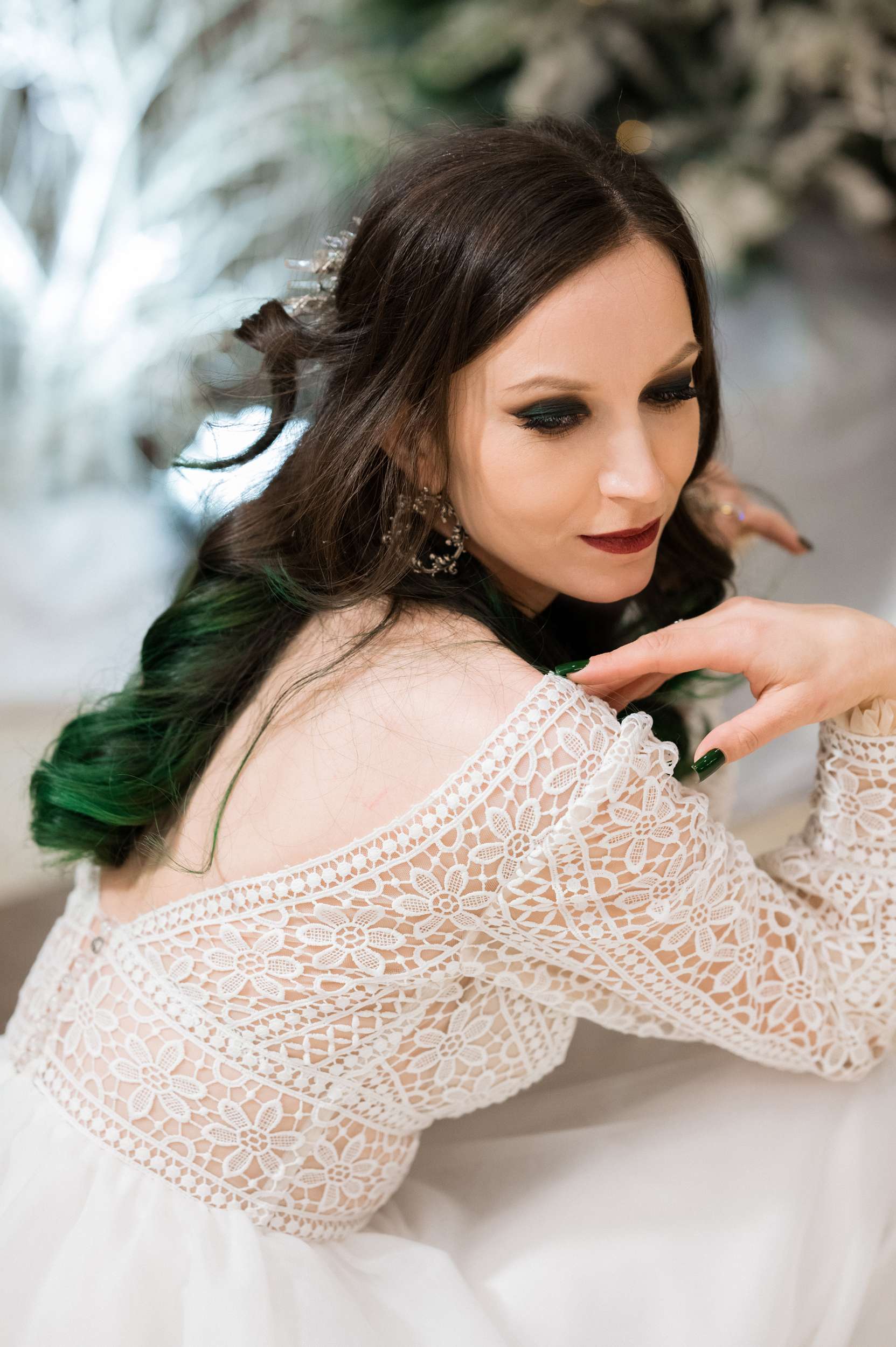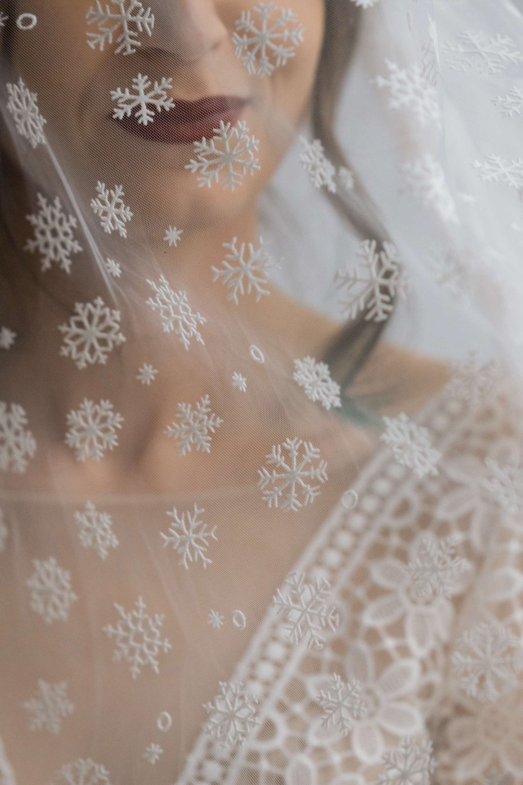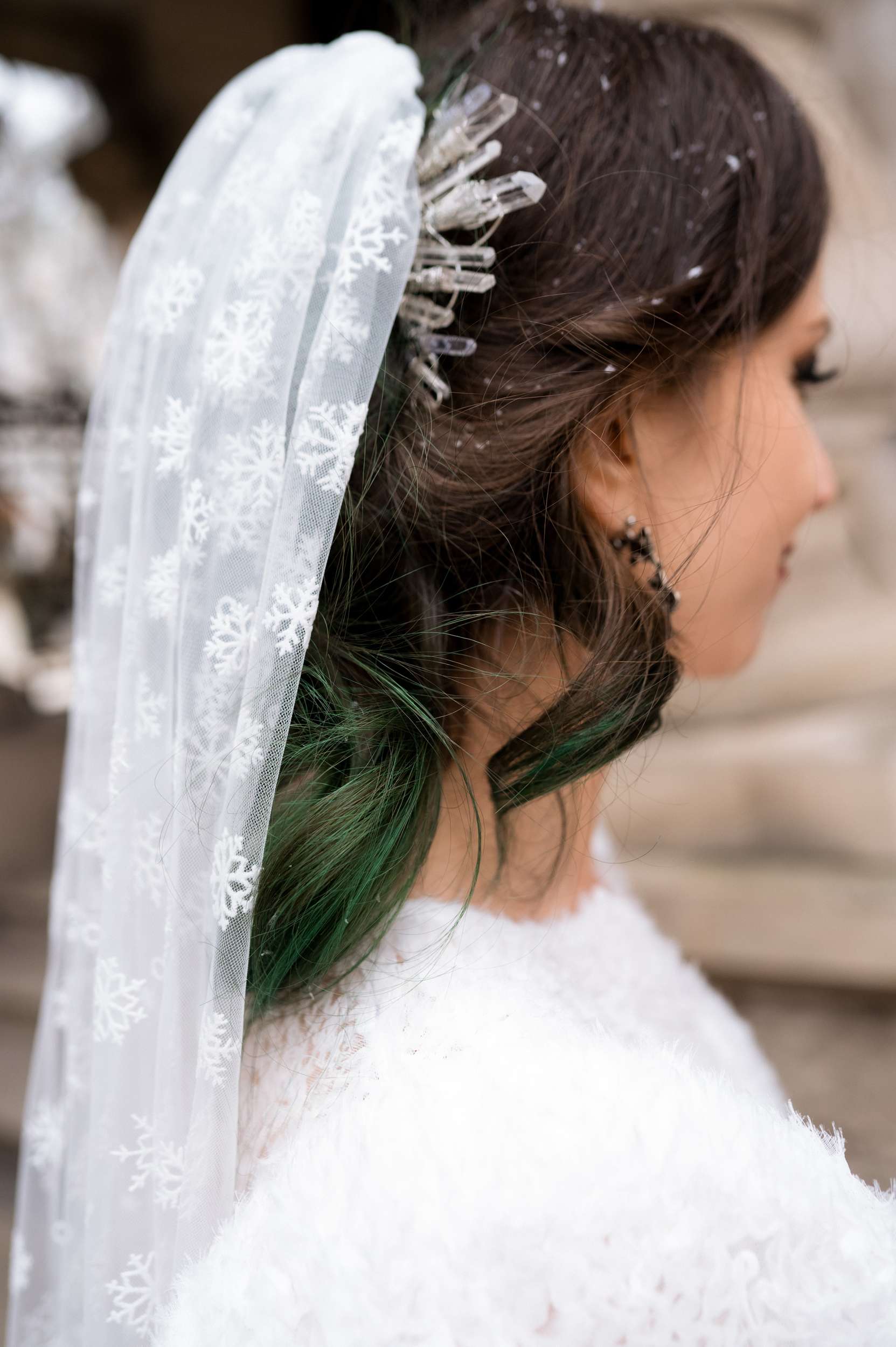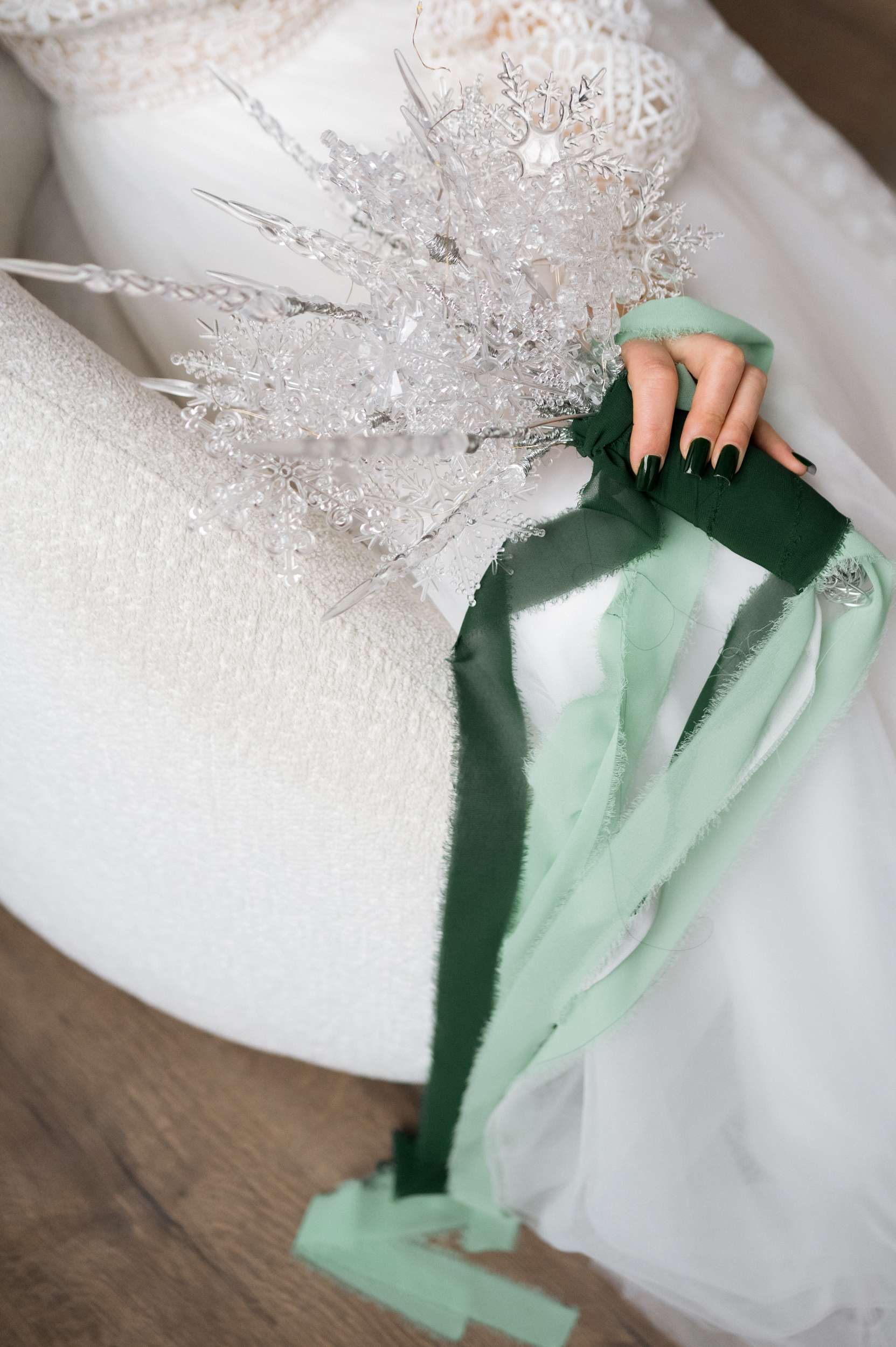 Snowflakes appeared everywhere, she explained, “Even though I had a winter wedding always on my mind, I didn’t have any idea how it was going to look until we got engaged in 2022. That’s when the hunt for actual ideas started. First, I discovered my Harriet Wilde shoes, then I came across Howling Moon Headwear and those crystal hair pieces felt incredible, icy but with a witchy vibe. Then one day during Christmas season, I was looking at our Christmas ornaments and I decided in that moment that they were going to become my bridal bouquet! I didn’t have any technique, I just took silver wire and started to form the snowflake ‘stem’. That’s the moment when I realised we were really going to go all out on the snowflake theme.”