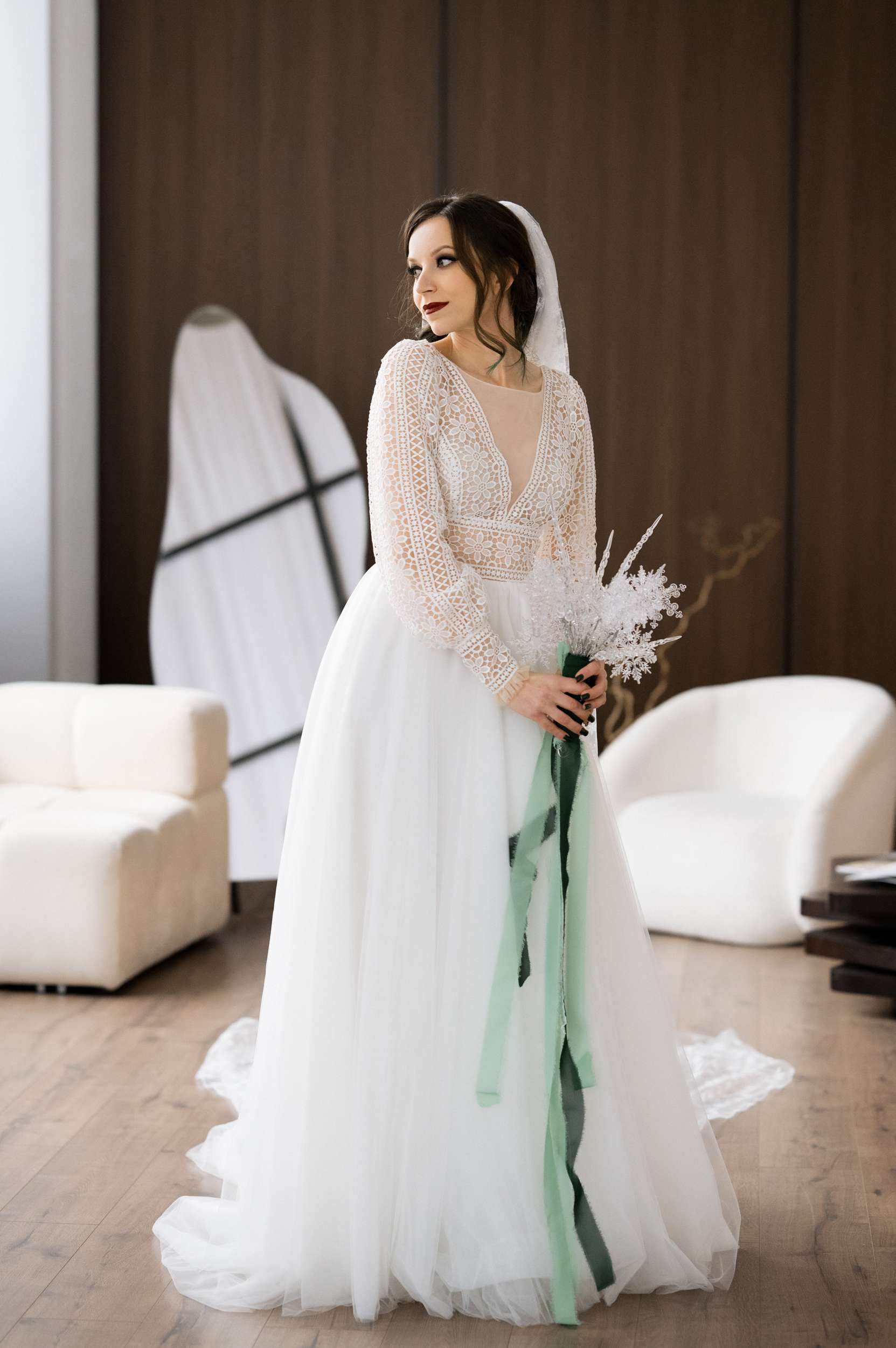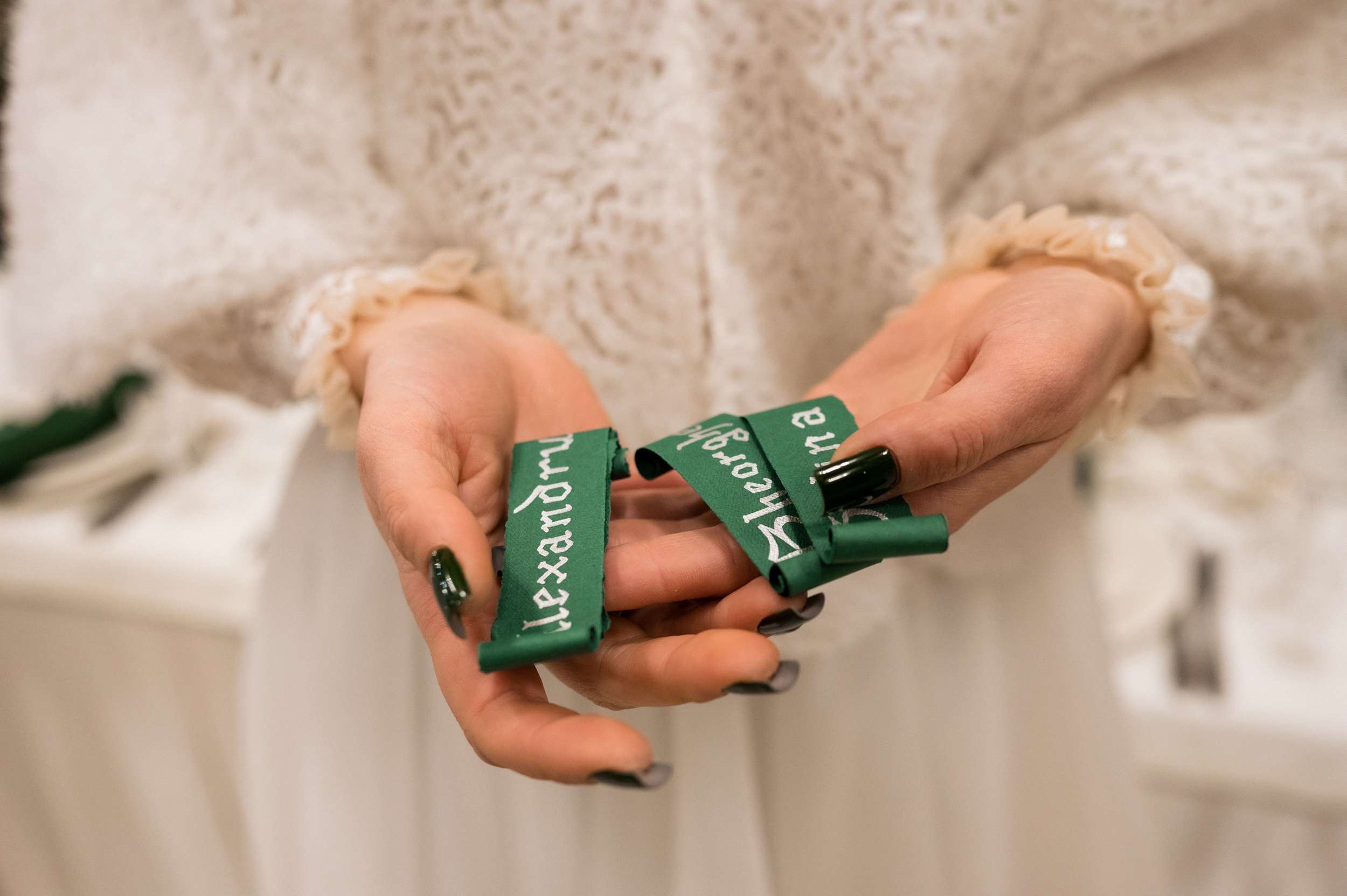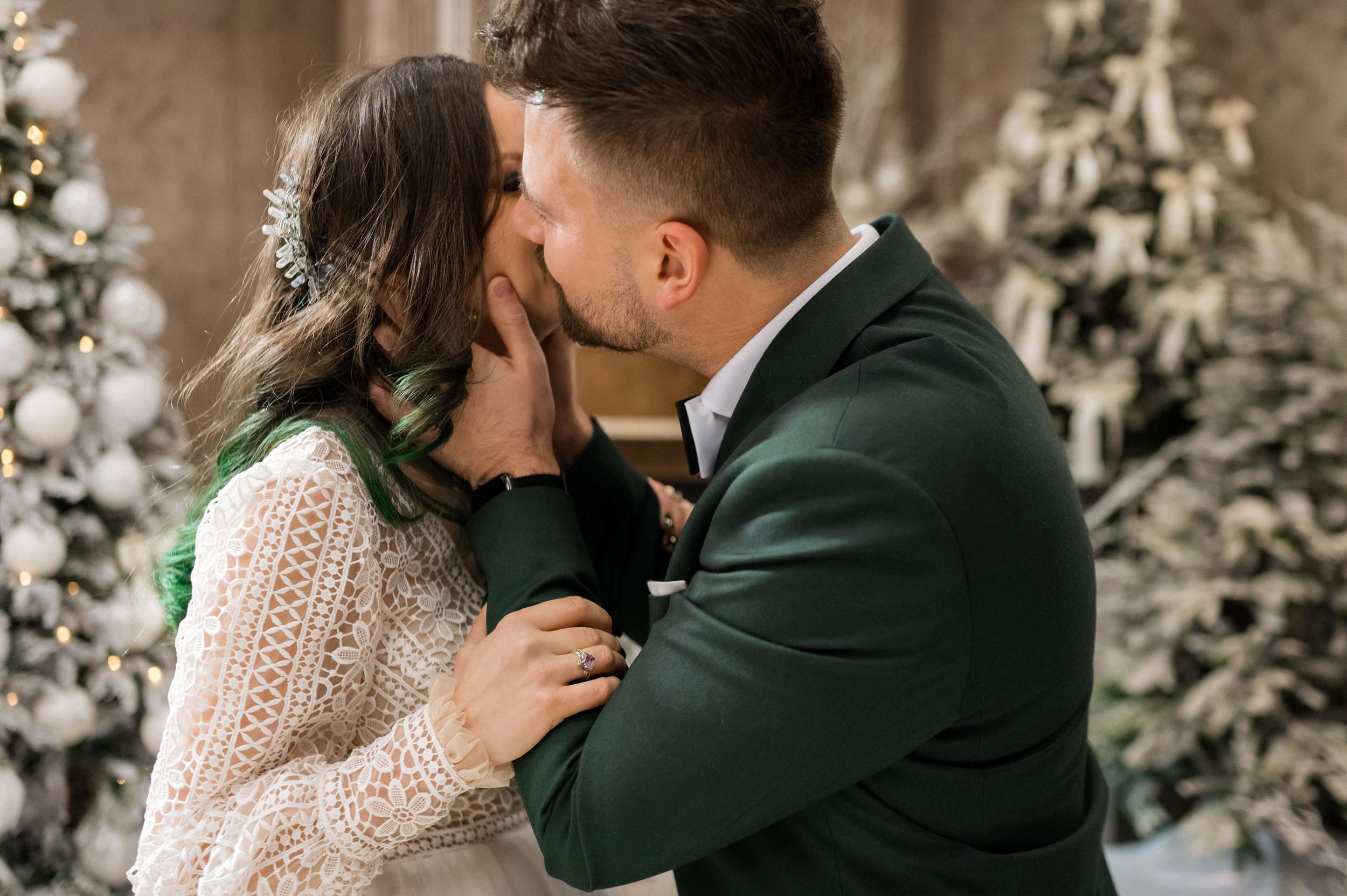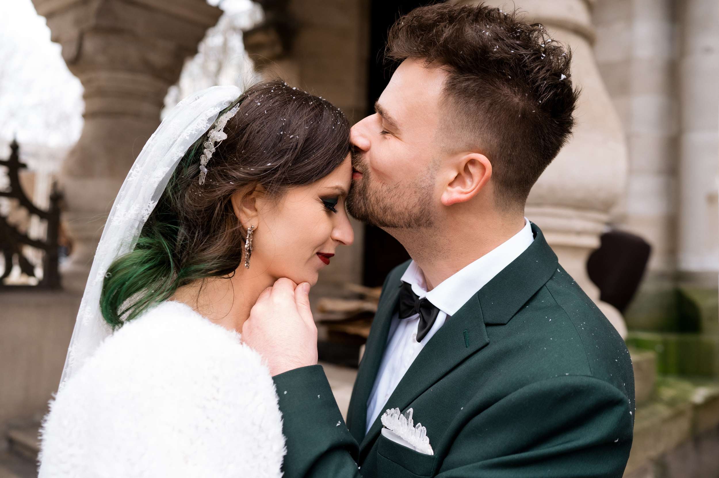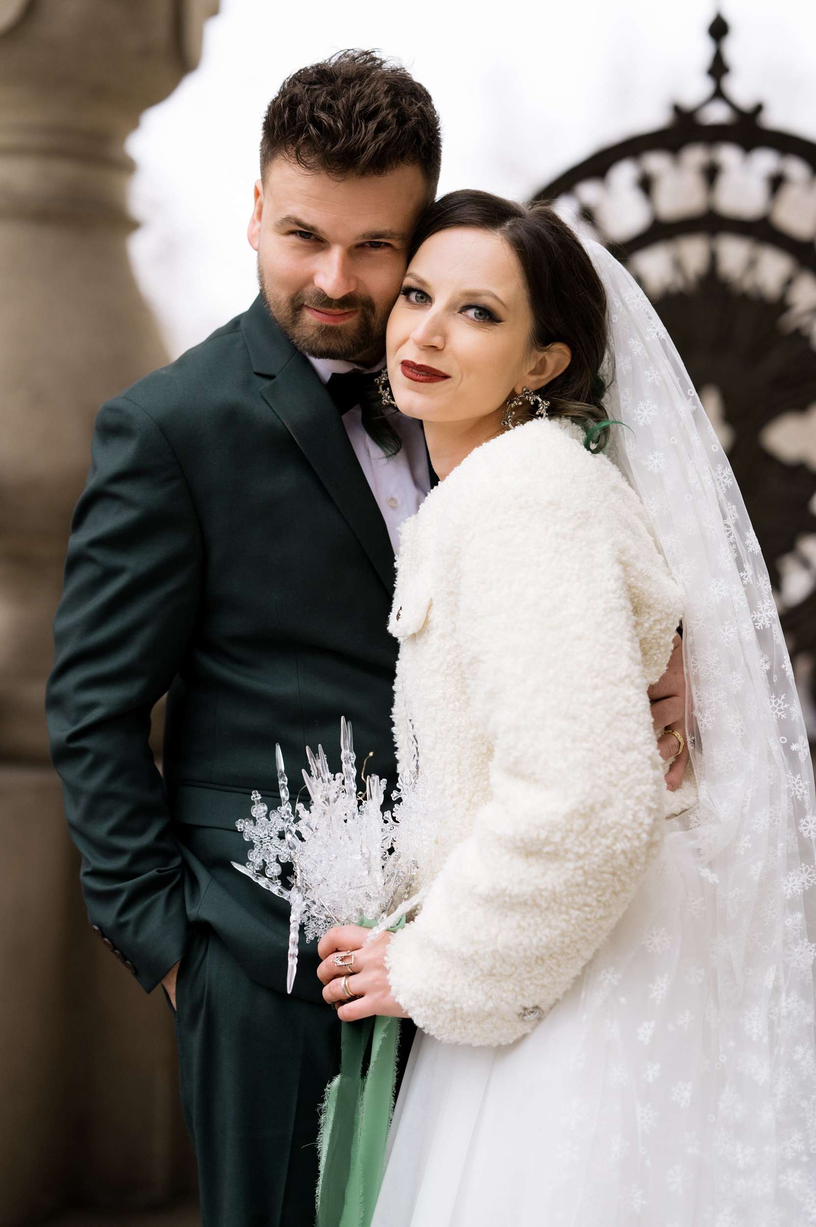 “We are snow people,” Maria told us. “I also really love the colour green. I adore winter and the small, gentle magical snowflakes. Beside our love, our wedding reflected the joy of snow. I couldn’t imagine having a wedding in any other way. Of course, you can’t really predict a snowy day, so I tried to make most of it through décor elements and by throwing snowflake confetti. My bouquet was made by me and it also had to be snowflakes.”