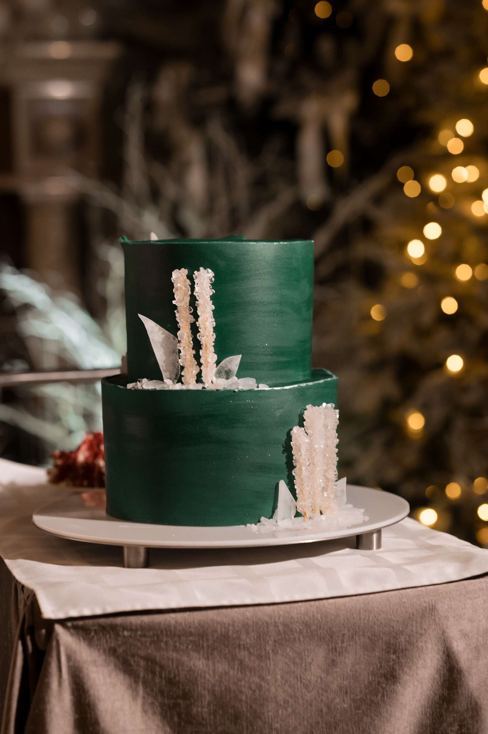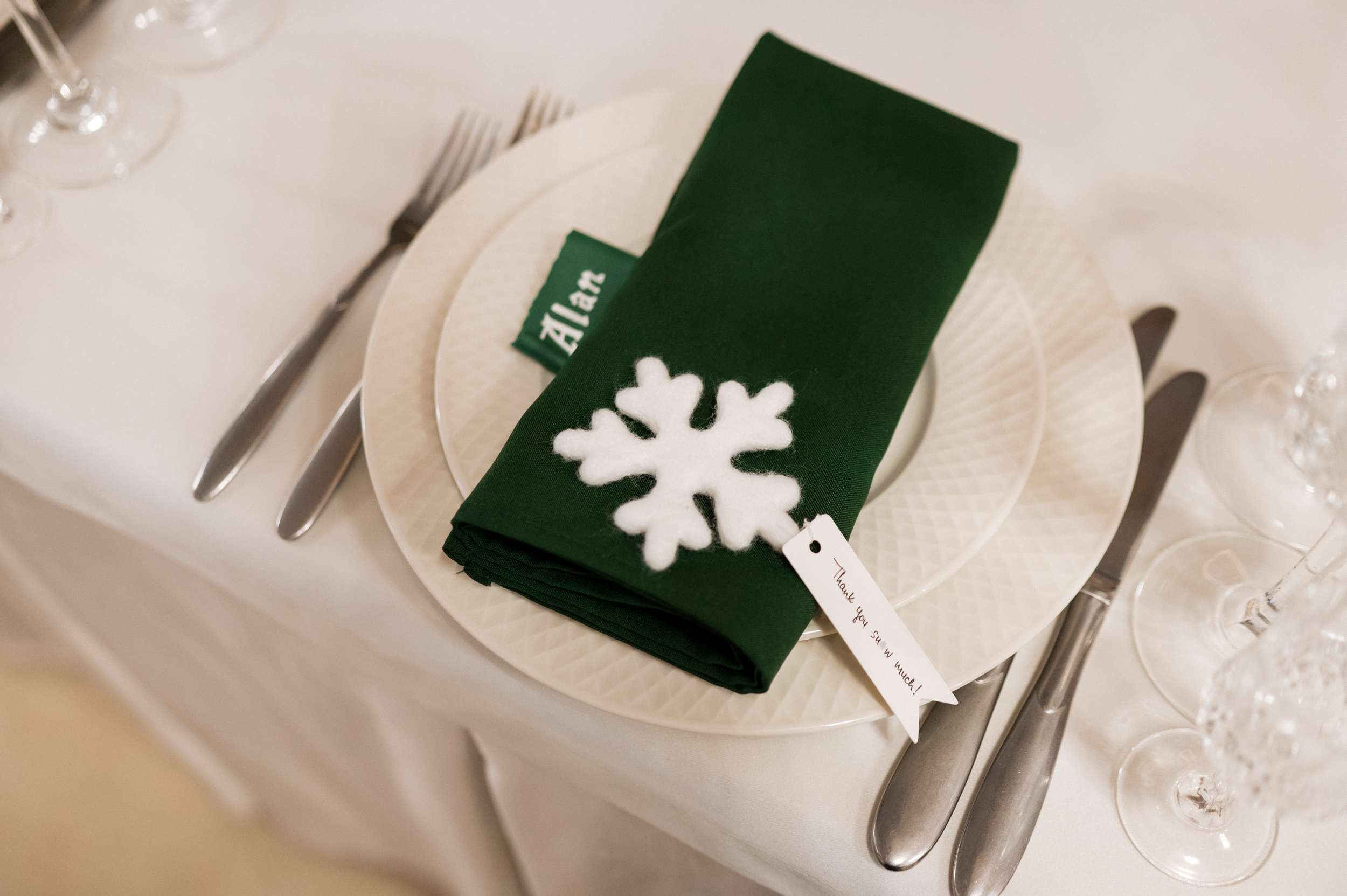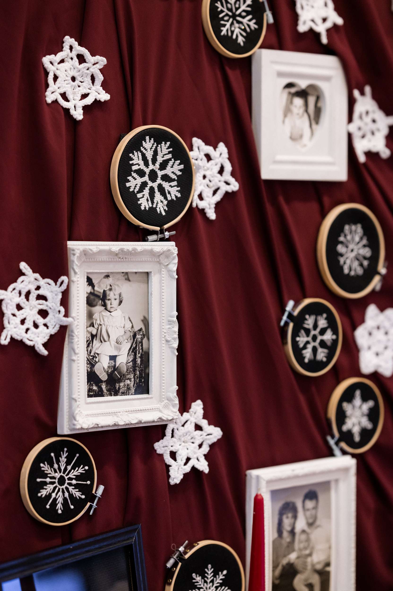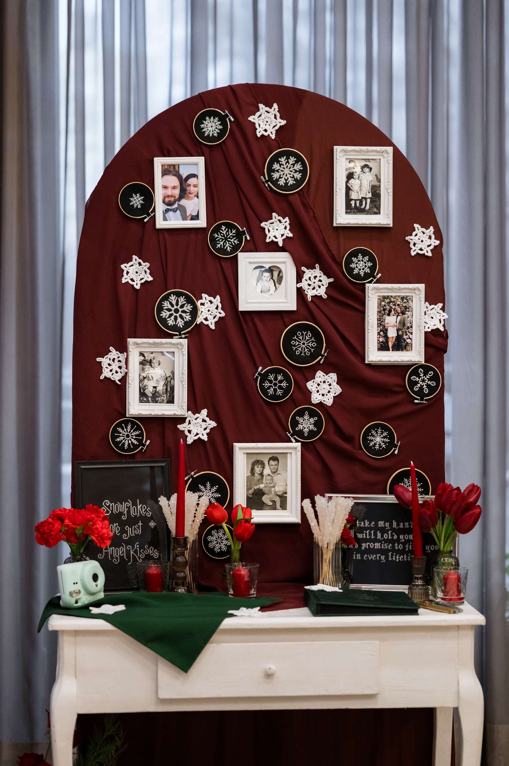 “From there, we tried to include as much of them as possible – in my the veil, the artificial confetti snow, the cross-stitched table signs, the guest favours, the temporary tattoos. We made felted white snowflakes for each place setting, paired with handwritten tags reading ‘thank you snow much’. We would do it all over again and even with more snowflakes!” Maria even spent three months growing sugar rock candy crystals to give out as favours.