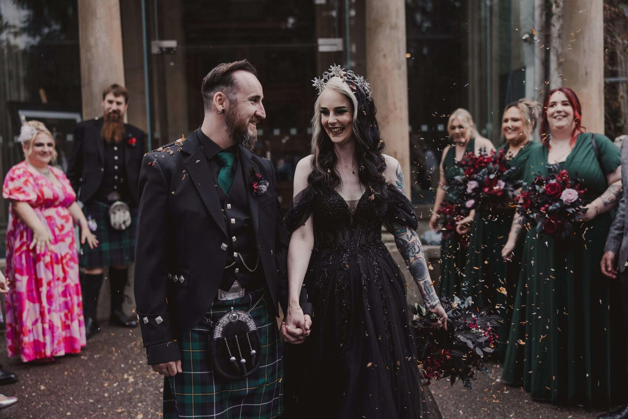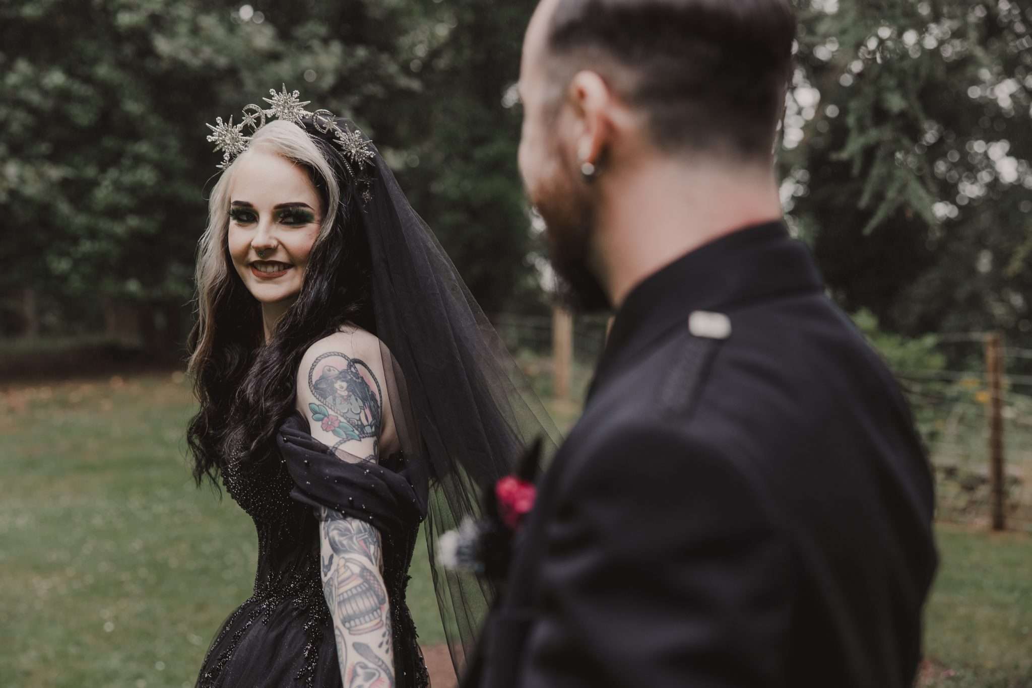 “First and foremost, our biggest inspiration was metal music”, Becky said. “It’s the strongest passion we both share. We wanted to ensure that, if we were going to put in all the effort, stress and expense of a wedding, it would be done exactly as we wanted, without worrying about being ‘conventional’. Our theme was gothic, with black as our primary colour and dark emerald green as the secondary. The phrases we used for the day was ‘Til Death’ and ‘A Match Made in Metal’. We aimed for a romantic, gothic atmosphere that reflected our passion for metal music. Our goal was for the day to feel like a lively celebration, a big party rather than a highly formal event.”