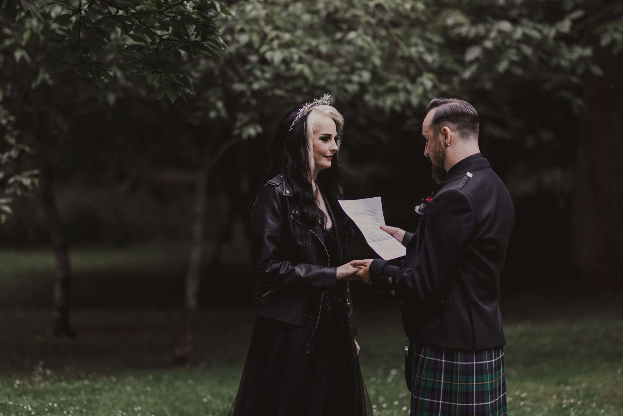 The ceremony opened with moment of emo nostalgia as Becky walked down the aisle to a piano version of My Chemical Romance’s Helena. Dark red and black petals covered the aisle and the guests gasped as they first saw her black gown. “I was living my ultimate emo teenage dream,” she said. “I always wanted my dad to walk me down the aisle as I couldn’t imagine doing it without him, therefore this was a tradition we wanted to keep.” They chose to exchange their vows privately in the woods afterwards, where they could speak to each other freely, and without an audience.