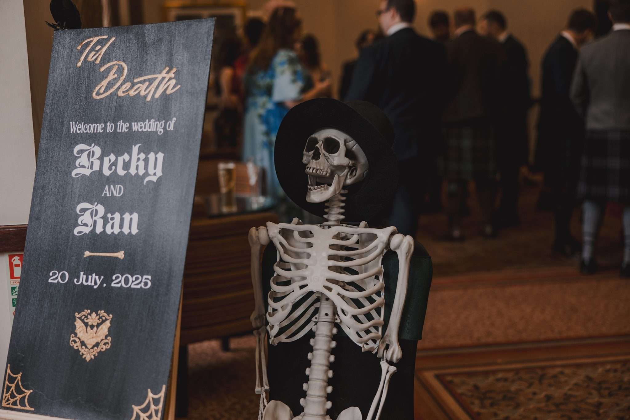 Their décor was where they really let their theme and creativity shine. They worked with Wonderland Florals who supplied the faux flowers and Ruffle & Rose who did the chair covers and lighting. Everything else they made our put together themselves. Their friend Ben built a coffin-shaped aisle arch and a skeleton in a top hat greeted guests at the entrance beside the welcome sign. A flag reading “a match made in metal” overlooked the top table. They had records as the table plan, bat-shaped place settings, black candles, and shot bottles as favours labelled ‘Til Death’.