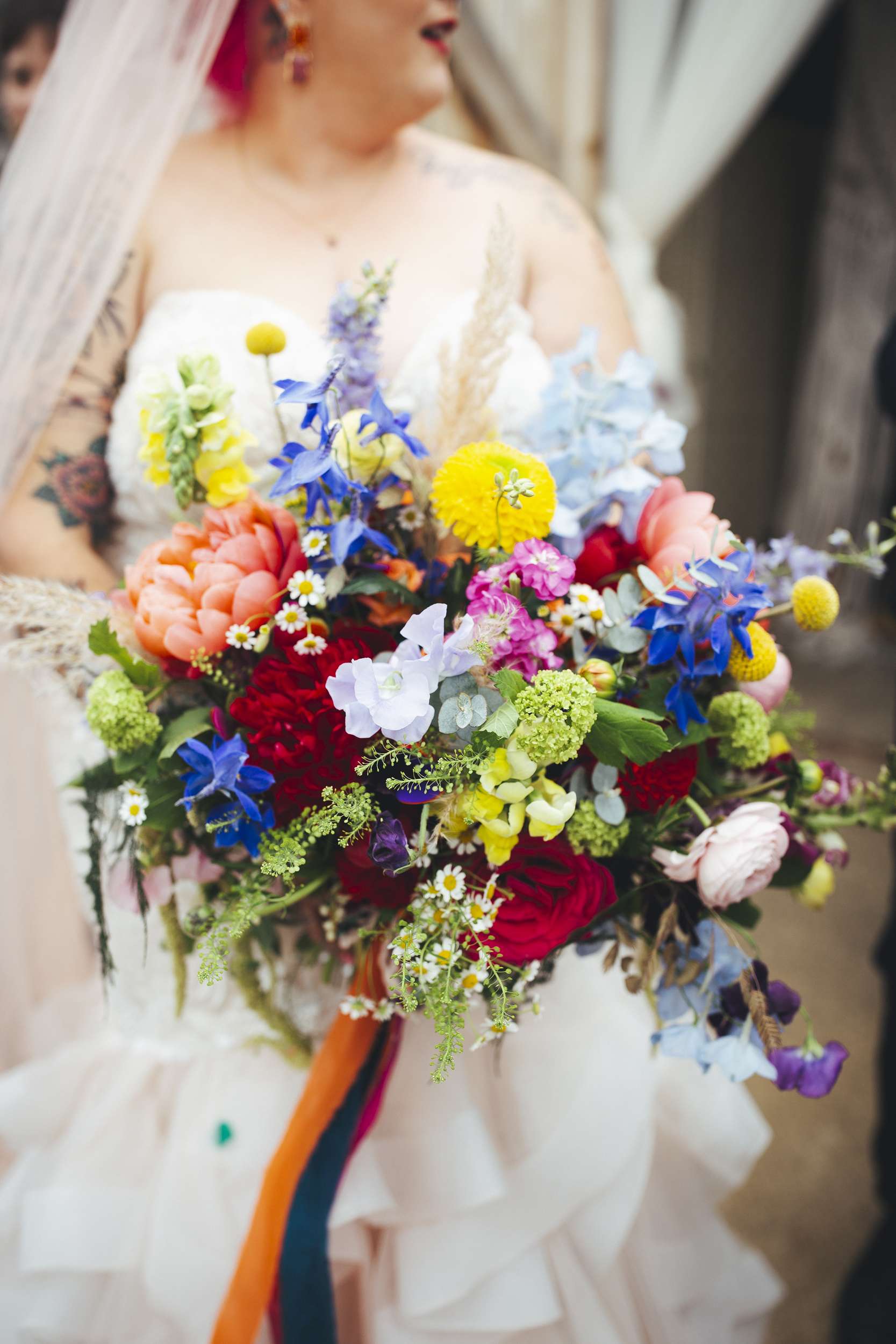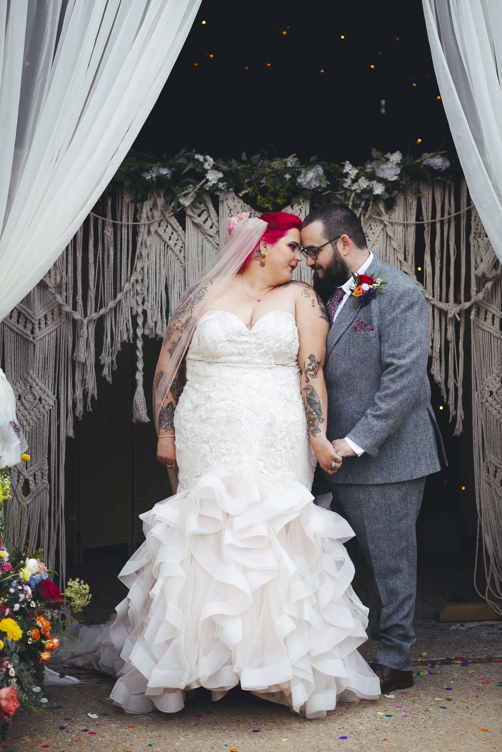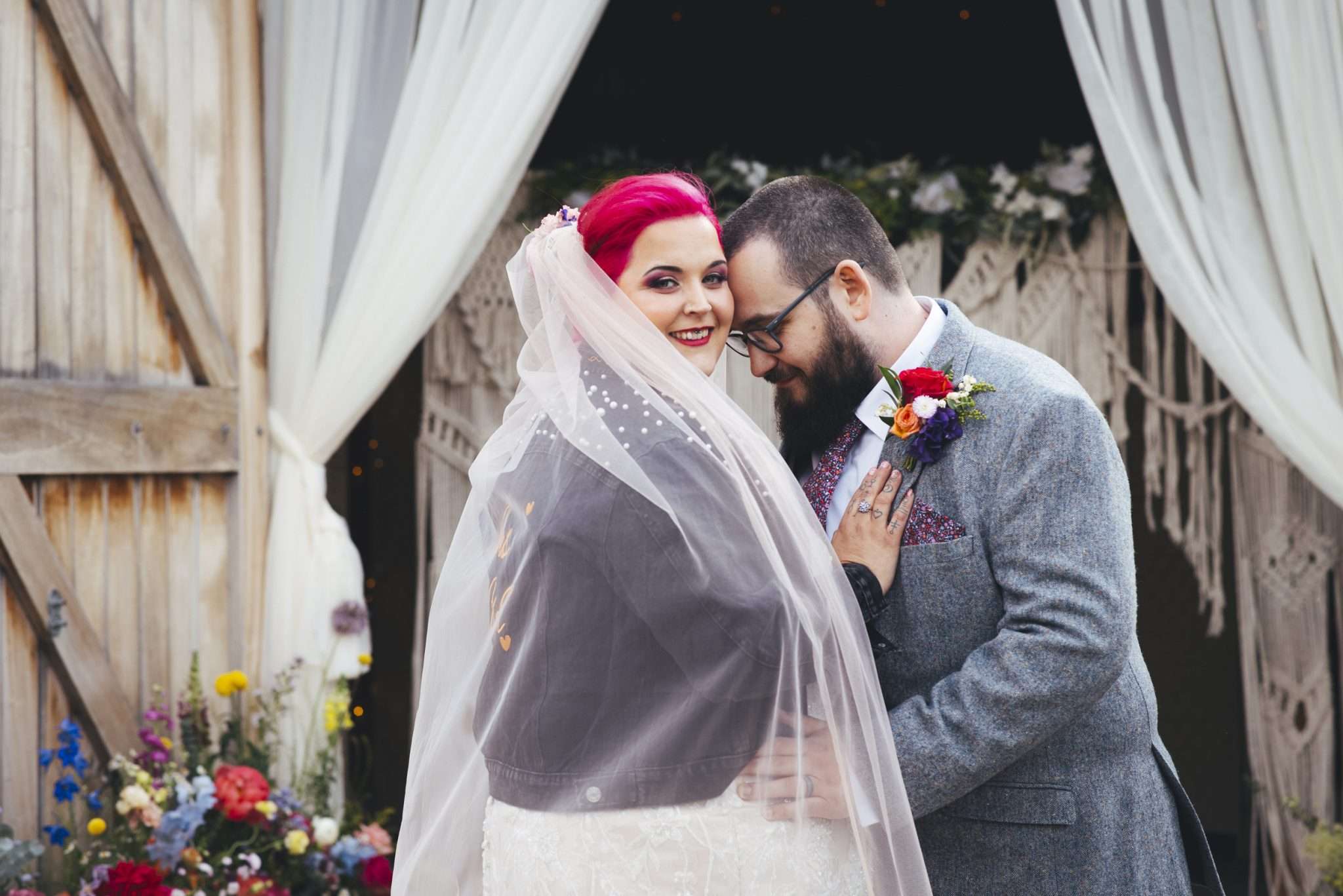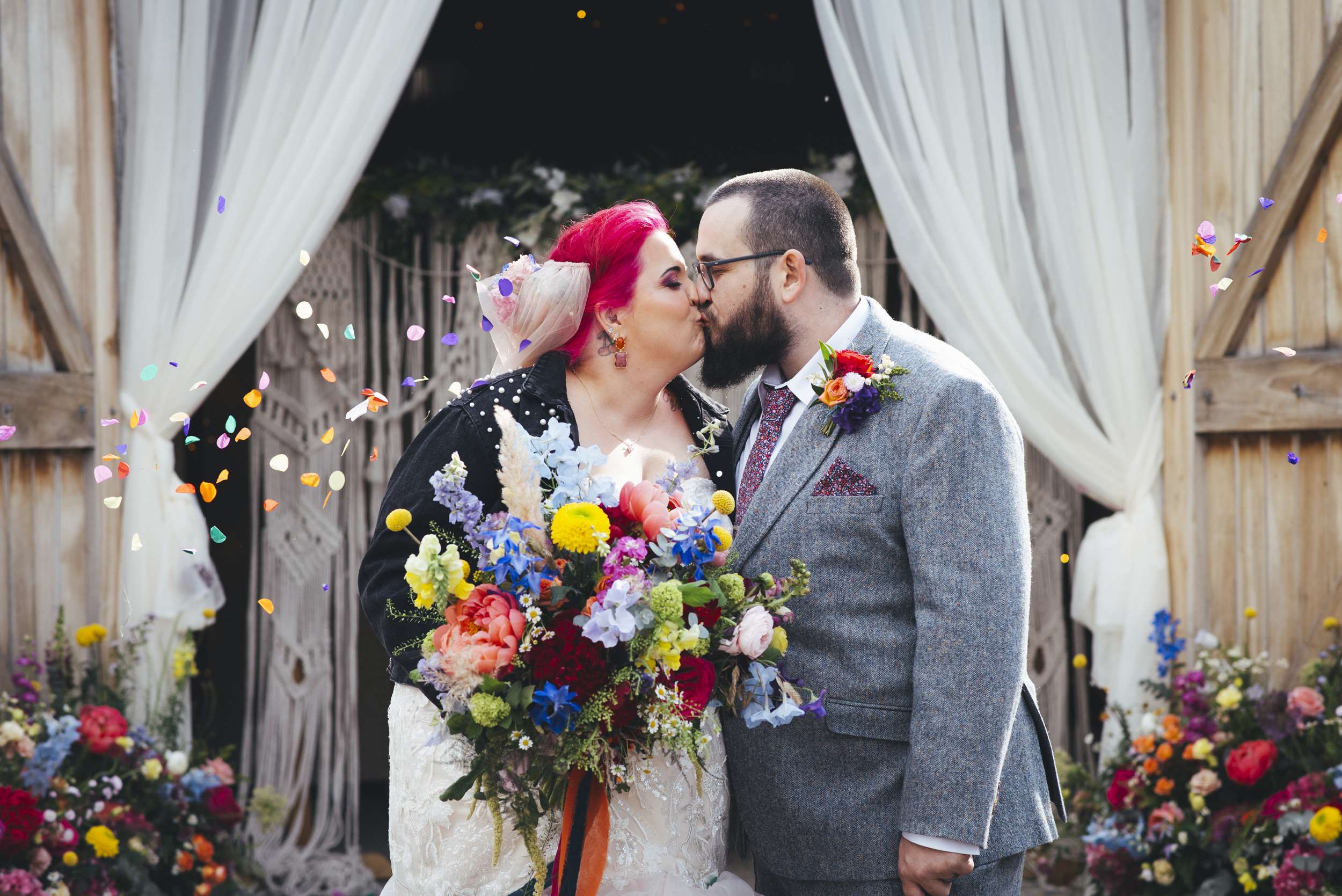 Chloe and Benn wanted their wedding to be colourful and feel exactly like them. The bride loves flowers so that was one of the first things she thought about. To keep things informal, they served BBQ food family style, a cheesecake instead of a wedding cake, and had a tarot reader as entertainment.