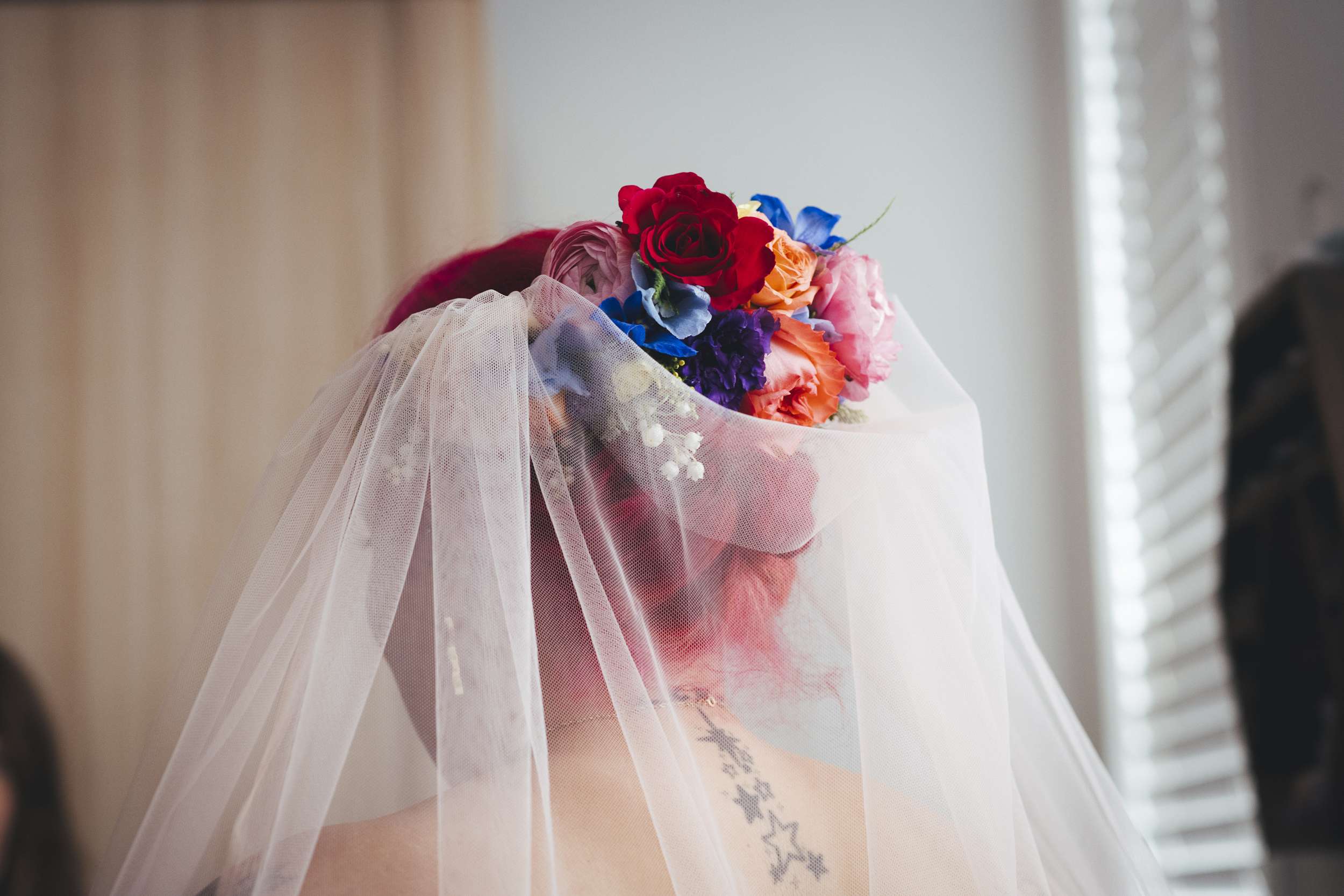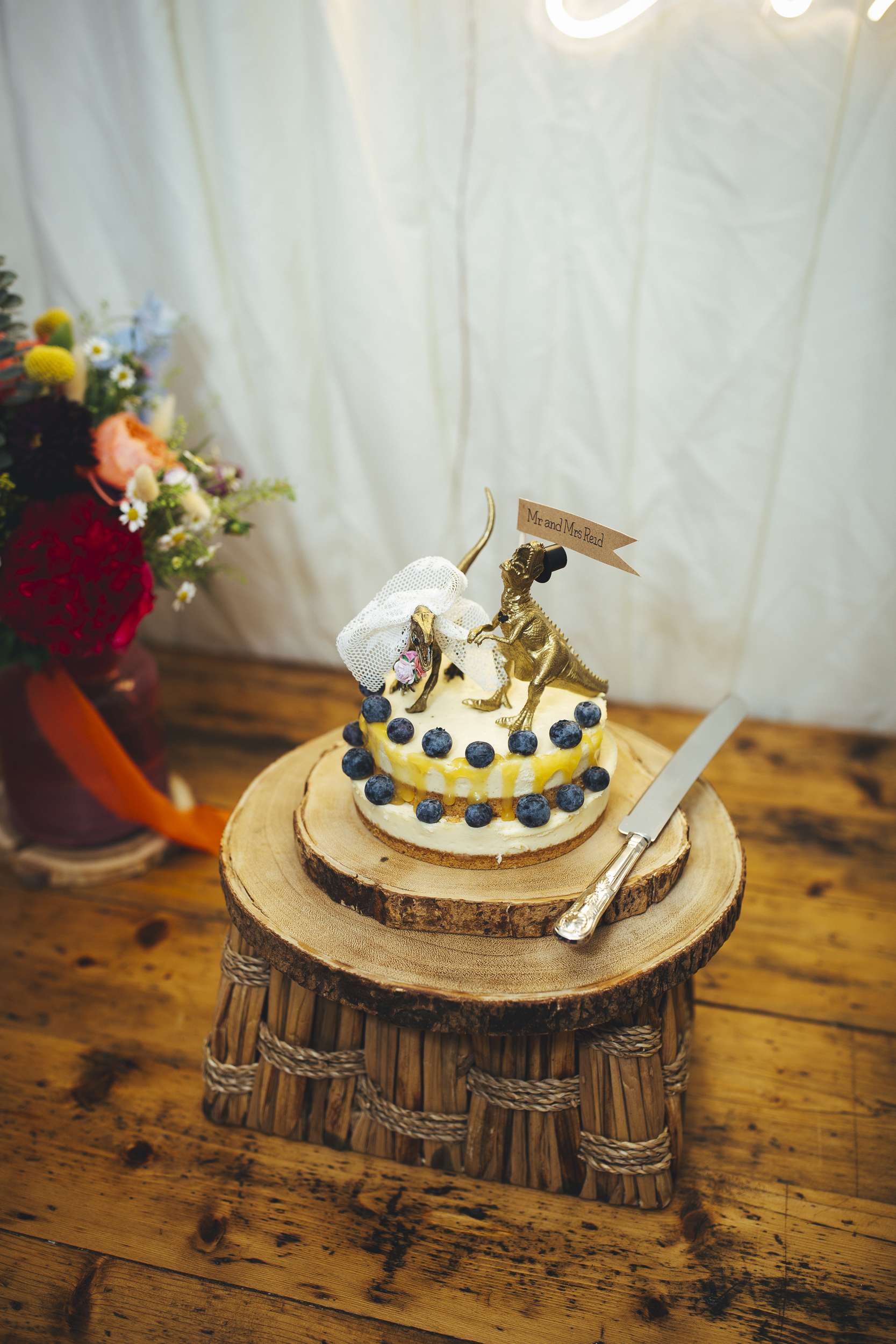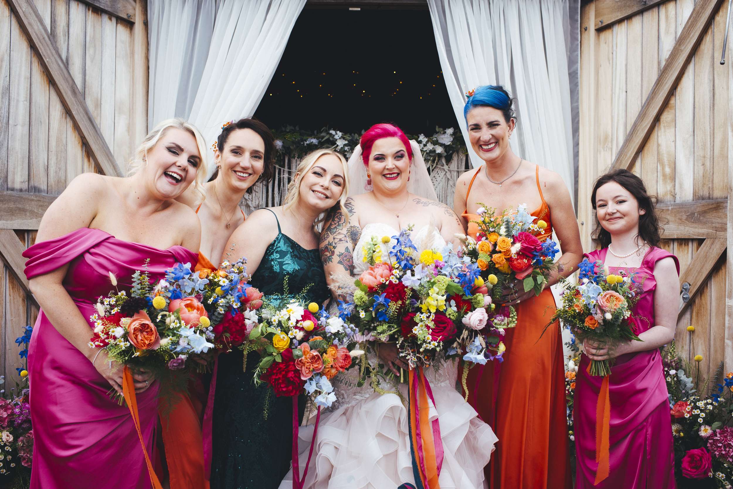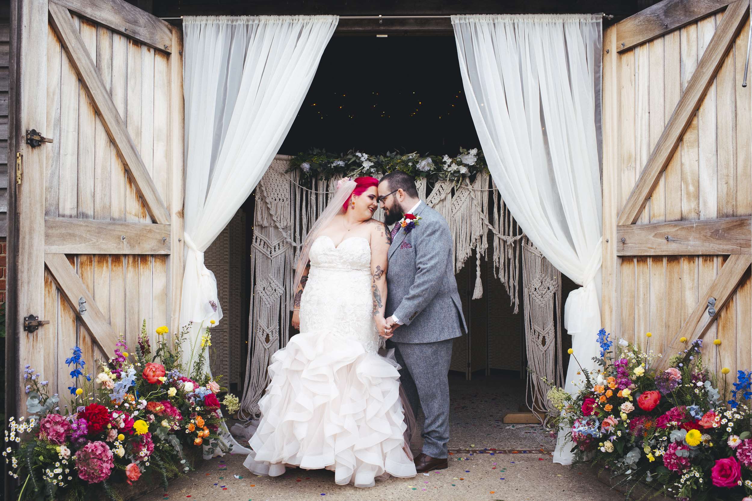 Chloe and Benn wanted their wedding to be colourful and feel exactly like them. The bride loves flowers so that was one of the first things she thought about. To keep things informal, they served BBQ food family style, a cheesecake instead of a wedding cake, and had a tarot reader as entertainment.