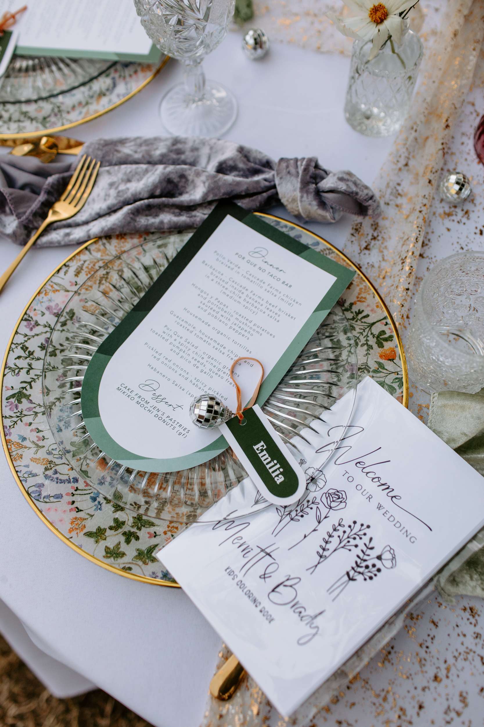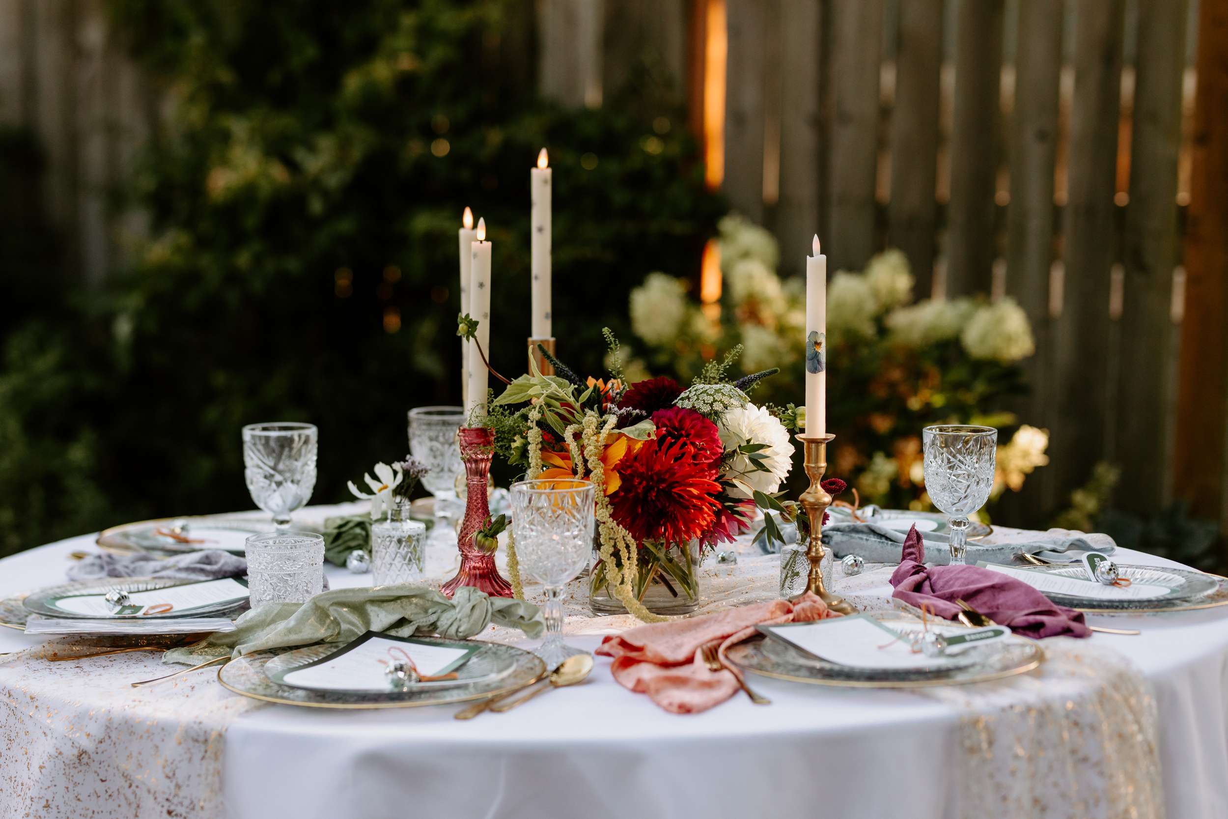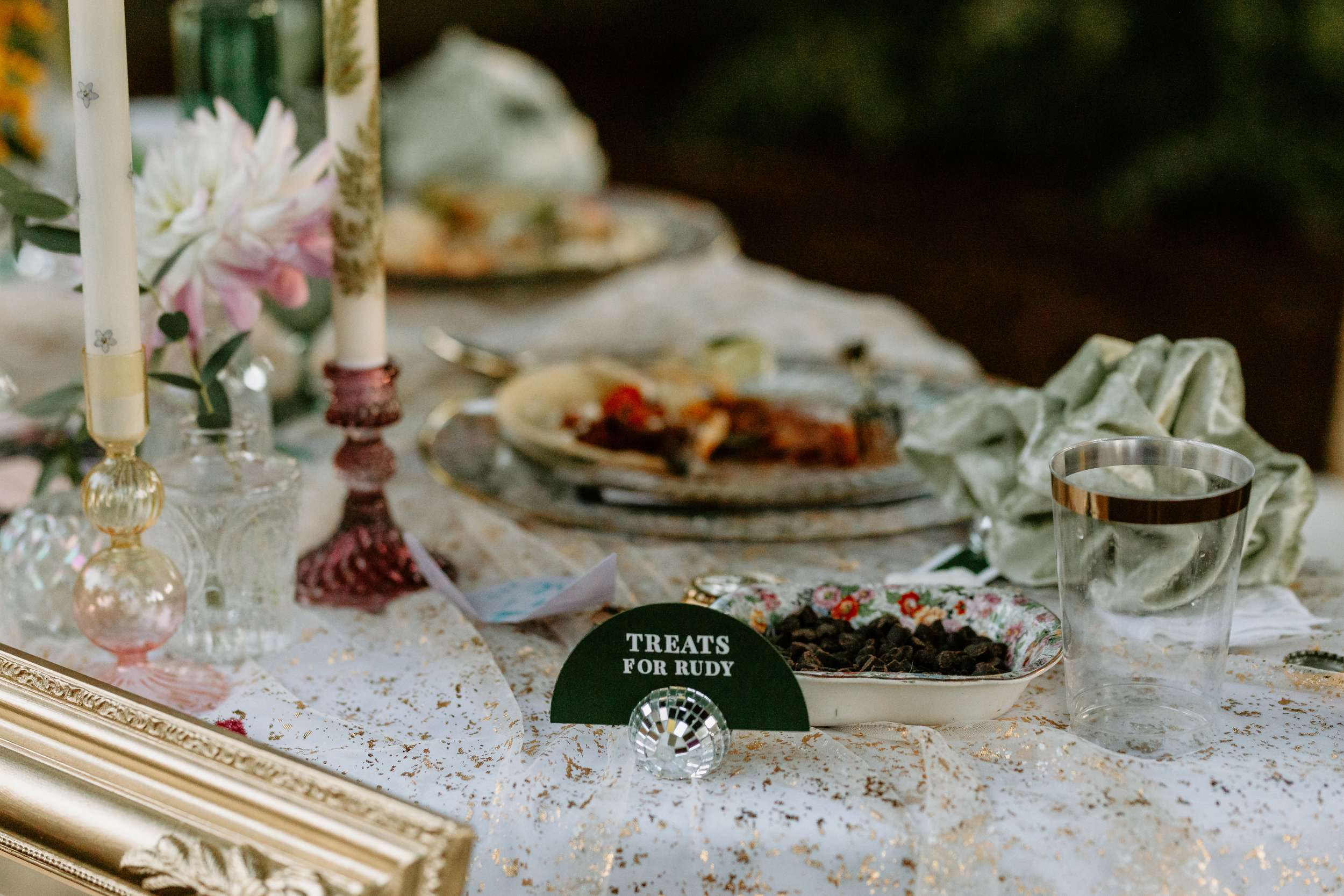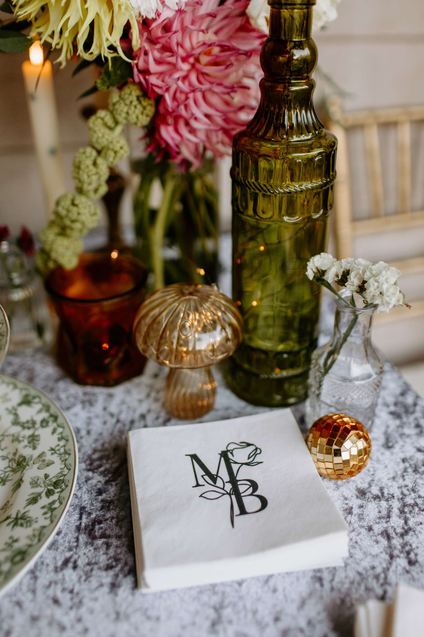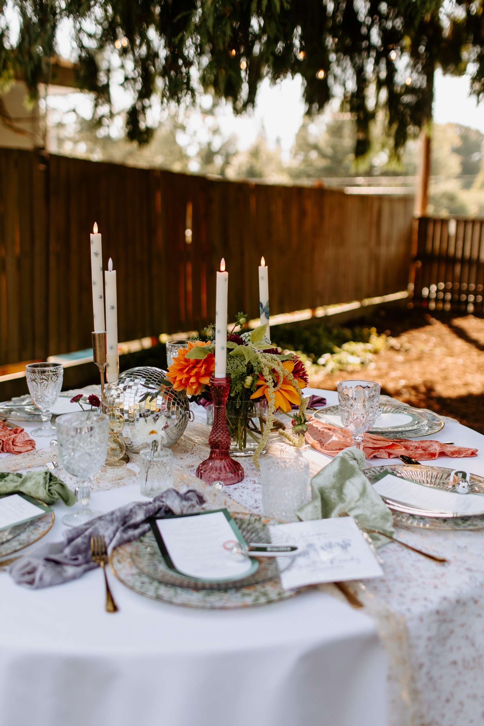 Merritt crafted candle holders and floral-pressed details, thrifted the tableware and even made their charger plates with napkins and Mod Podge after a late night idea that went rogue in the best way.
