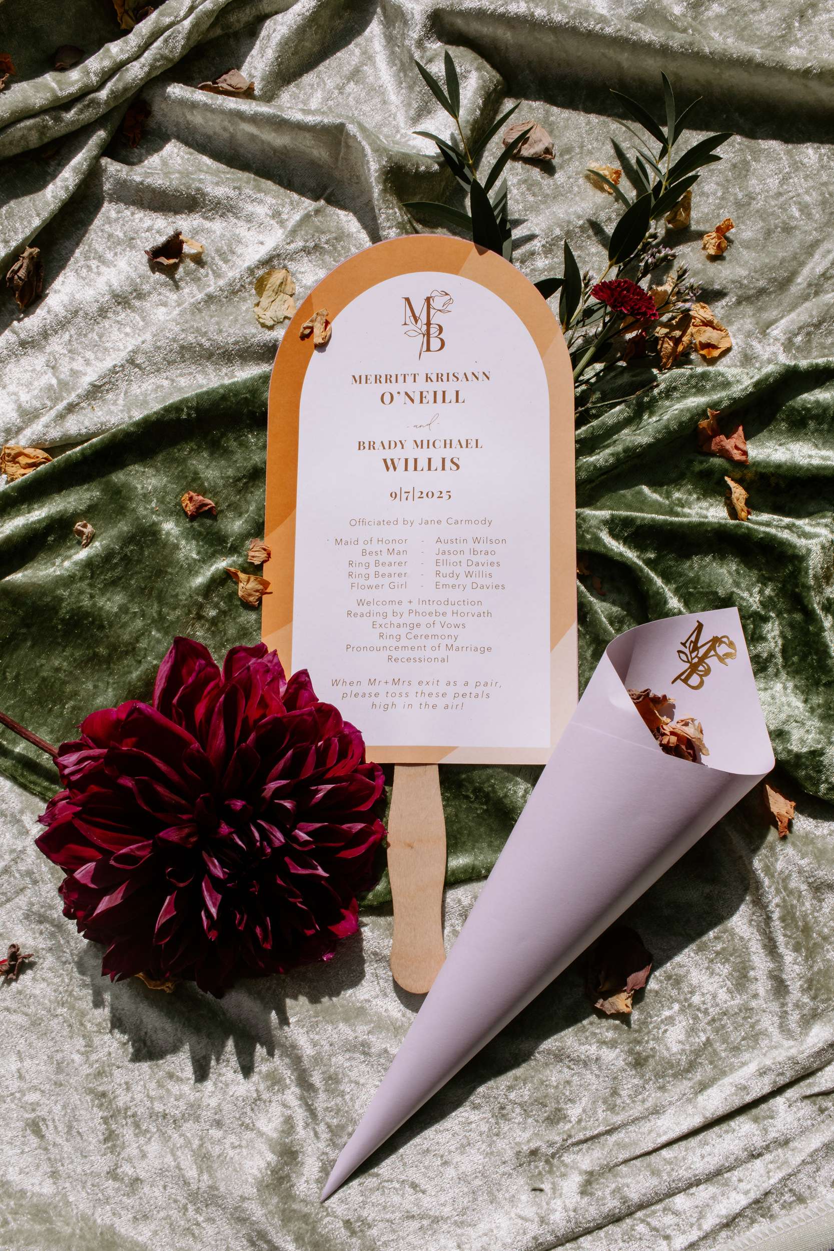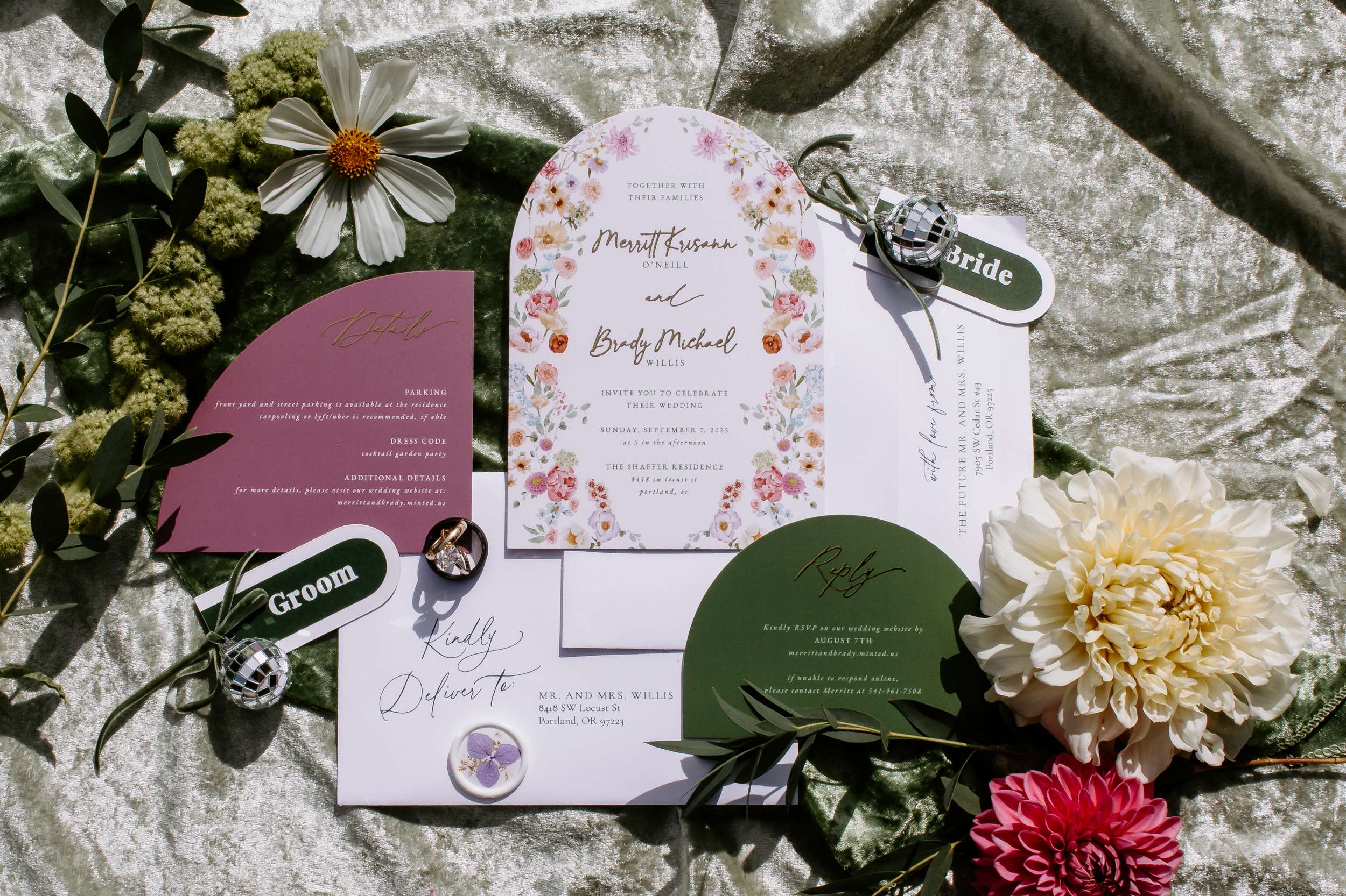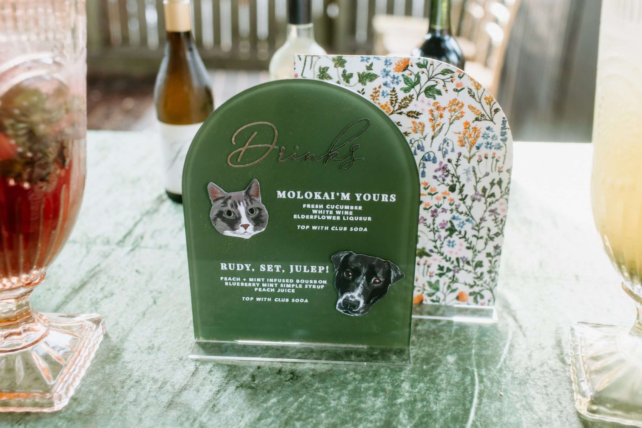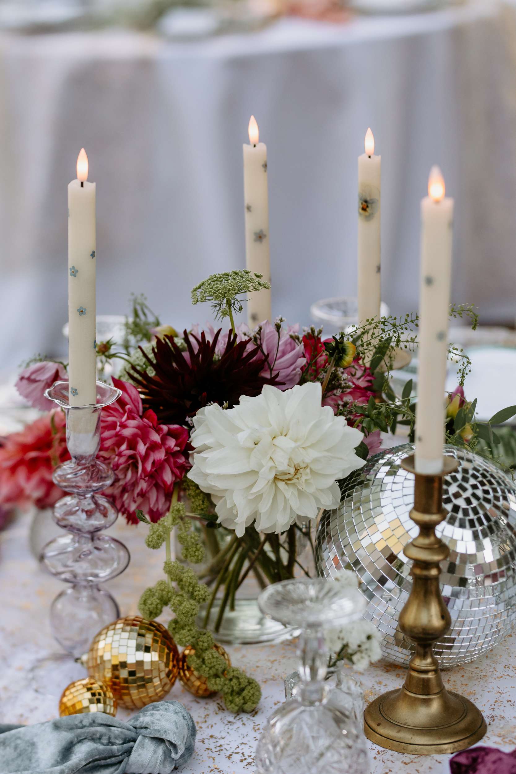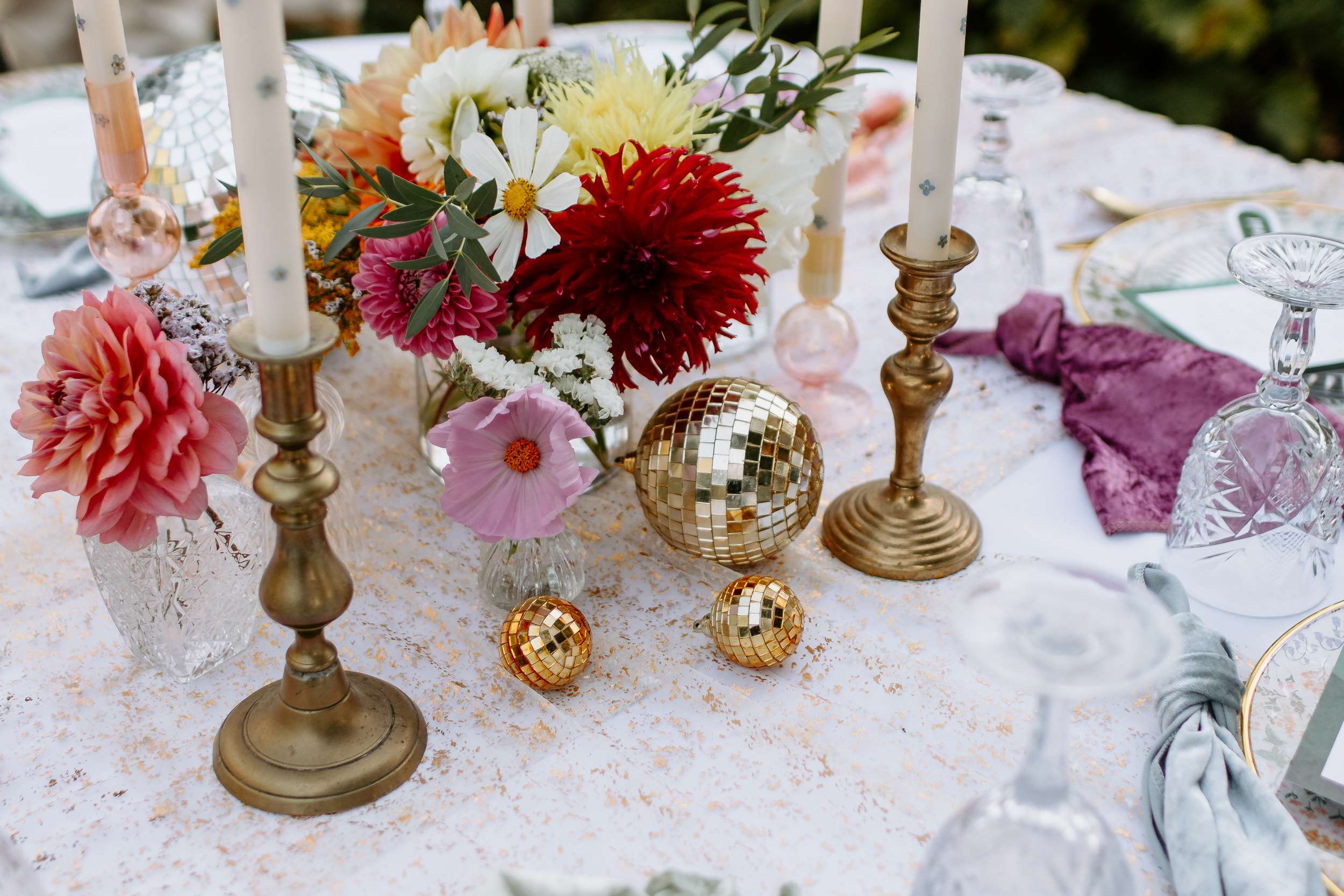 Merritt crafted candle holders and floral-pressed details, thrifted the tableware and even made their charger plates with napkins and Mod Podge after a late night idea that went rogue in the best way.
