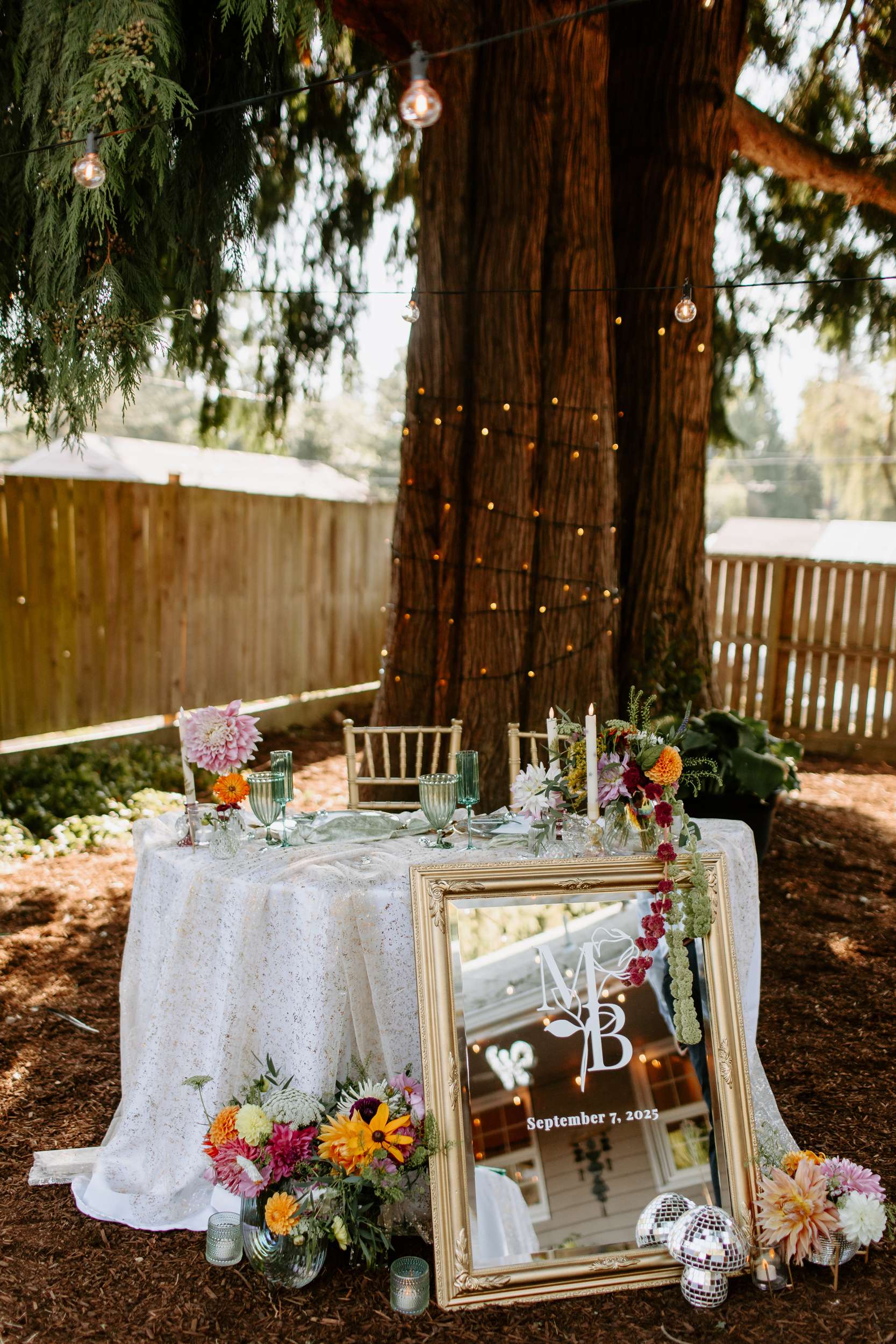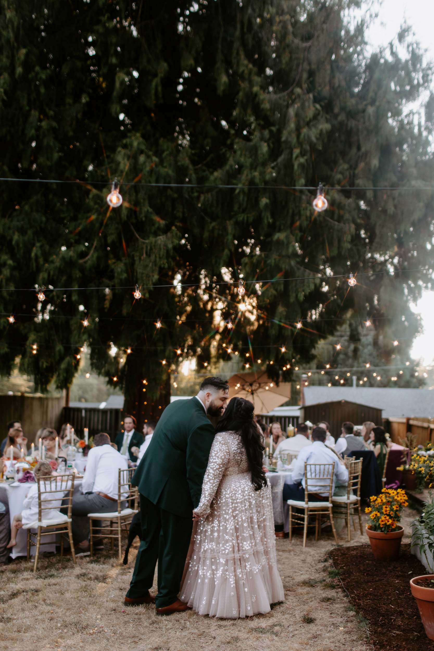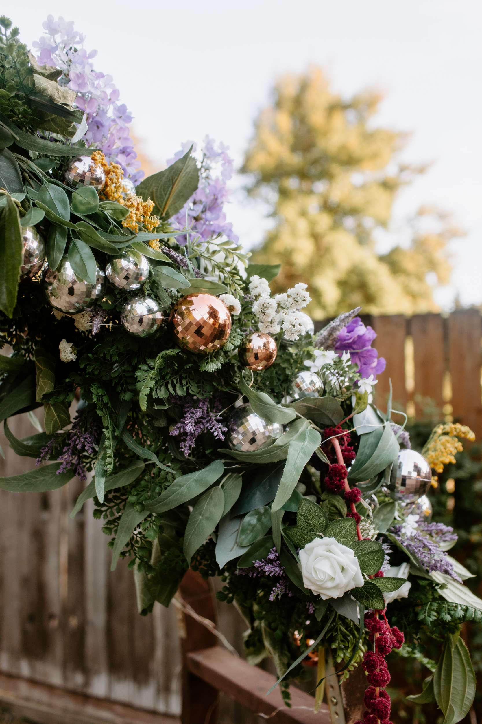 Their wedding was a whimsical garden party dream come true. Merritt and Brady filled a friend’s back garden with twinkly lights, disco balls, and so many flowers that it felt like stepping into a fairytale. What started as a plan to elope turned into a backyard celebration, thanks to dear friends who offered to host them. They spent four months pouring love (and a lot of labour) into making it perfect.
