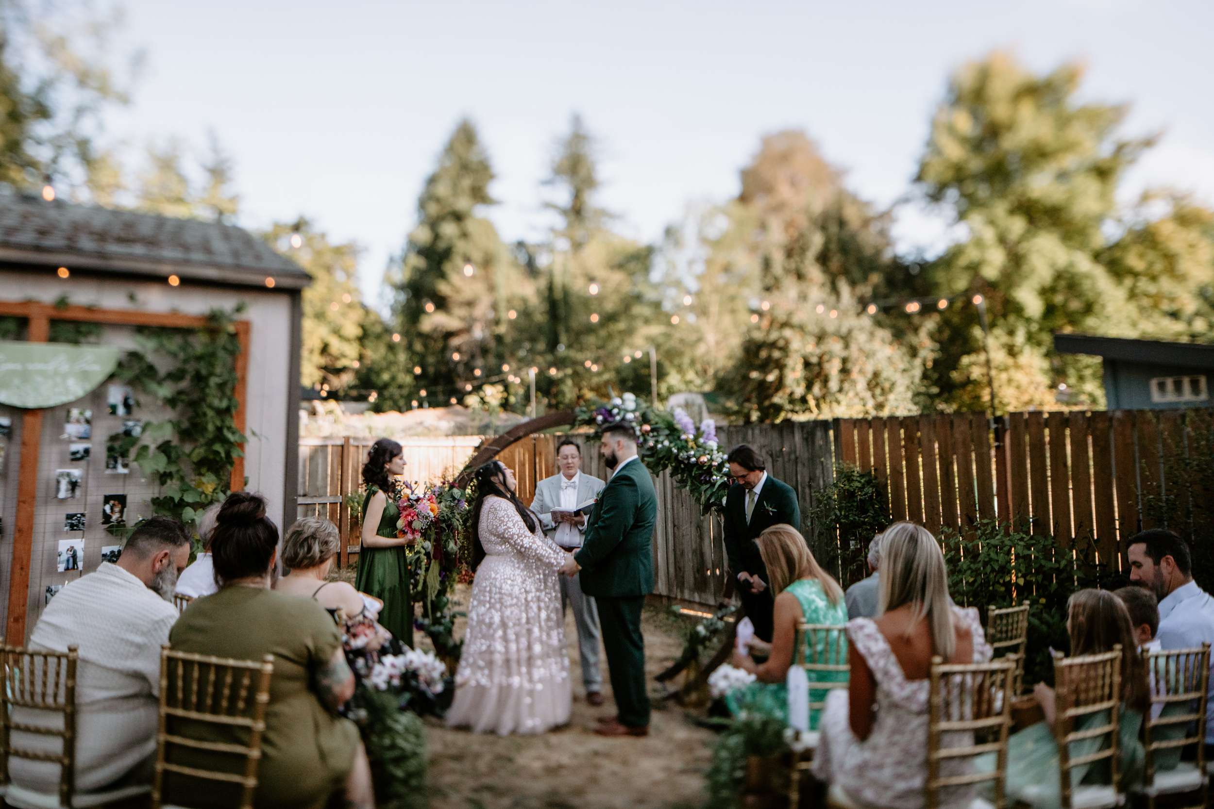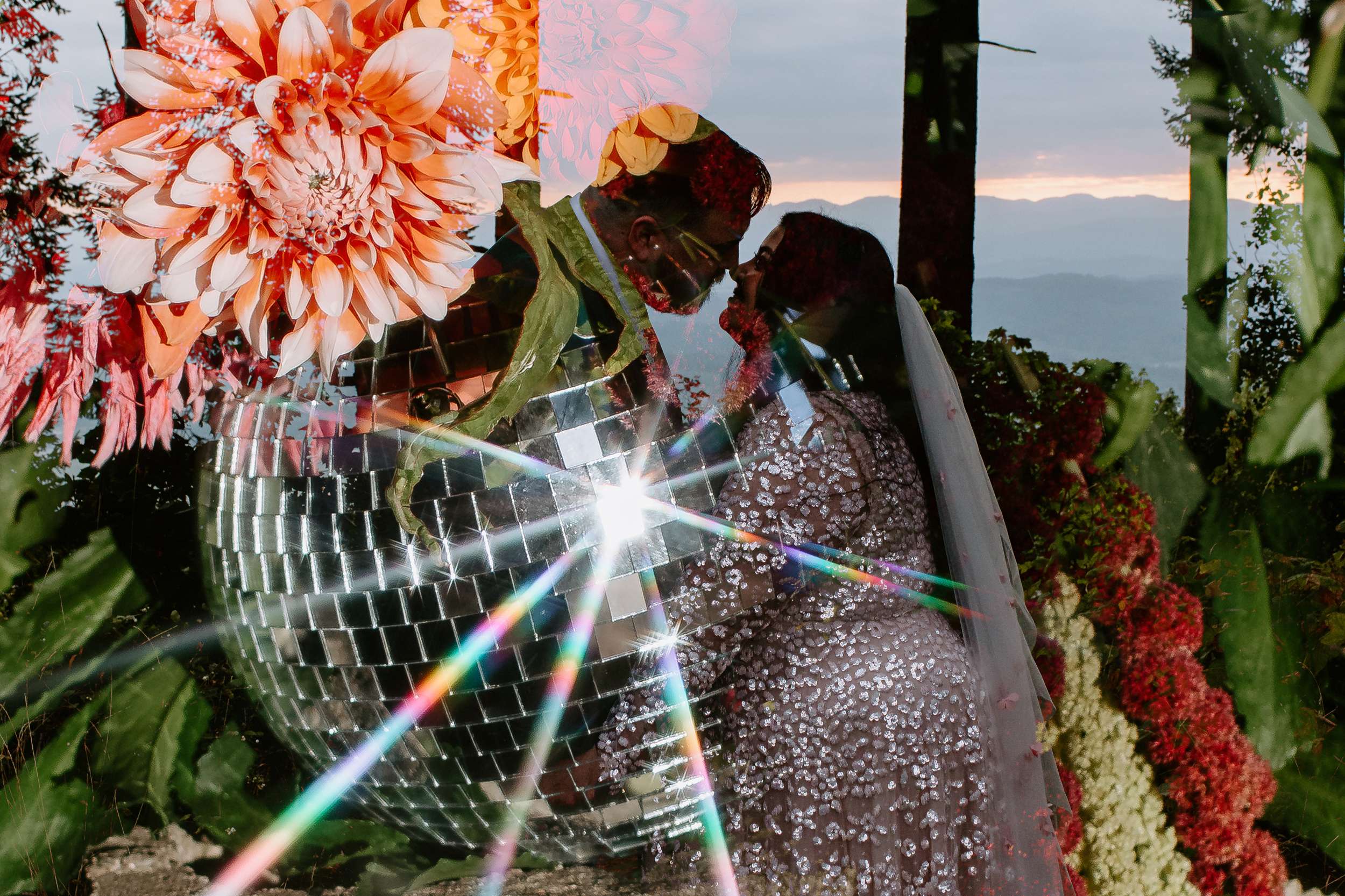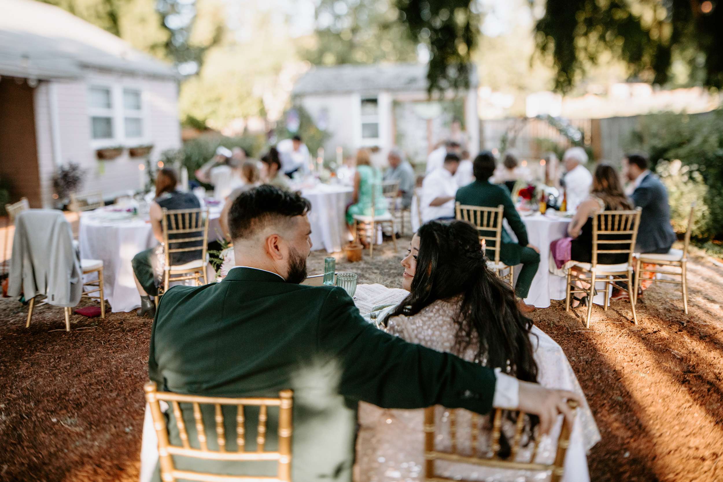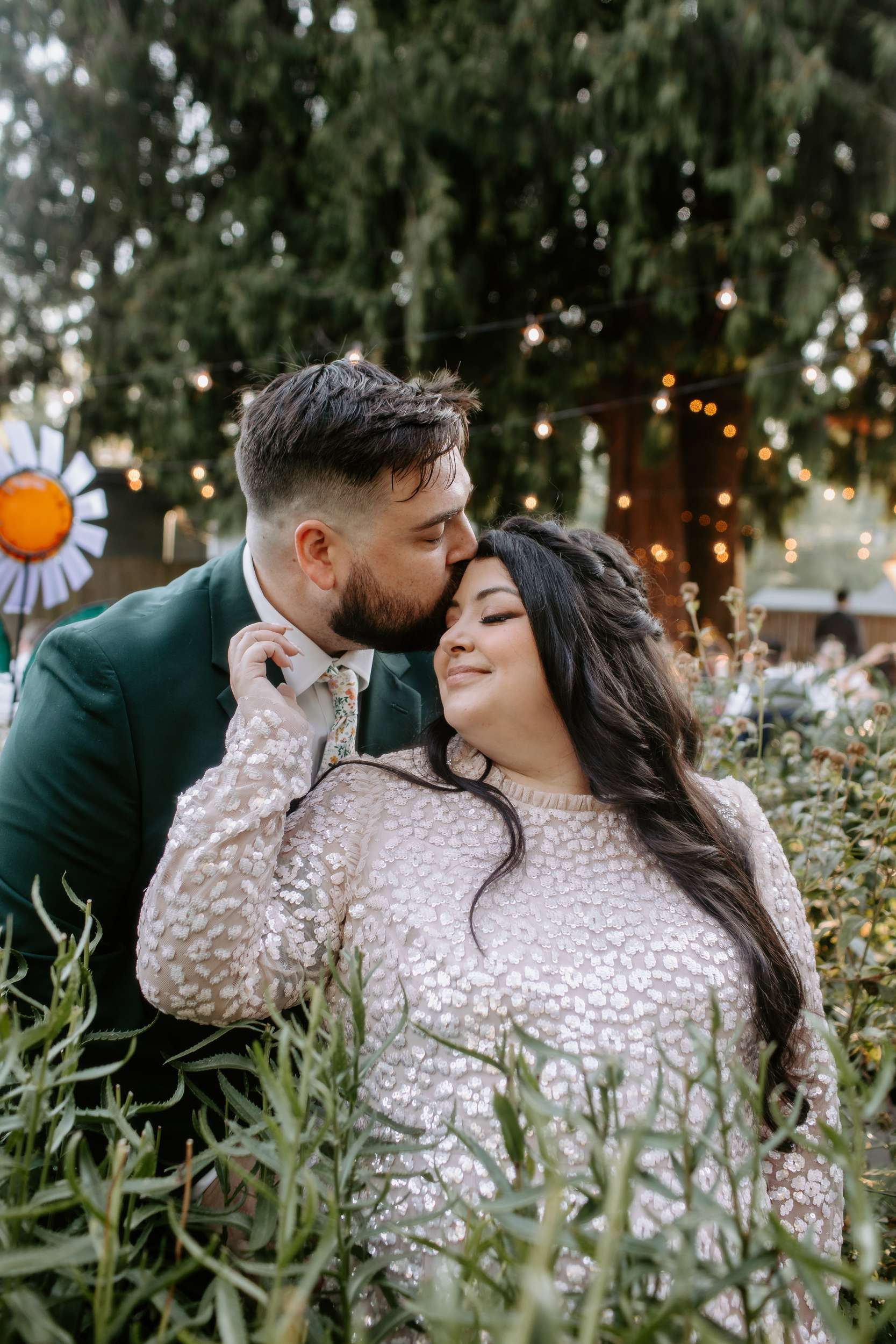 Their wedding was a whimsical garden party dream come true. Merritt and Brady filled a friend’s back garden with twinkly lights, disco balls, and so many flowers that it felt like stepping into a fairytale. What started as a plan to elope turned into a backyard celebration, thanks to dear friends who offered to host them. They spent four months pouring love (and a lot of labour) into making it perfect.