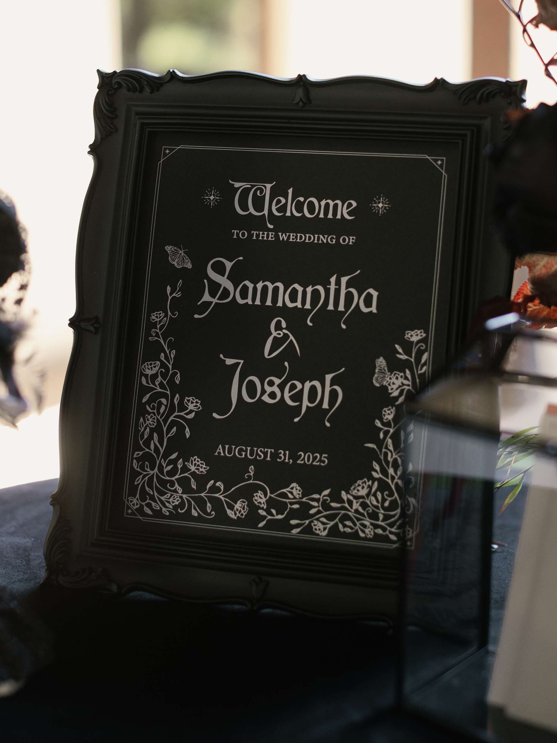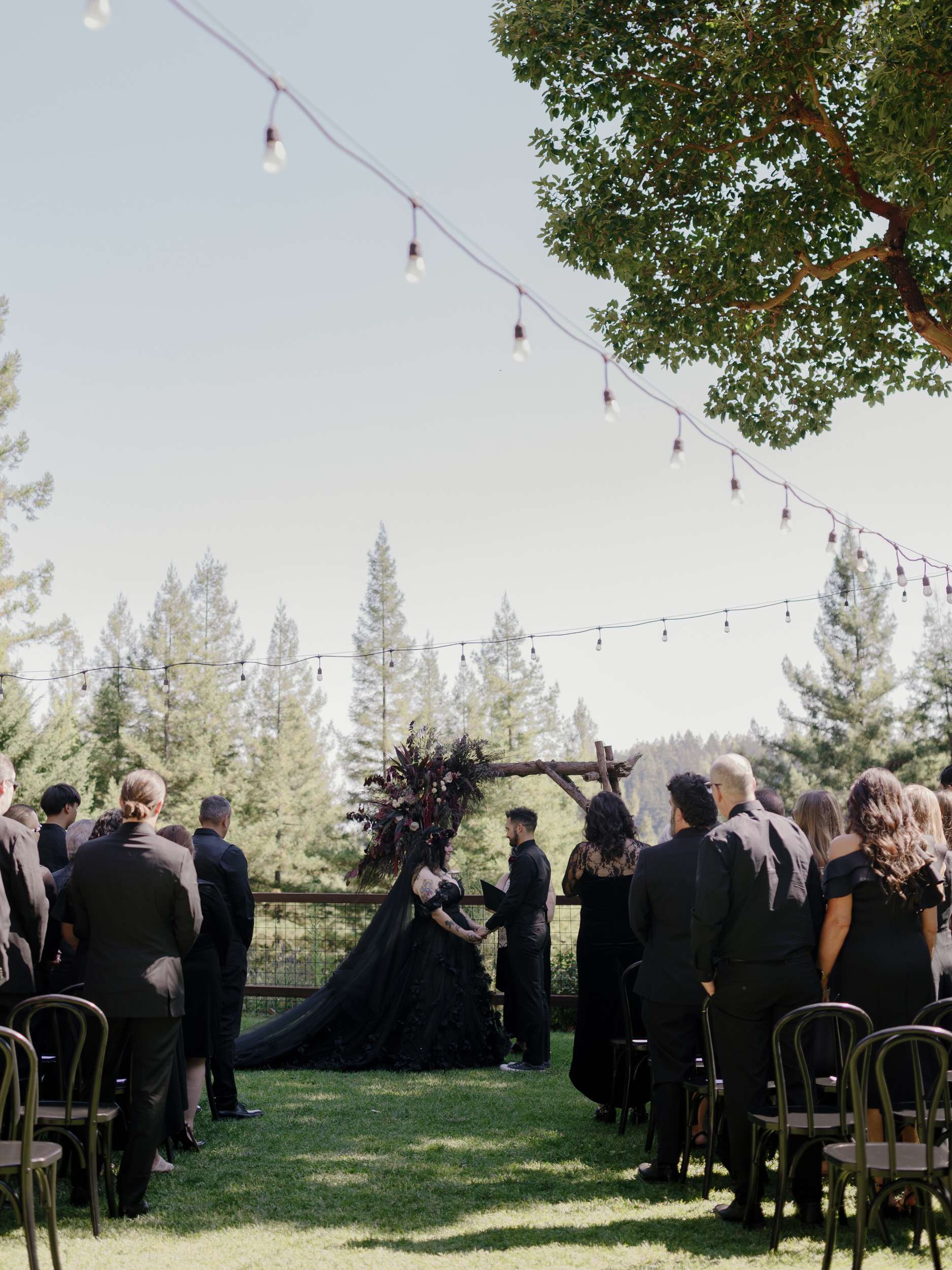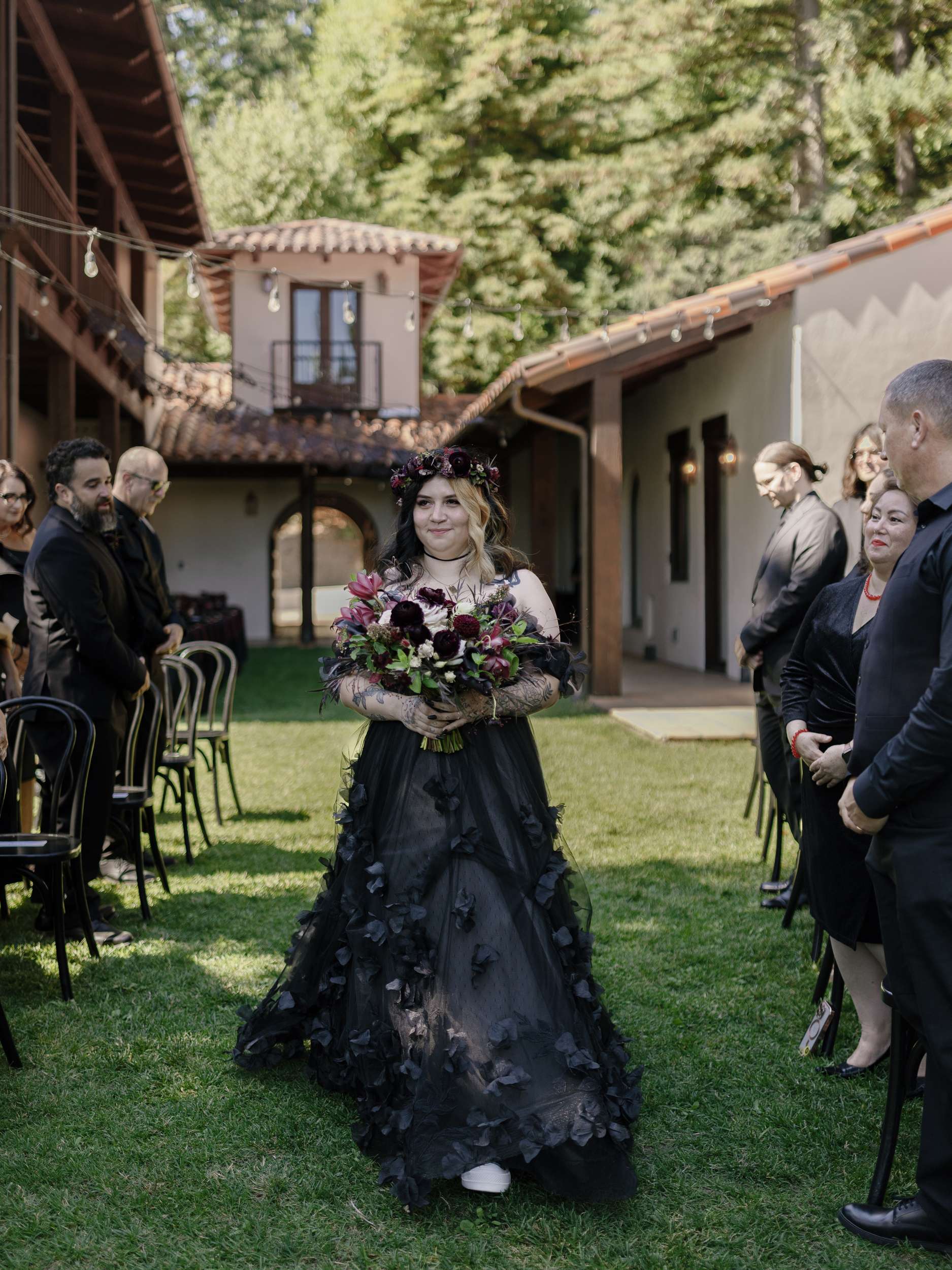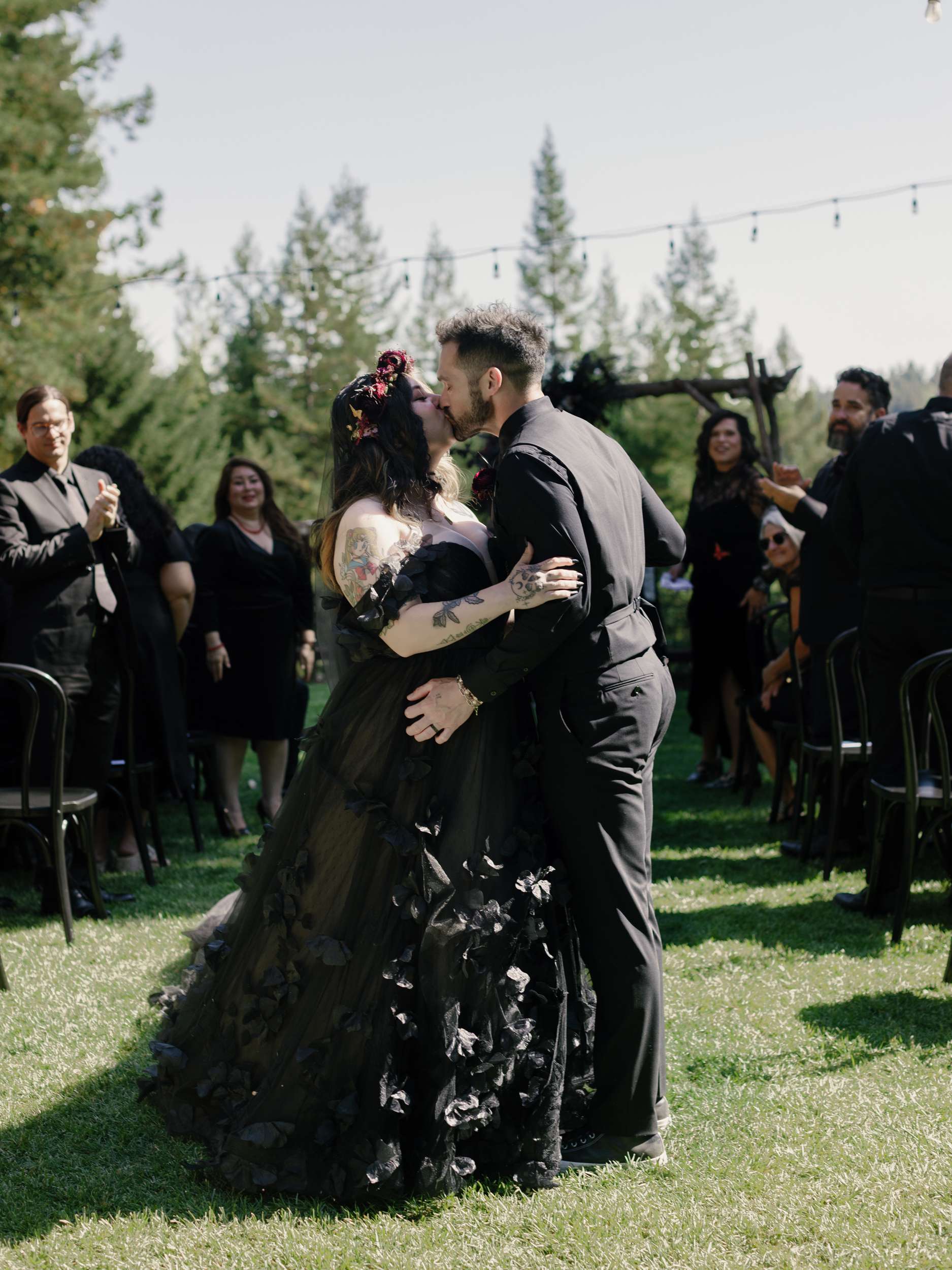 For Samantha and Joseph, the music came first. Blink 182, Bay Area hip hop, pop punk classics and heavy EDM shaped the atmosphere of their wedding before anyone even walked in. Every guest arrived in black and the couple wore black too. The florals carried dark tones with a hit of mint as a nod to their matching tattoos.