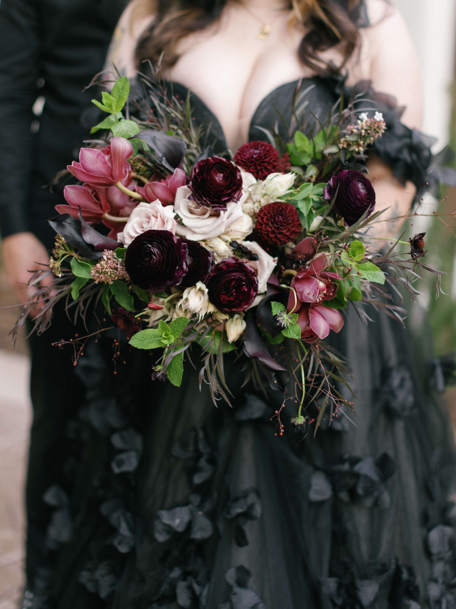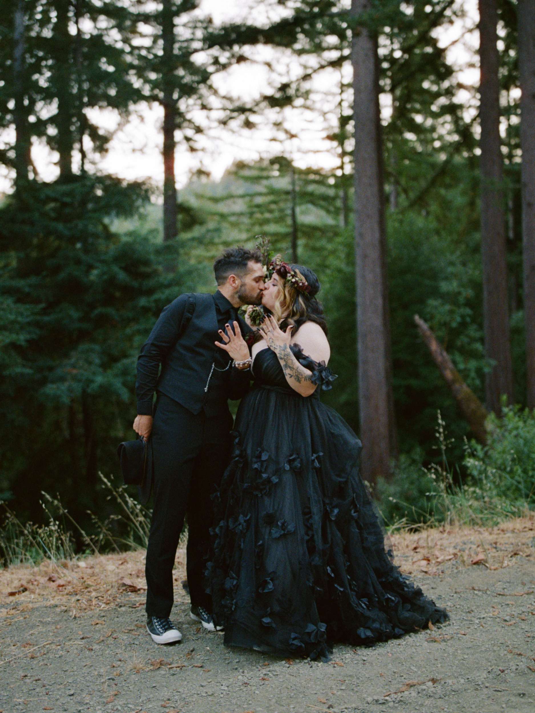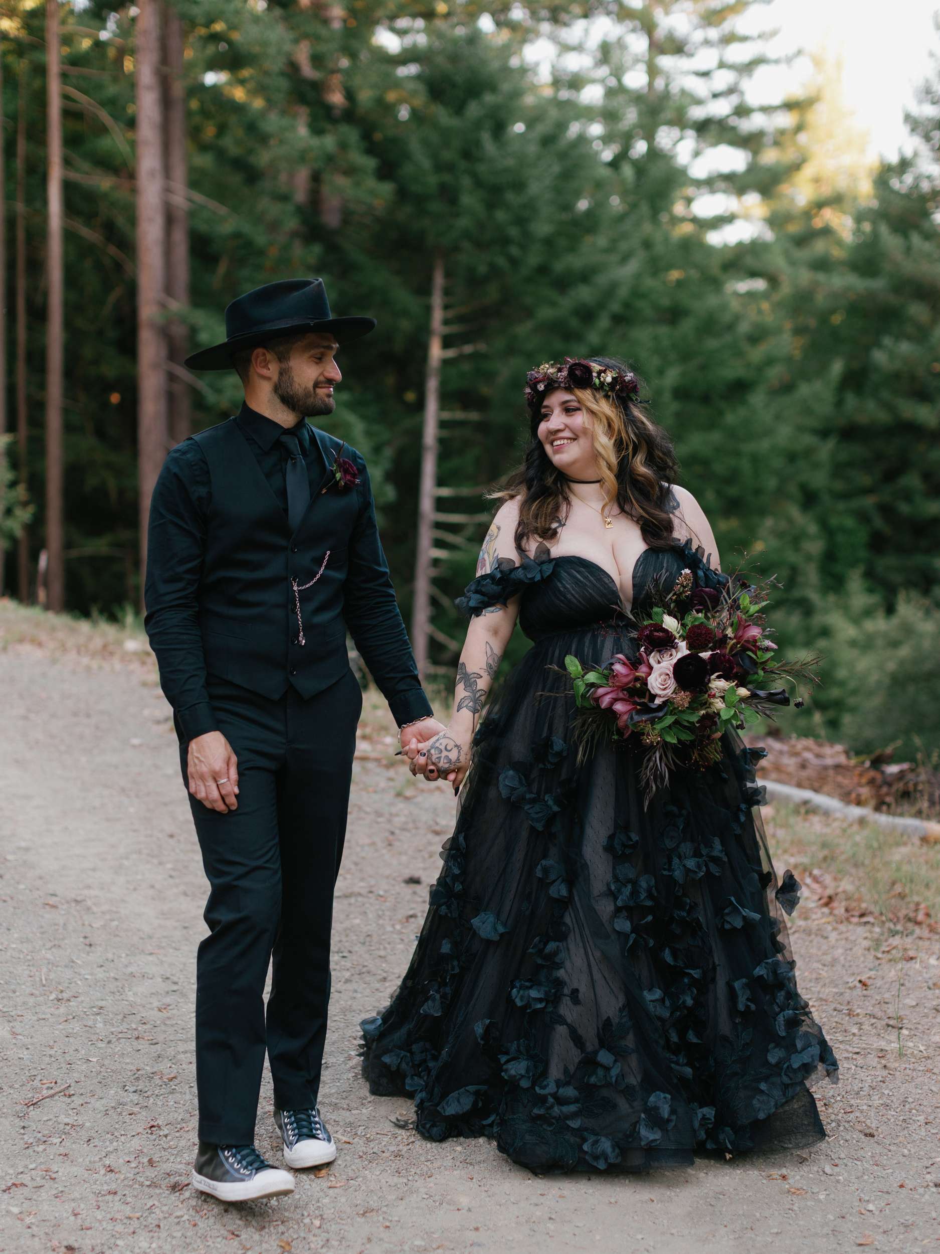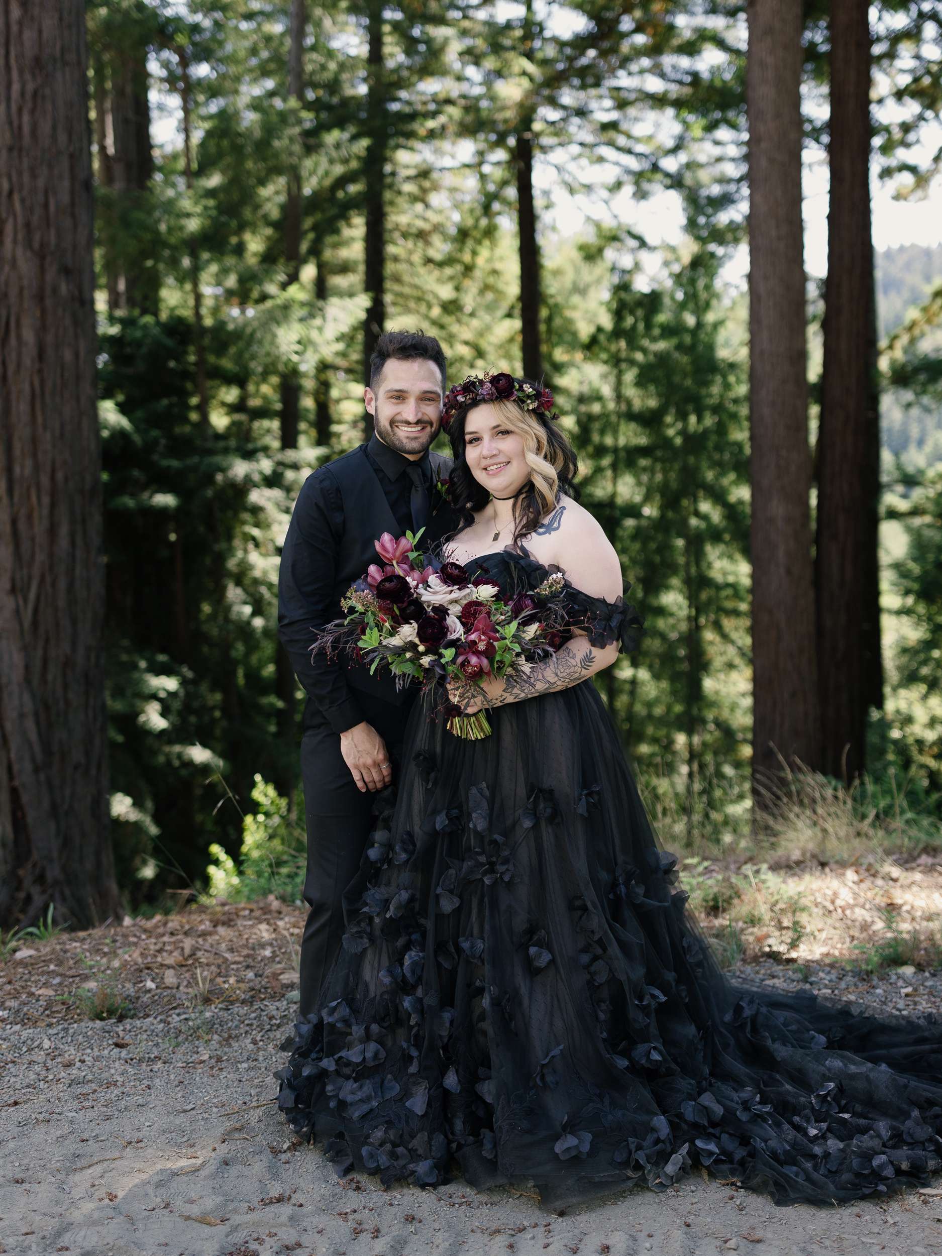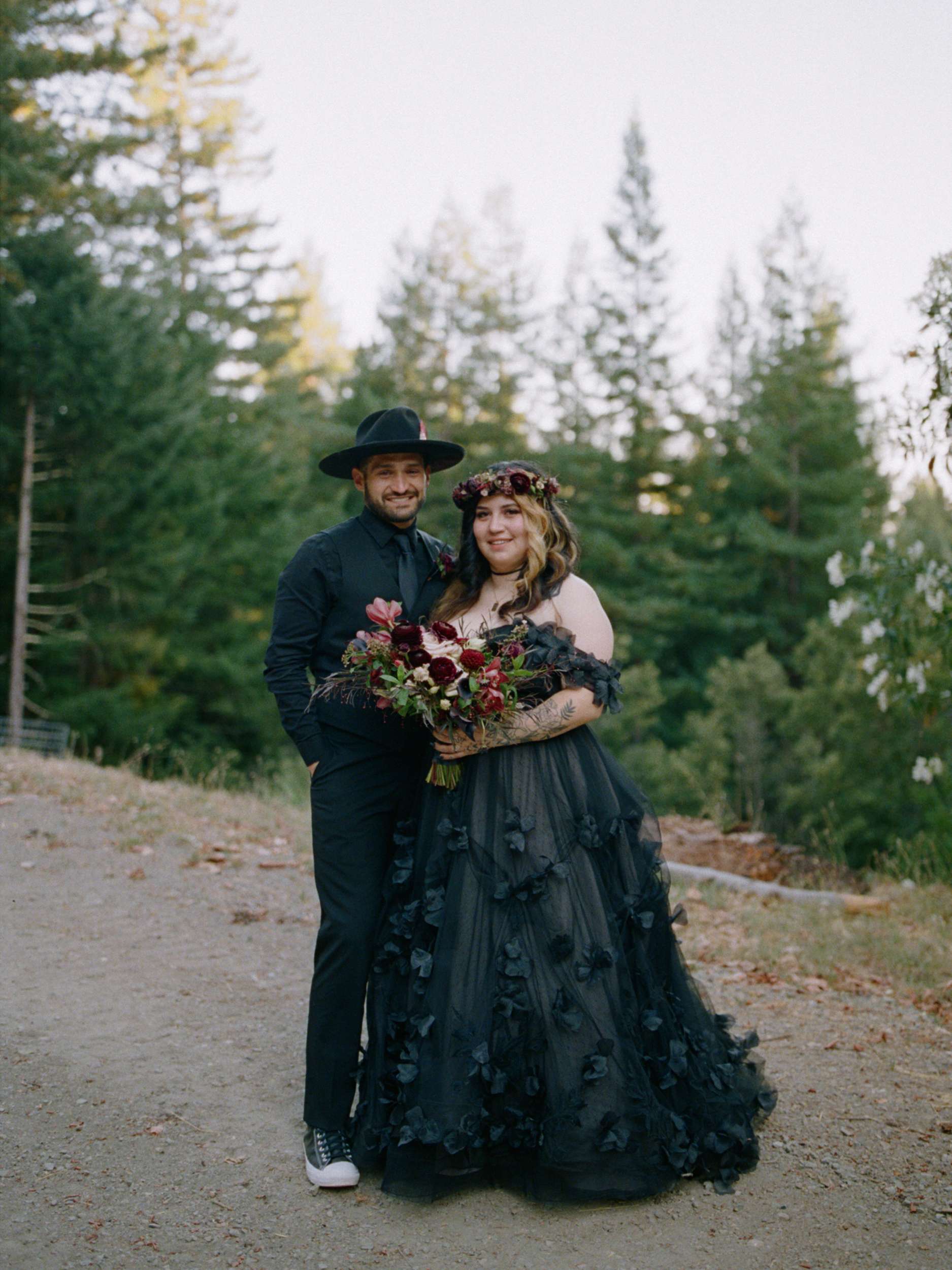 For Samantha and Joseph, the music came first. Blink 182, Bay Area hip hop, pop punk classics and heavy EDM shaped the atmosphere of their wedding before anyone even walked in. Every guest arrived in black and the couple wore black too. The florals carried dark tones with a hit of mint as a nod to their matching tattoos.