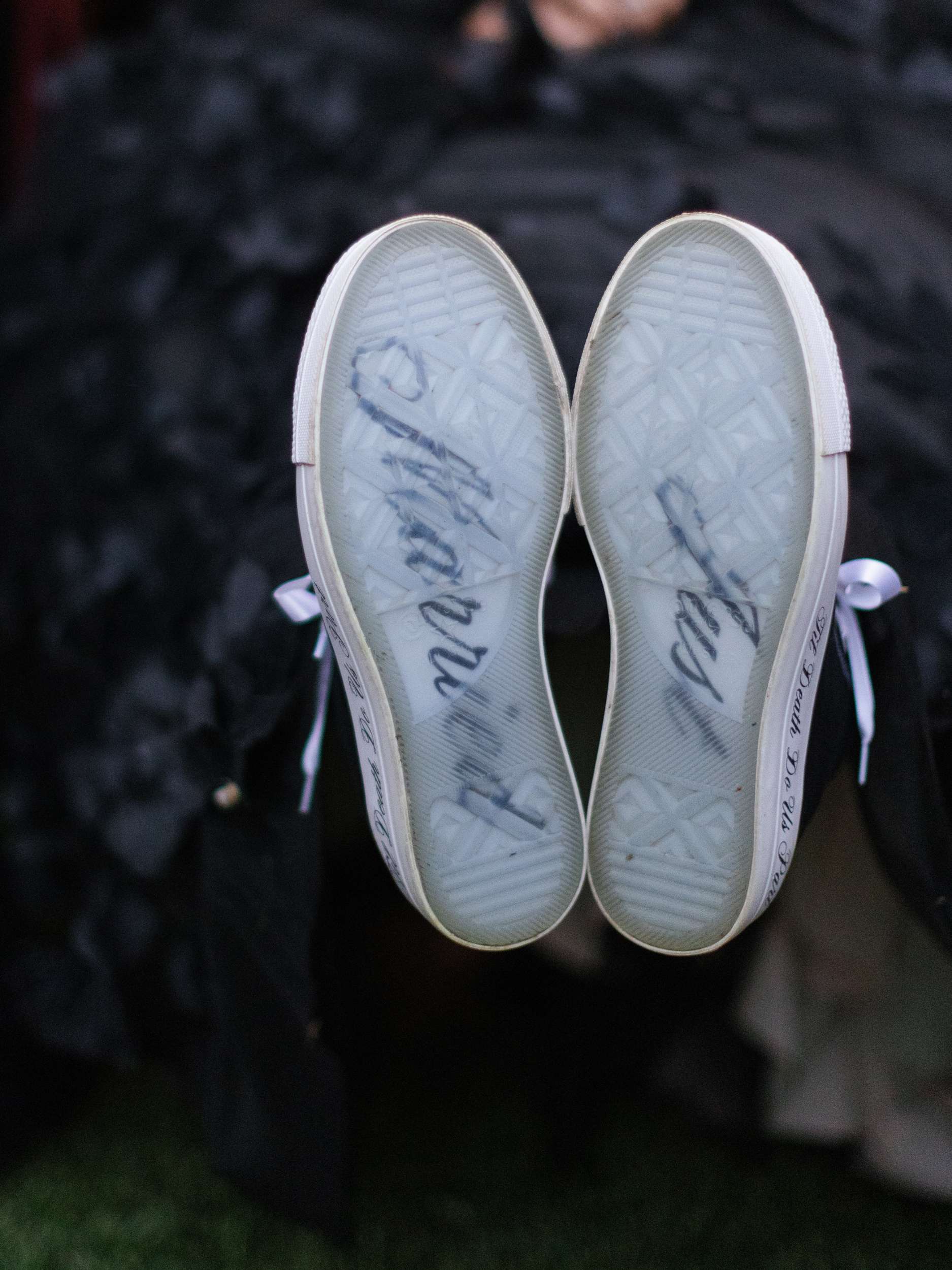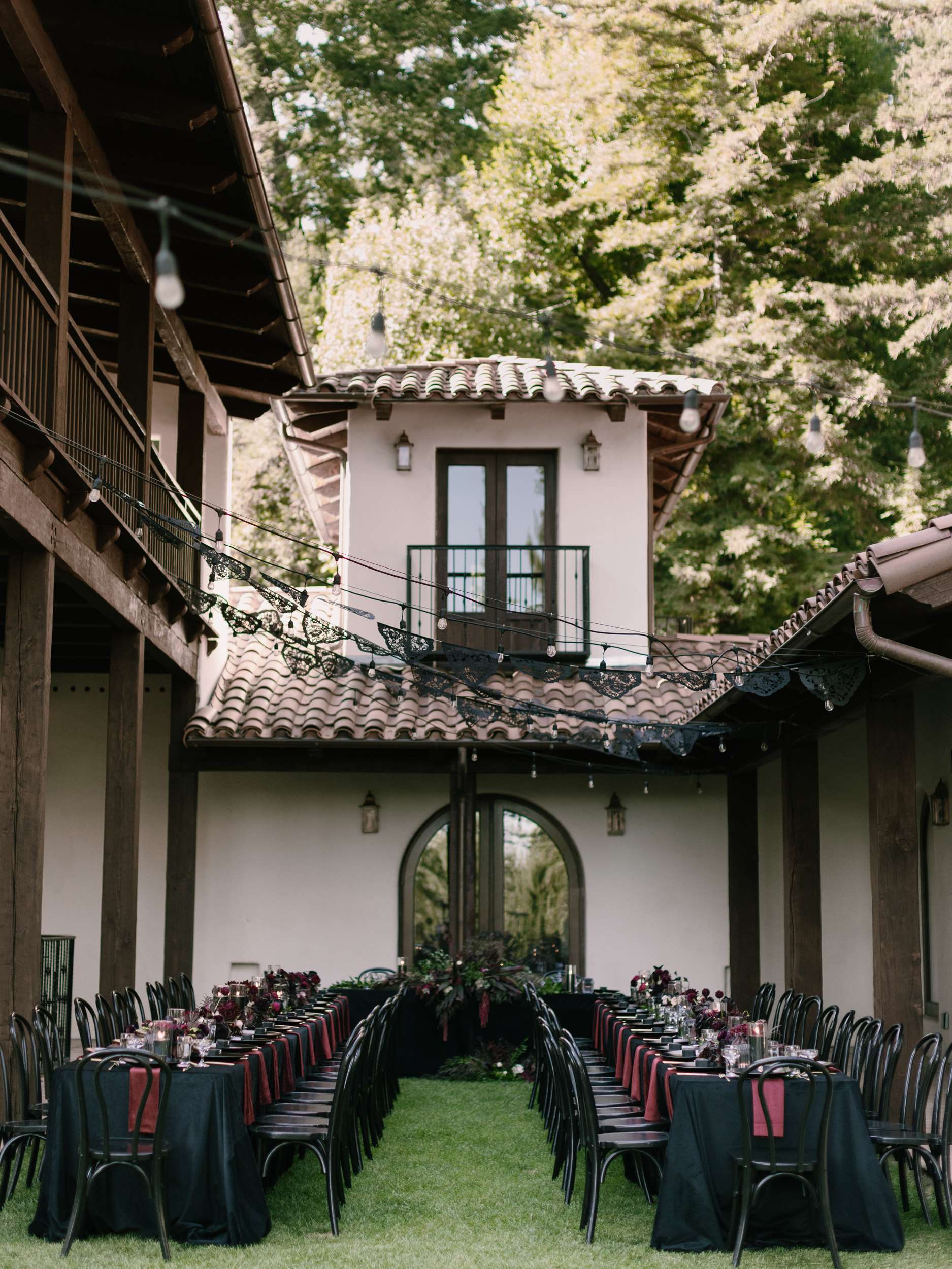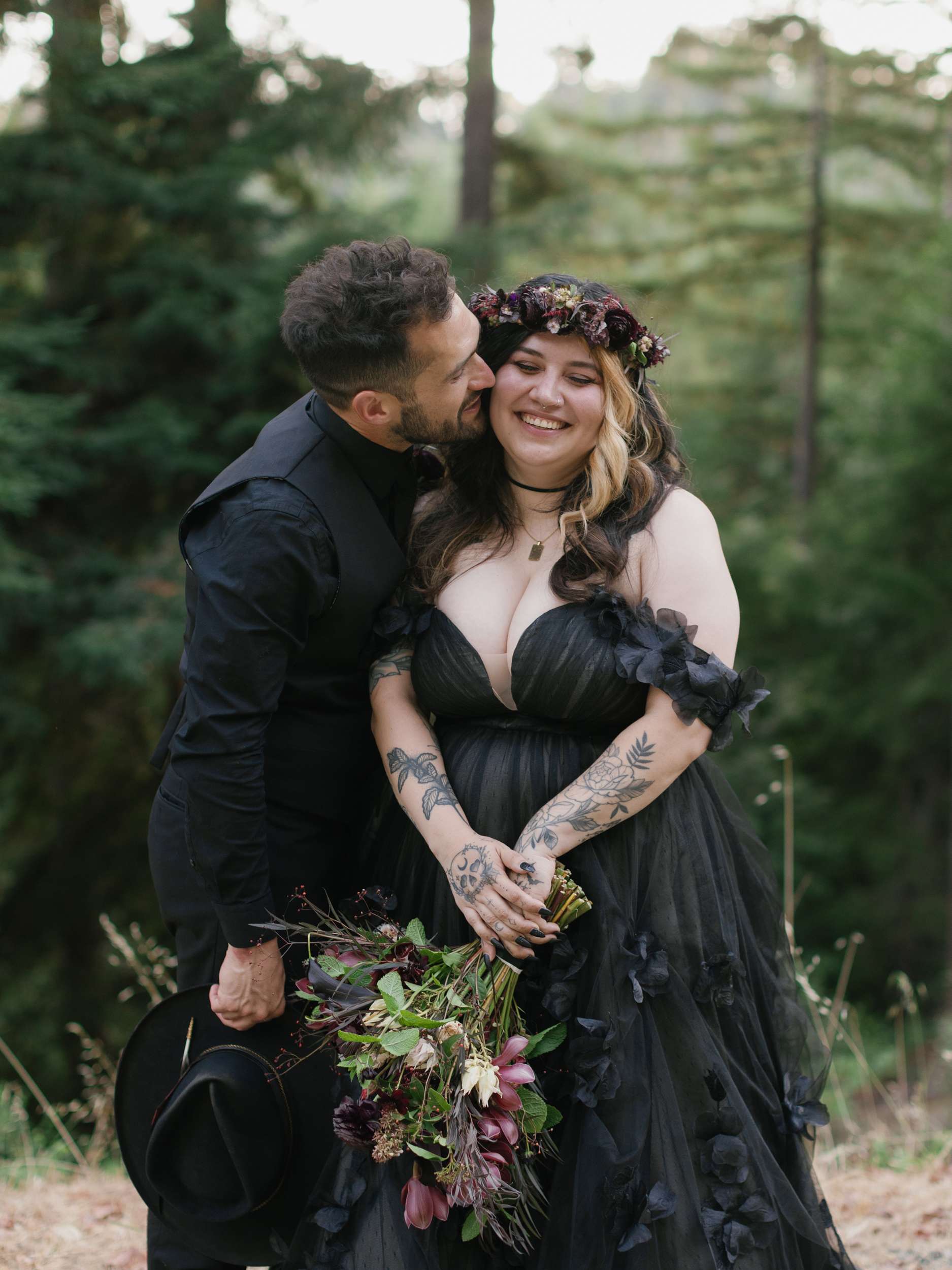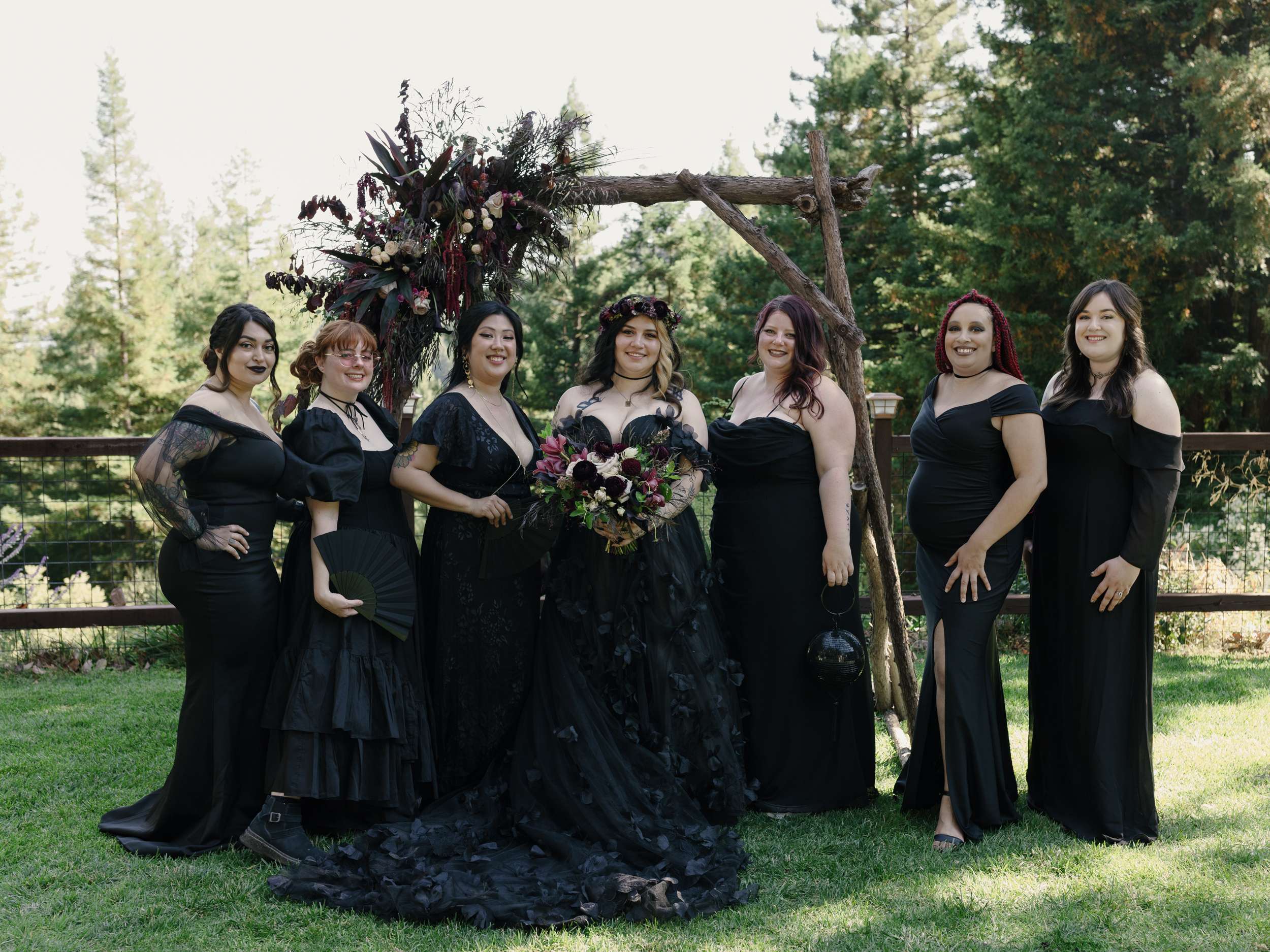 For Samantha and Joseph, the music came first. Blink 182, Bay Area hip hop, pop punk classics and heavy EDM shaped the atmosphere of their wedding before anyone even walked in. Every guest arrived in black and the couple wore black too. The florals carried dark tones with a hit of mint as a nod to their matching tattoos.