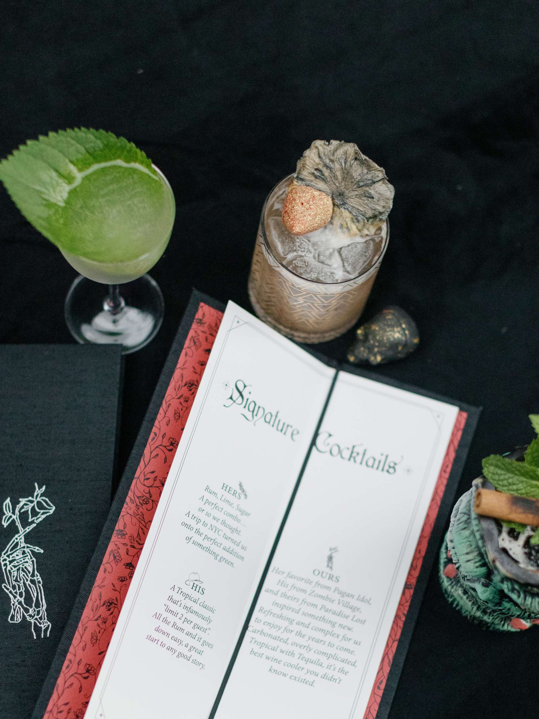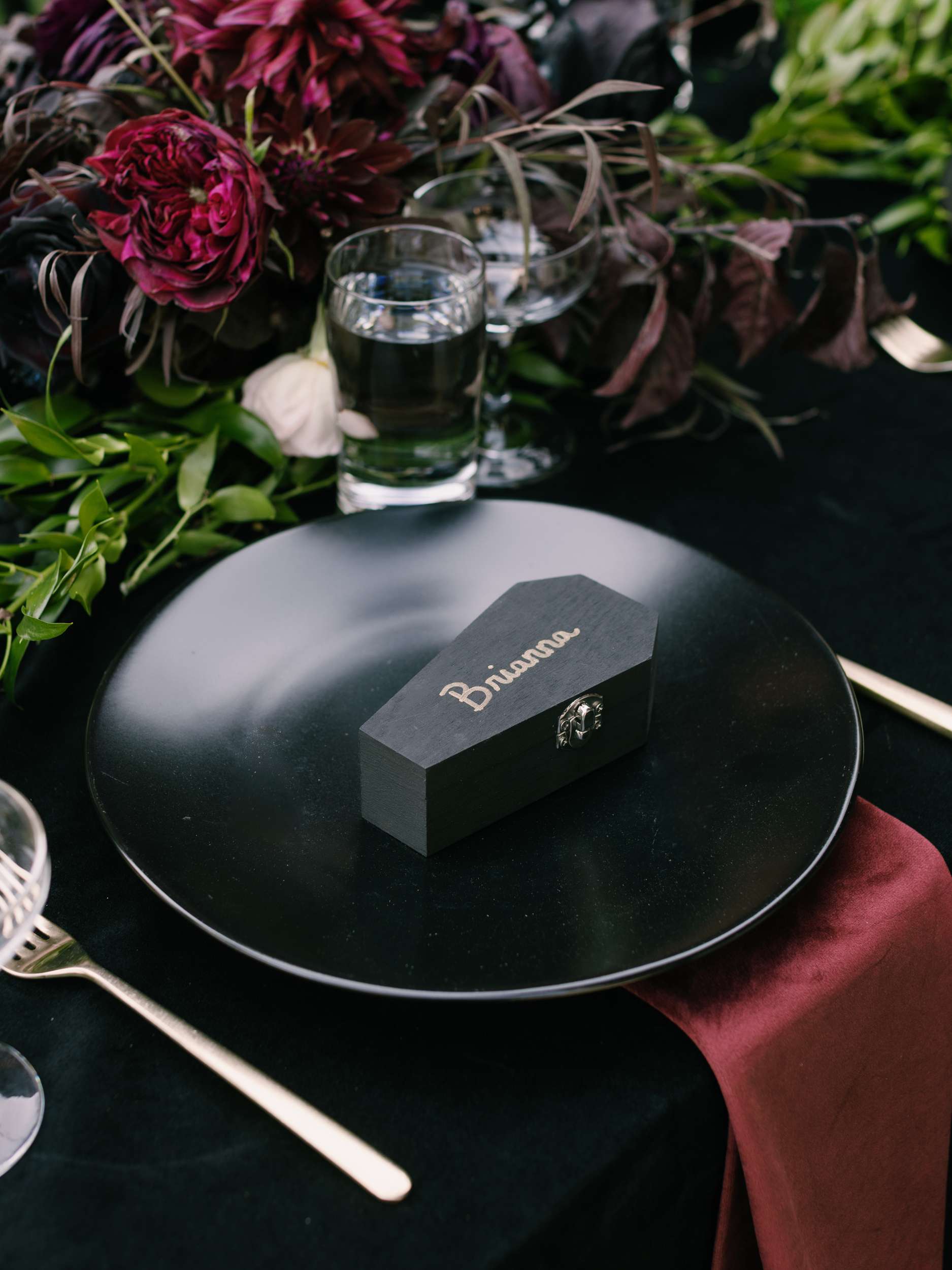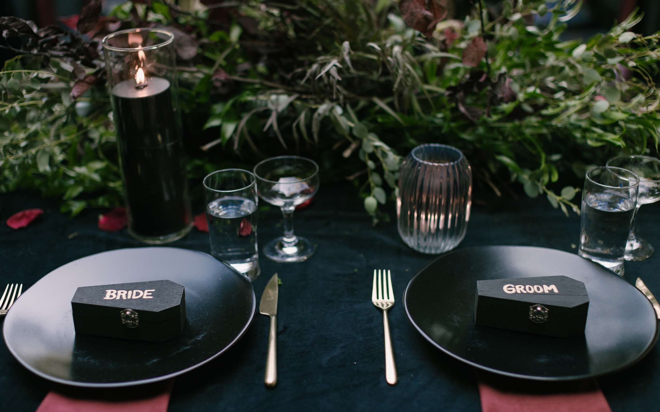Their favourite part of planning was the aesthetics. They had lots of skull décor and DIY coffins for place settings. “We really enjoyed focusing on the specific, personalised things that made the day ours. Picking out a mix of music we both love for the playlist. Creating DIY touches like the skulls at the altar and coffin place settings. Creating the cocktail menu and the testing that went into the drinks. Creating the custom wedding favours which included cups, pins and stickers.”