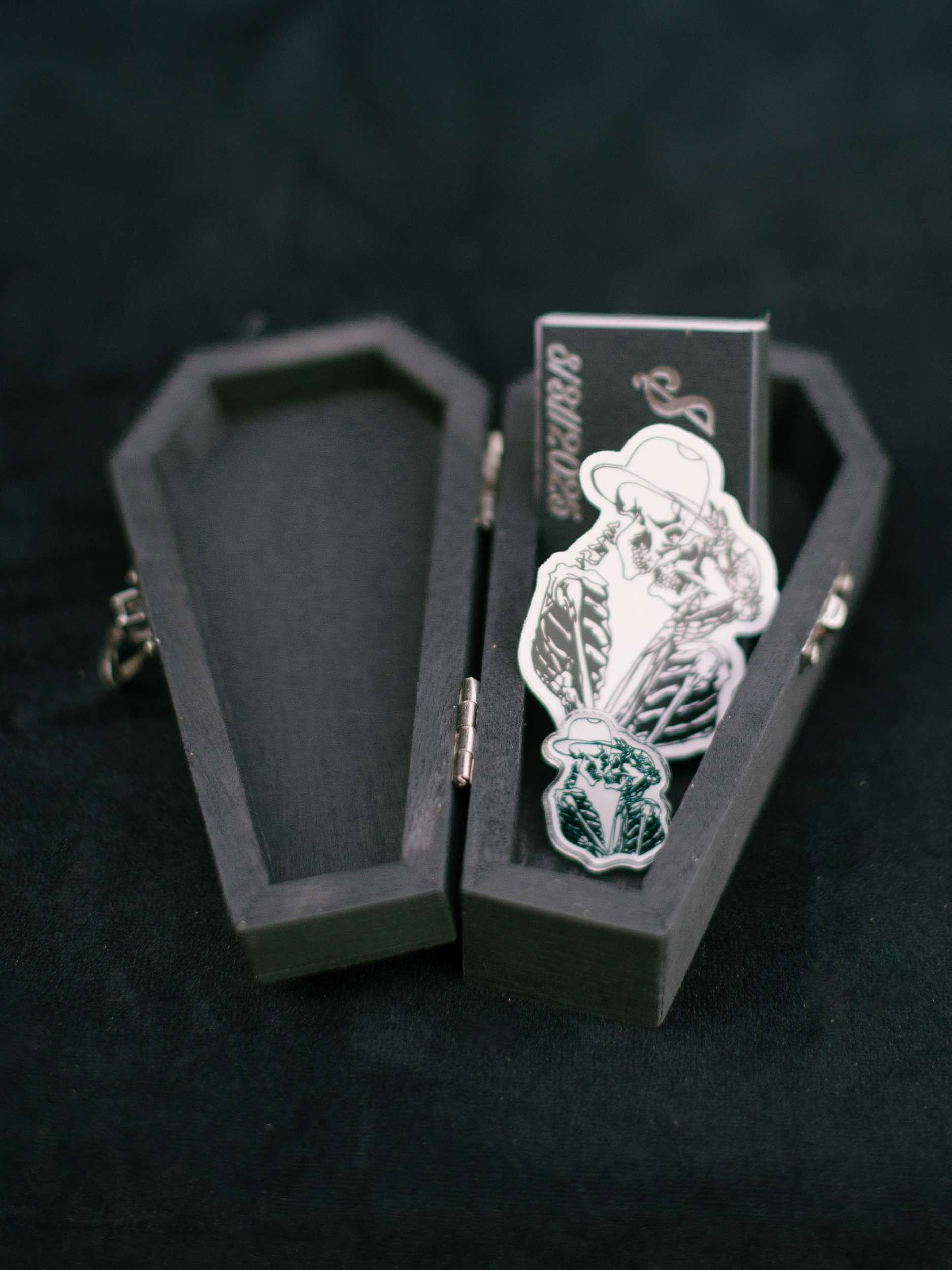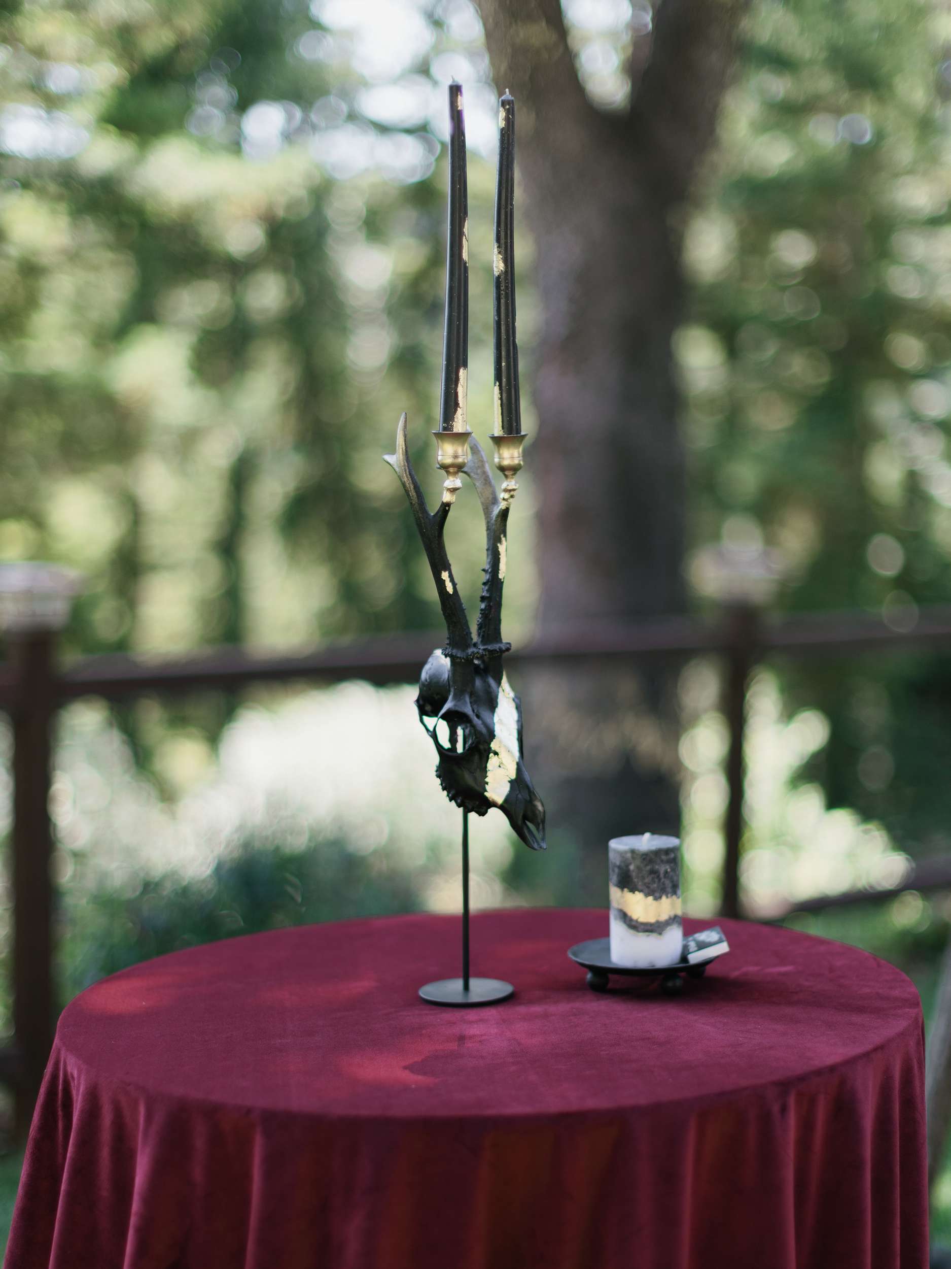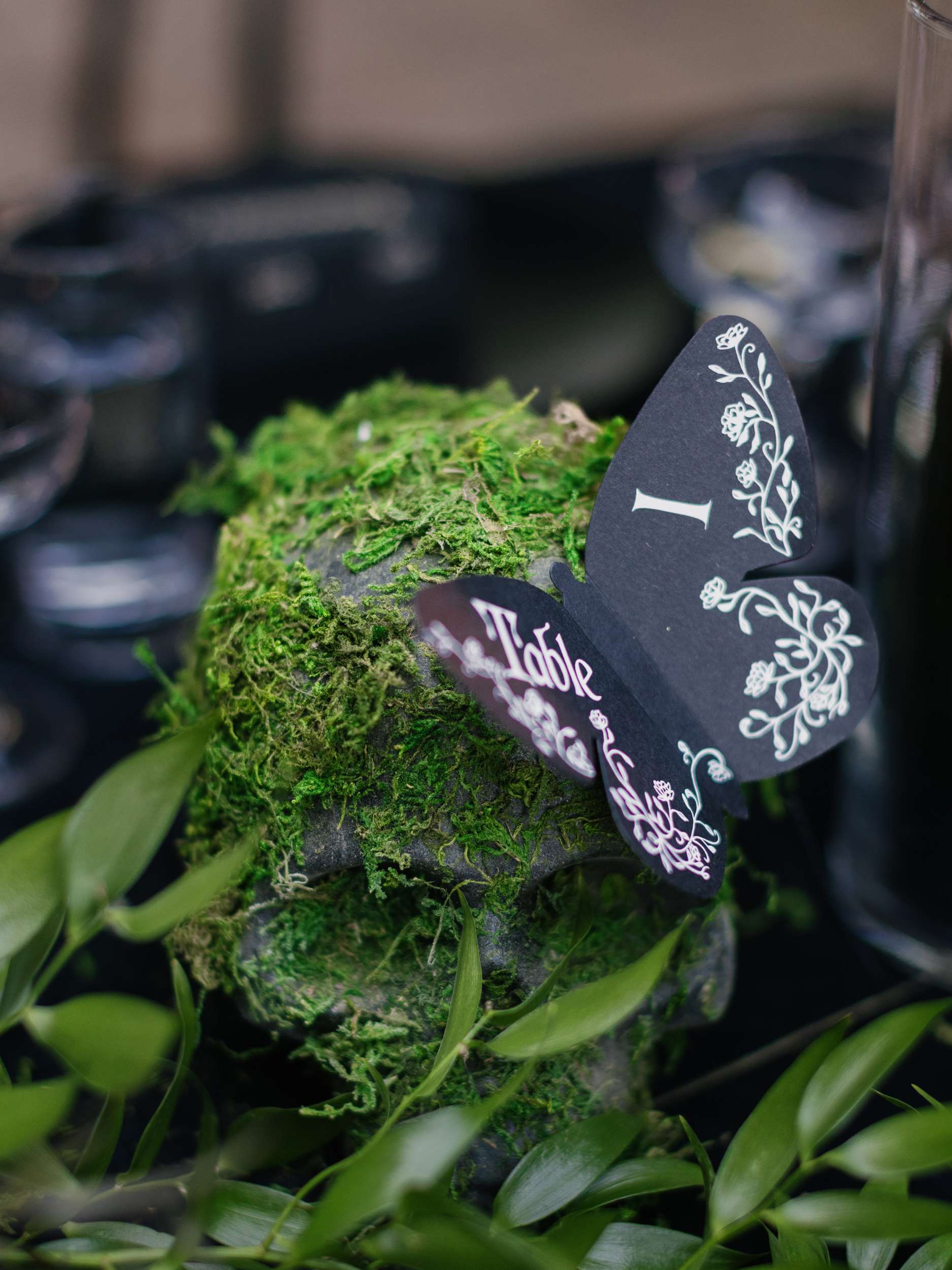 Their favourite part of planning was the aesthetics. They had lots of skull décor and DIY coffins for place settings. “We really enjoyed focusing on the specific, personalised things that made the day ours. Picking out a mix of music we both love for the playlist. Creating DIY touches like the skulls at the altar and coffin place settings. Creating the cocktail menu and the testing that went into the drinks. Creating the custom wedding favours which included cups, pins and stickers.”