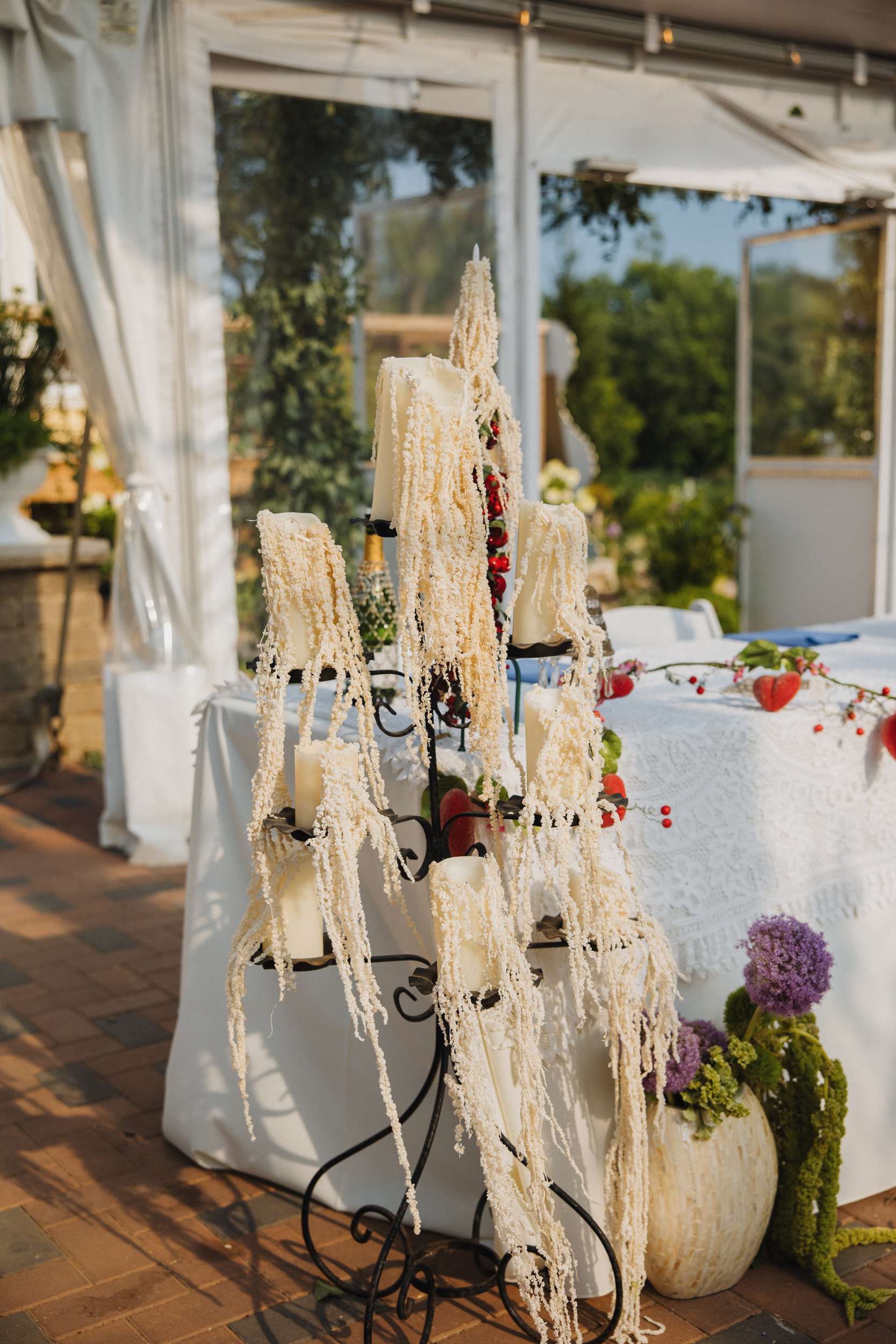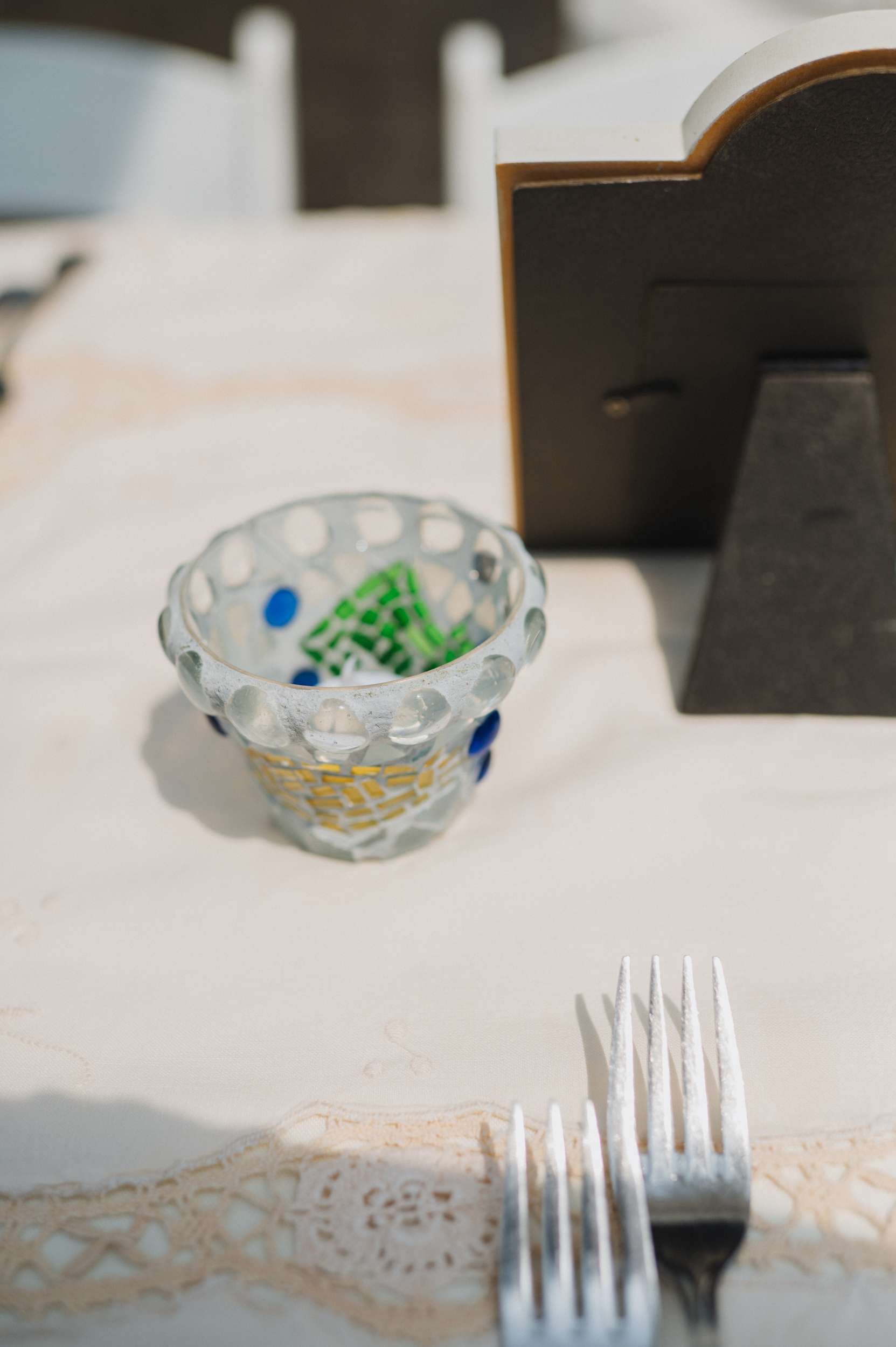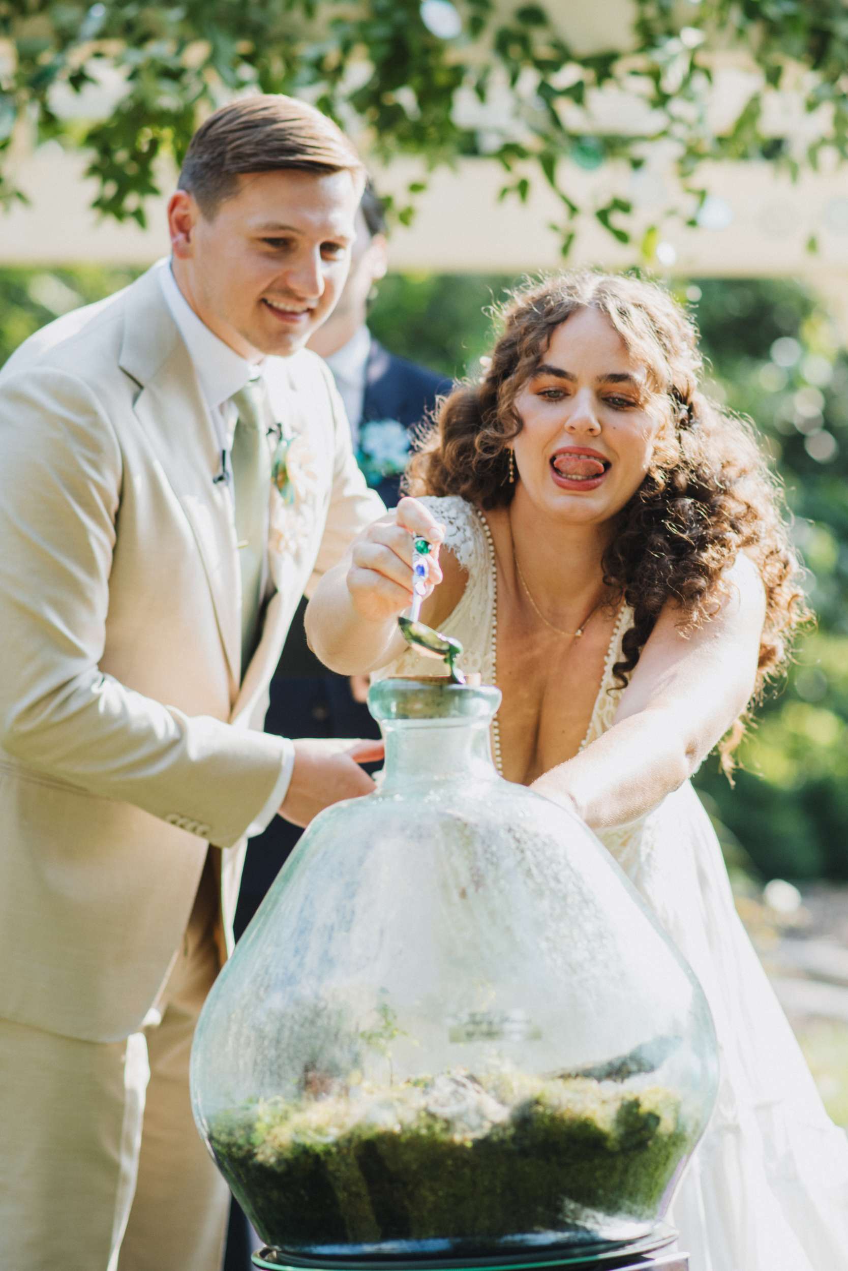 Instead of a more usual sand ceremony, the couple put together a terrarium, which they called Terra d’Amore. They filled it with moss from their venue, their joint hen/stag trip, the river where they white-water rafted, their apartments, and the bride’s mum’s house. The terrarium closing ritual ended in a wax seal during the ceremony. “Our vows were perfect”, she remembered. “We have been together for seven years so it’s hard to say things you don’t already say on a daily basis. It was such a special moment publicly declaring our love to one another while speaking so intimately.”