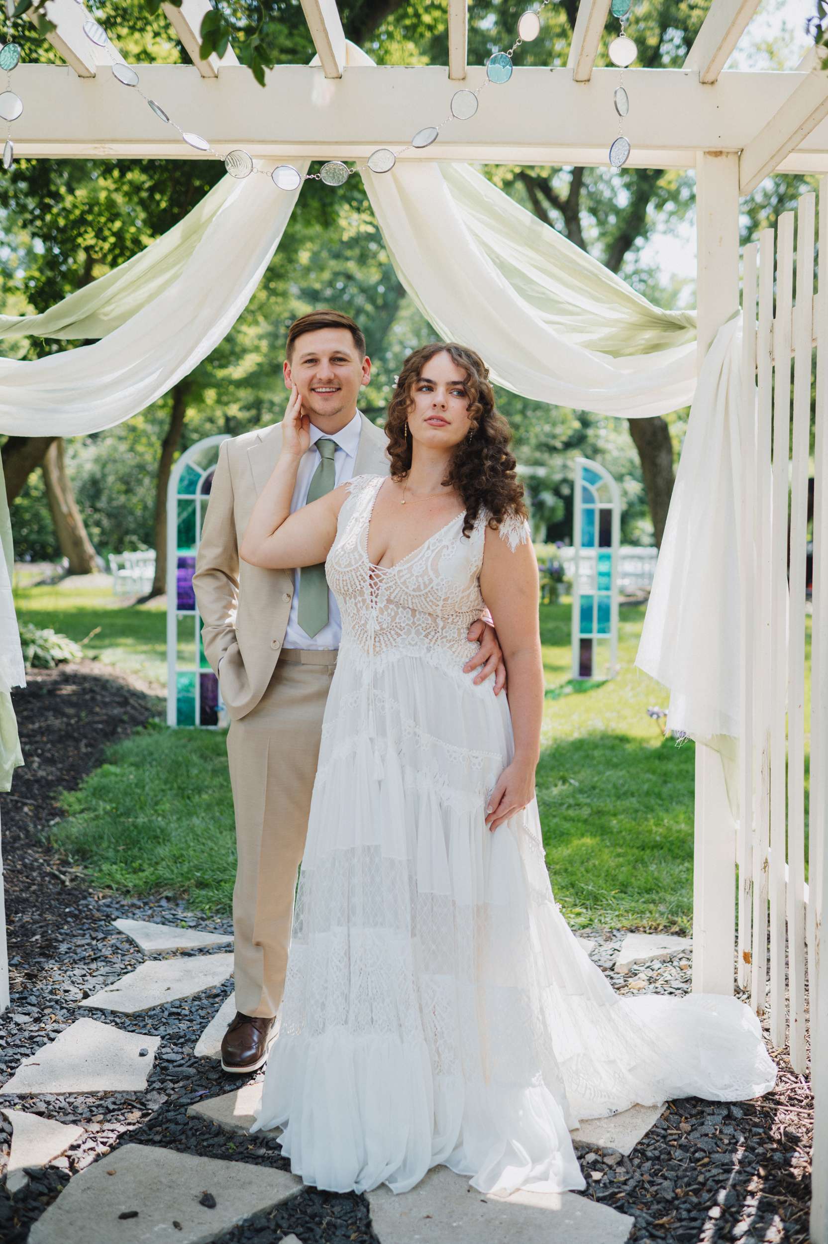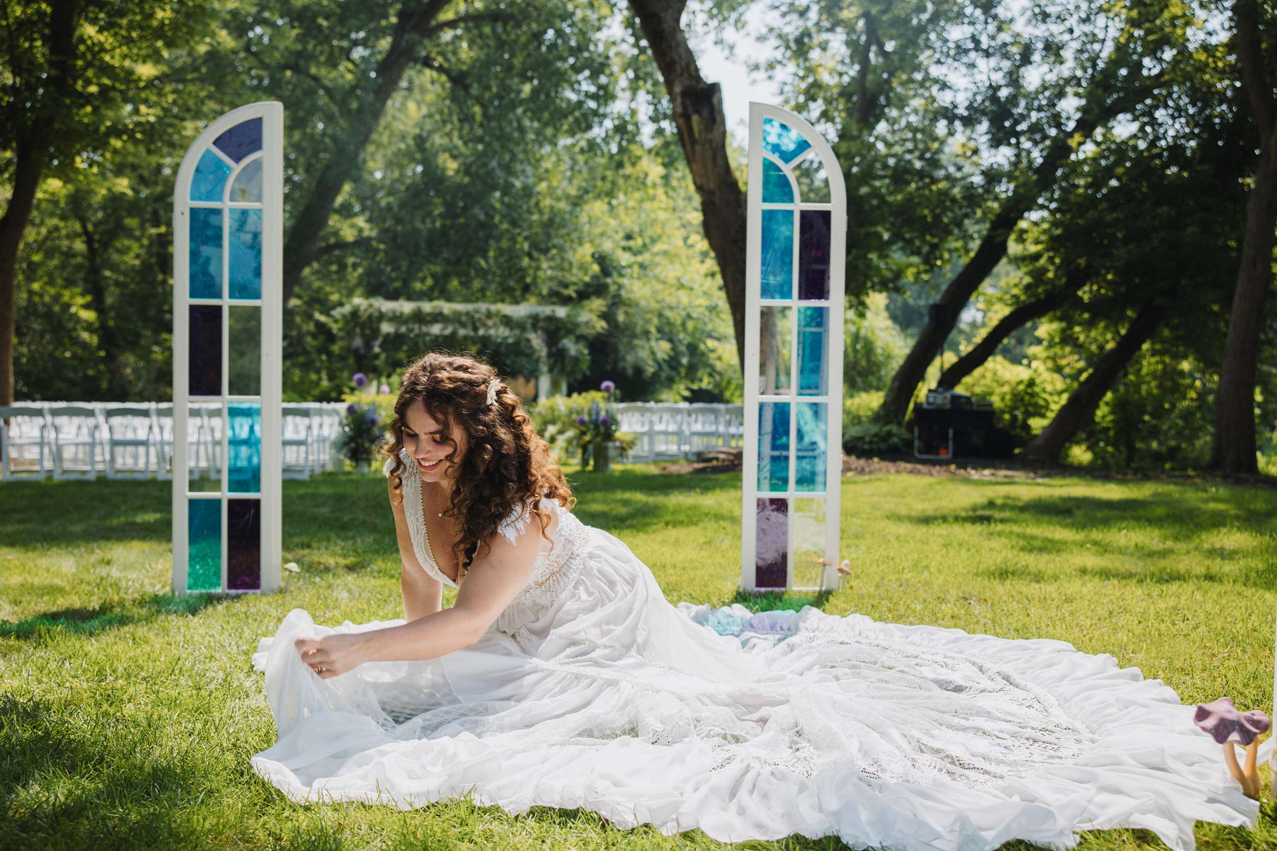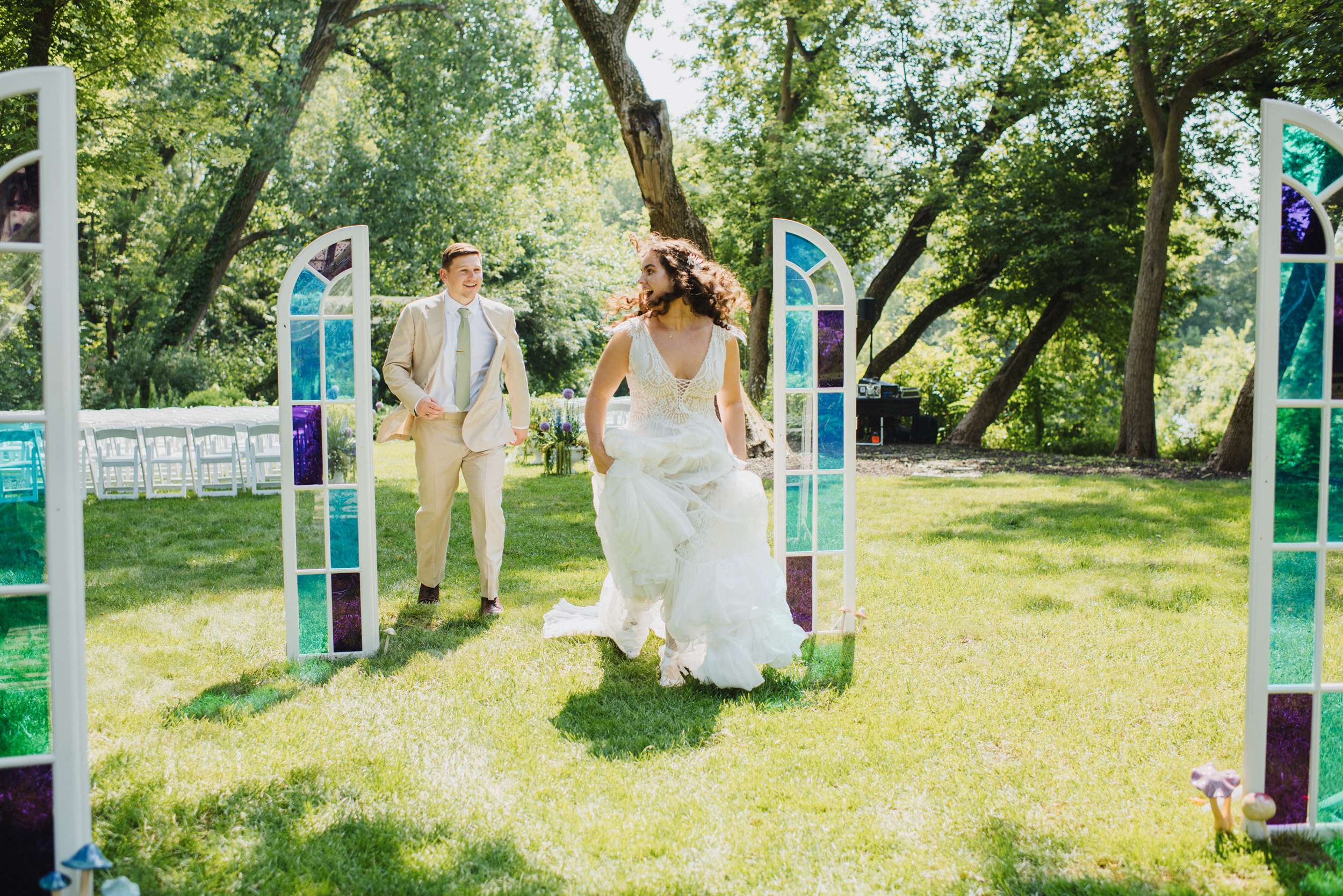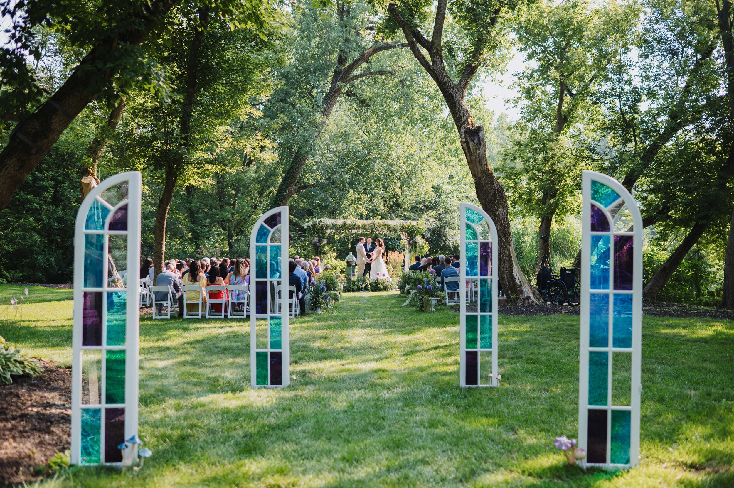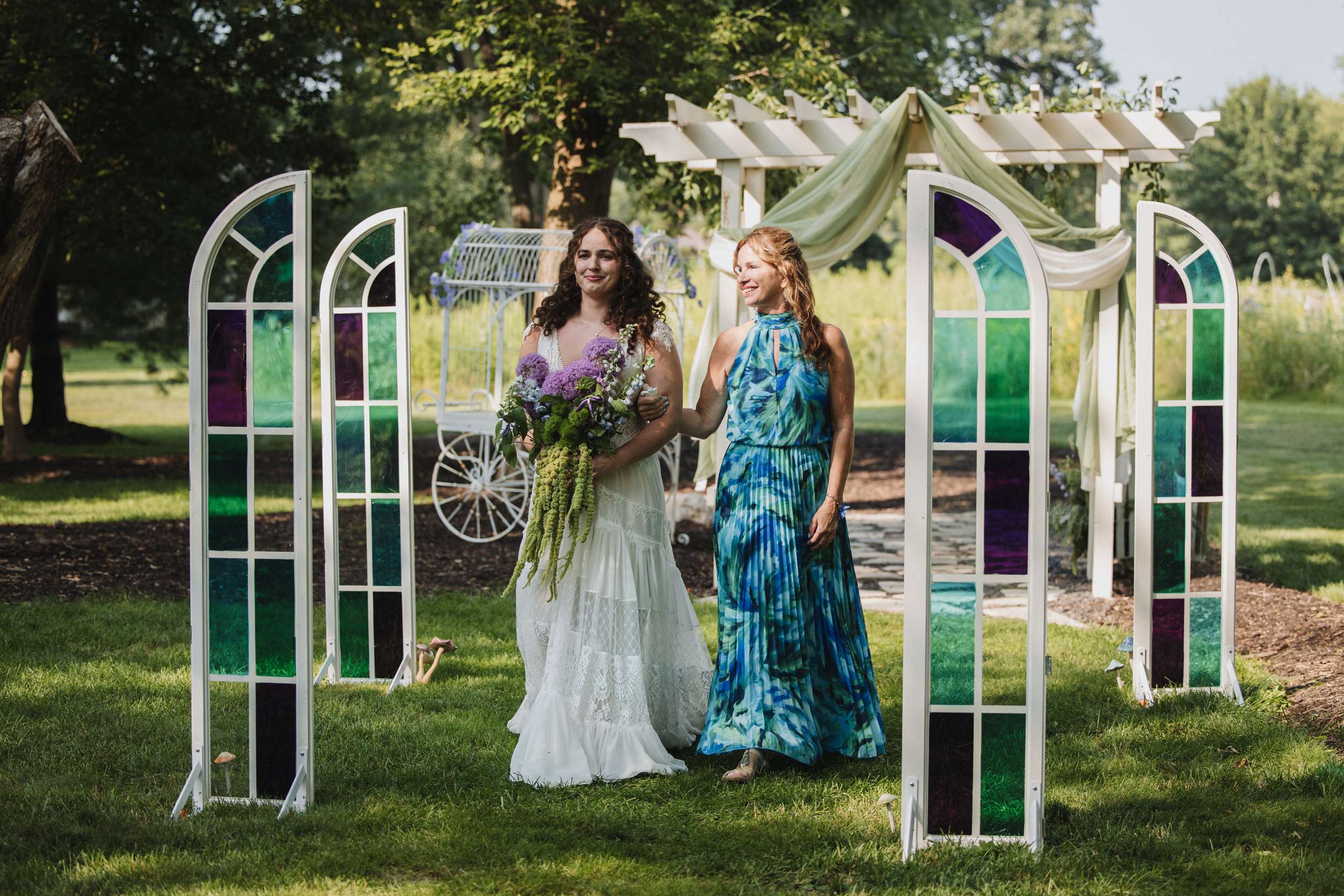 Mia and Jake arrived at their Illinois venue with two U-Hauls full of the bride’s creations to decorate the space. From the décor to the table plan, the flowers to the stained glass ceremony structures – she made it all herself. She had spent almost two years making the wedding by hand. Stained glass, thrifted lace, moss purses, fused flowers, watercolour name cards, terrariums, bouquets, signage, hair pieces, and décor for more than one hundred guests. She even did make-up and hair for herself, her mum, and the flower girl. Nothing about this day came from a shop. It all came from the art room in her apartment.