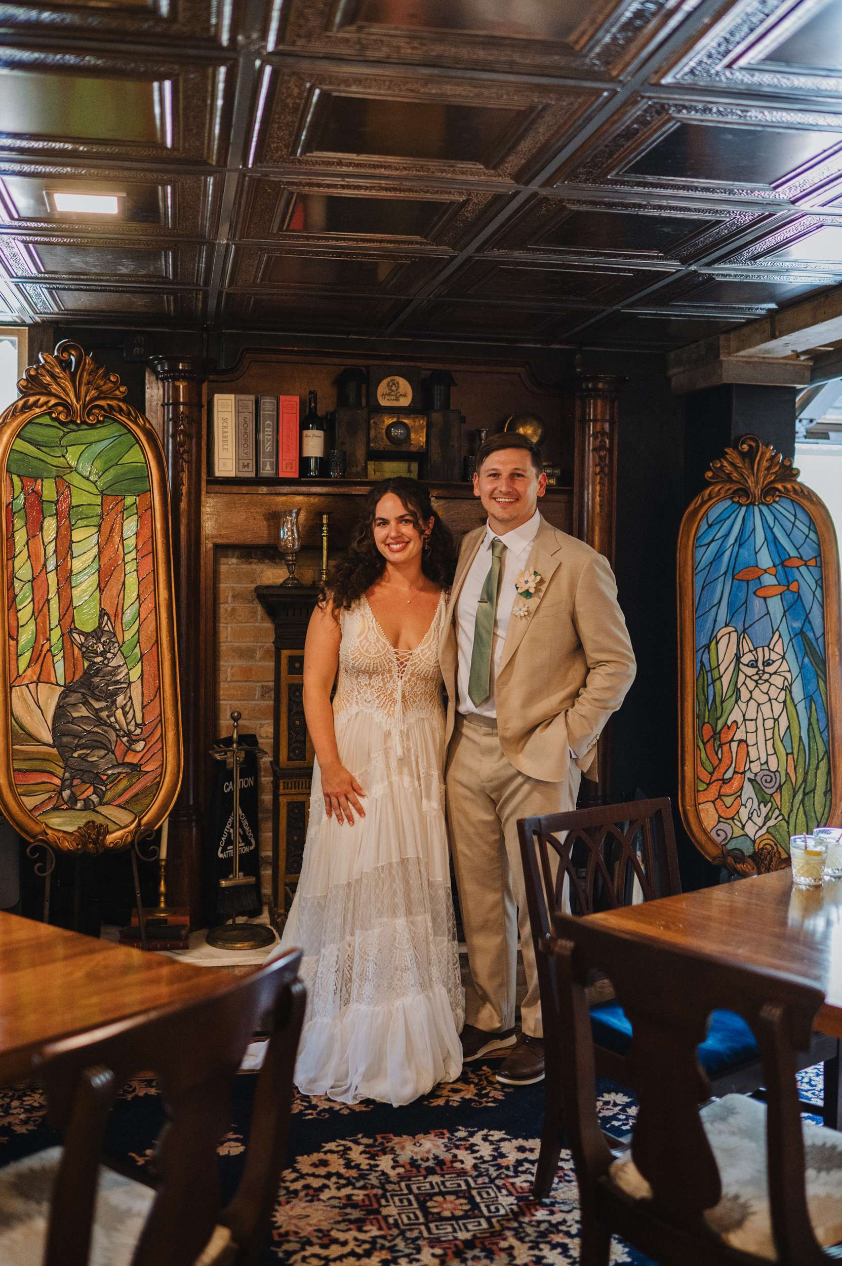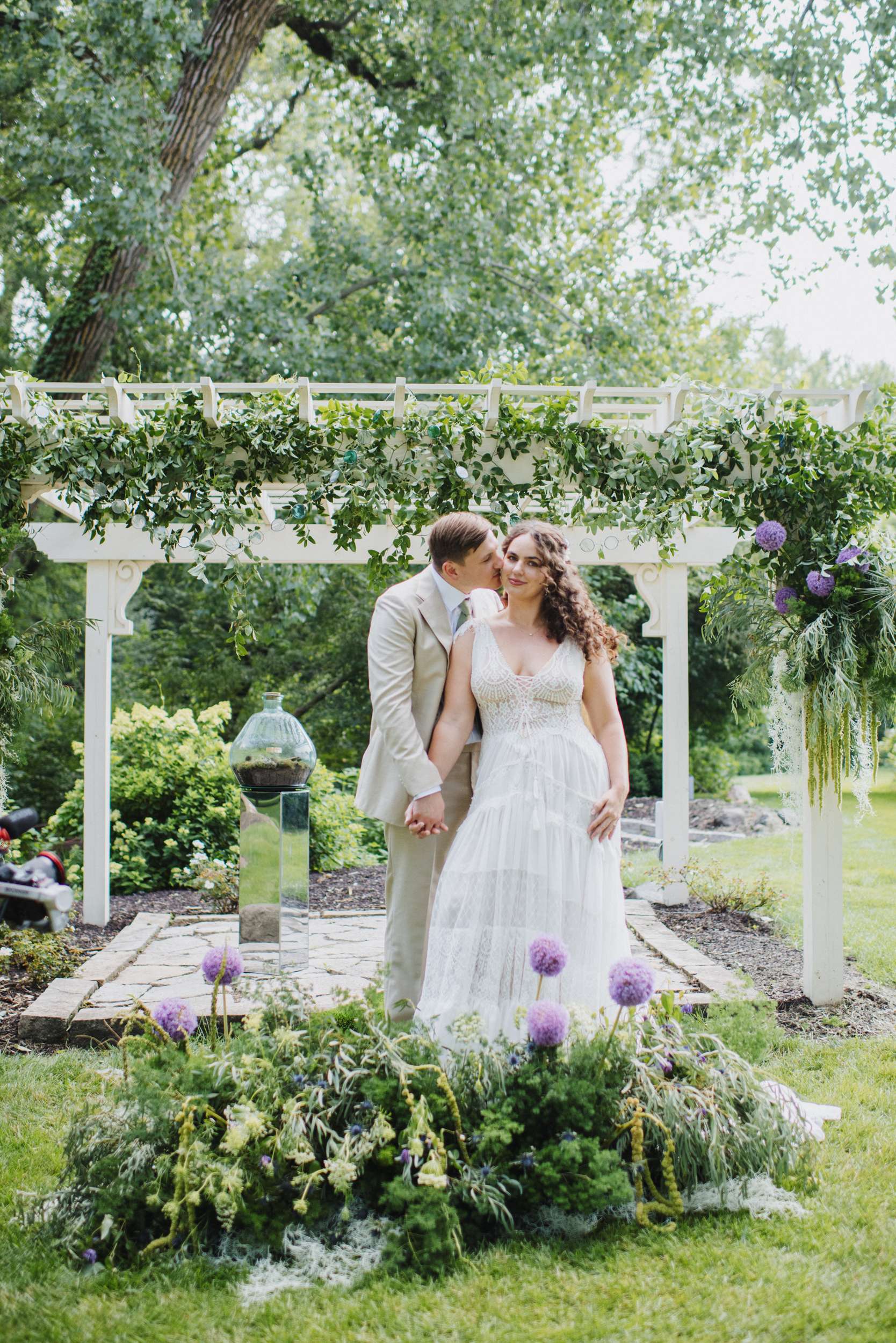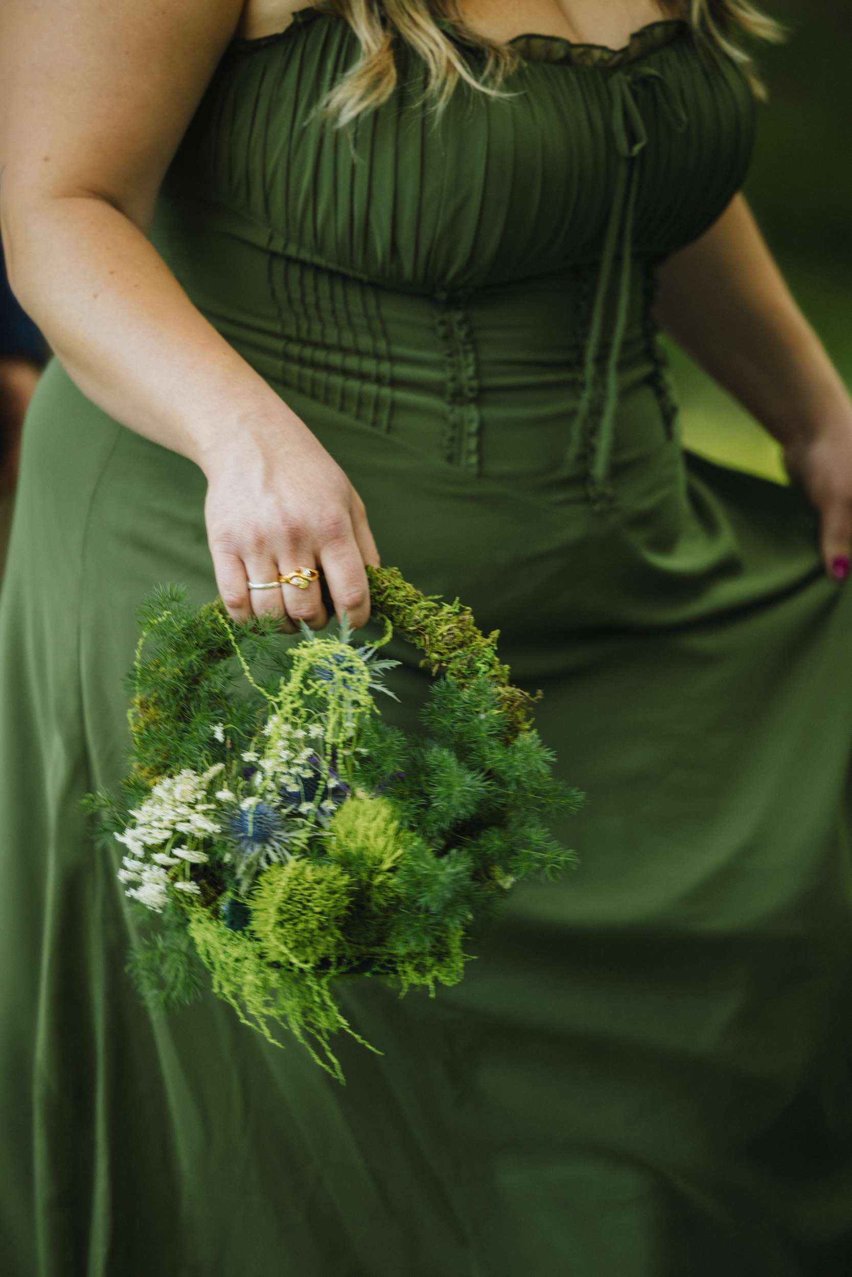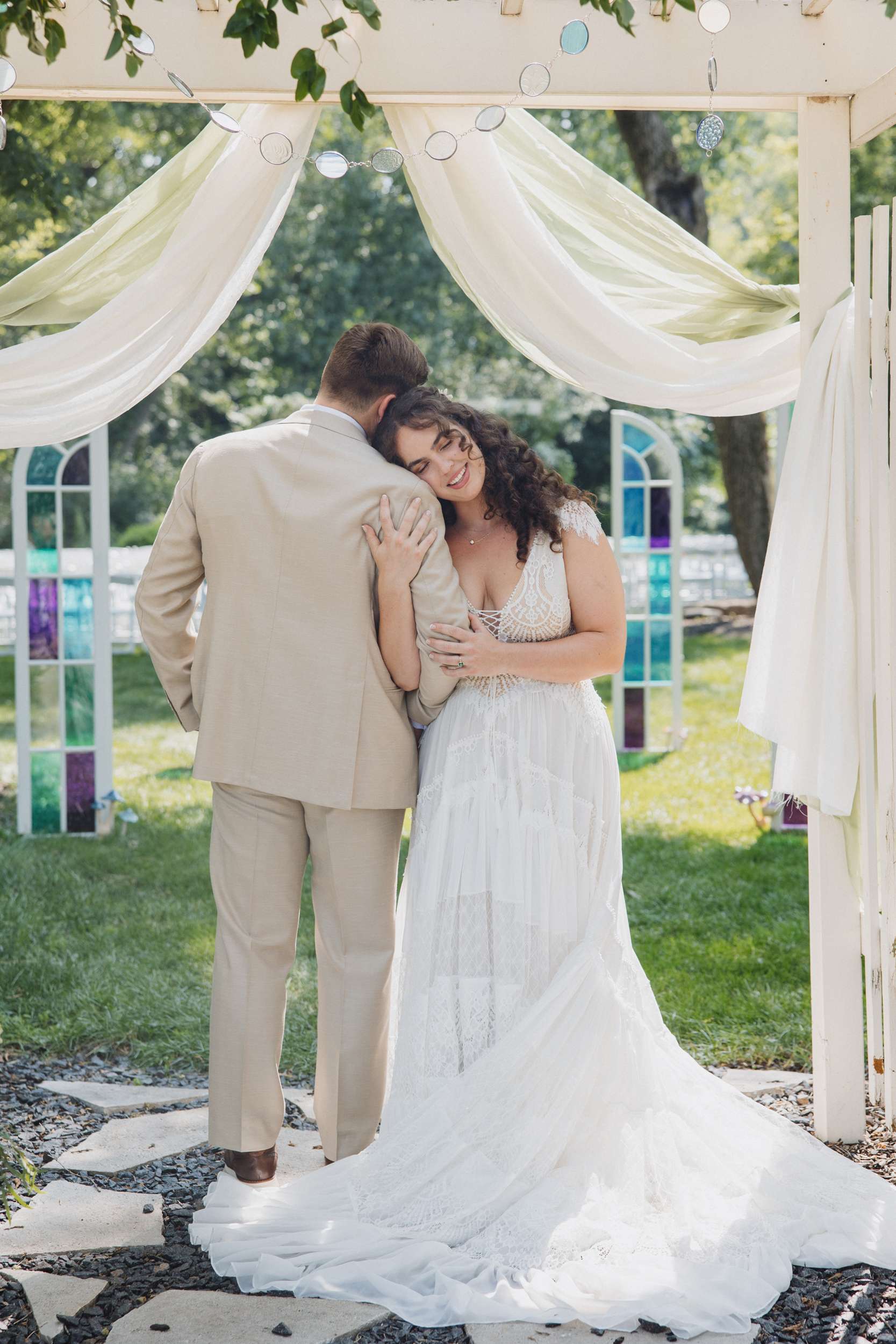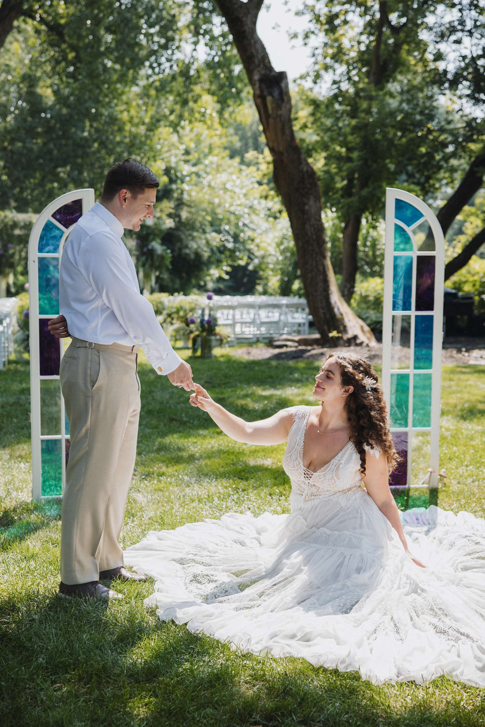 Mia and Jake arrived at their Illinois venue with two U-Hauls full of the bride’s creations to decorate the space. From the décor to the table plan, the flowers to the stained glass ceremony structures – she made it all herself. She had spent almost two years making the wedding by hand. Stained glass, thrifted lace, moss purses, fused flowers, watercolour name cards, terrariums, bouquets, signage, hair pieces, and décor for more than one hundred guests. She even did make-up and hair for herself, her mum, and the flower girl. Nothing about this day came from a shop. It all came from the art room in her apartment.