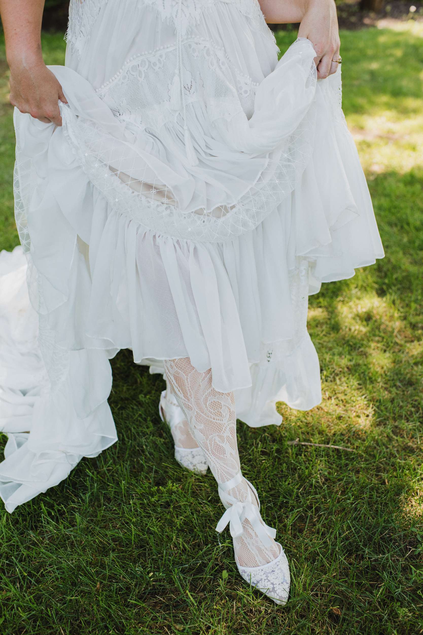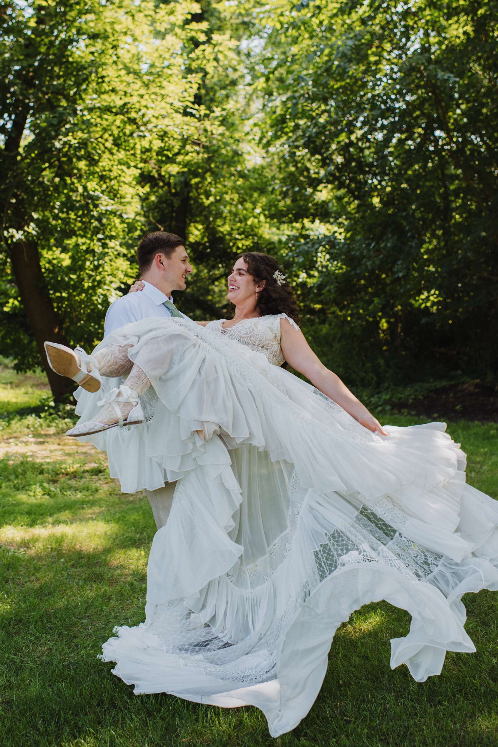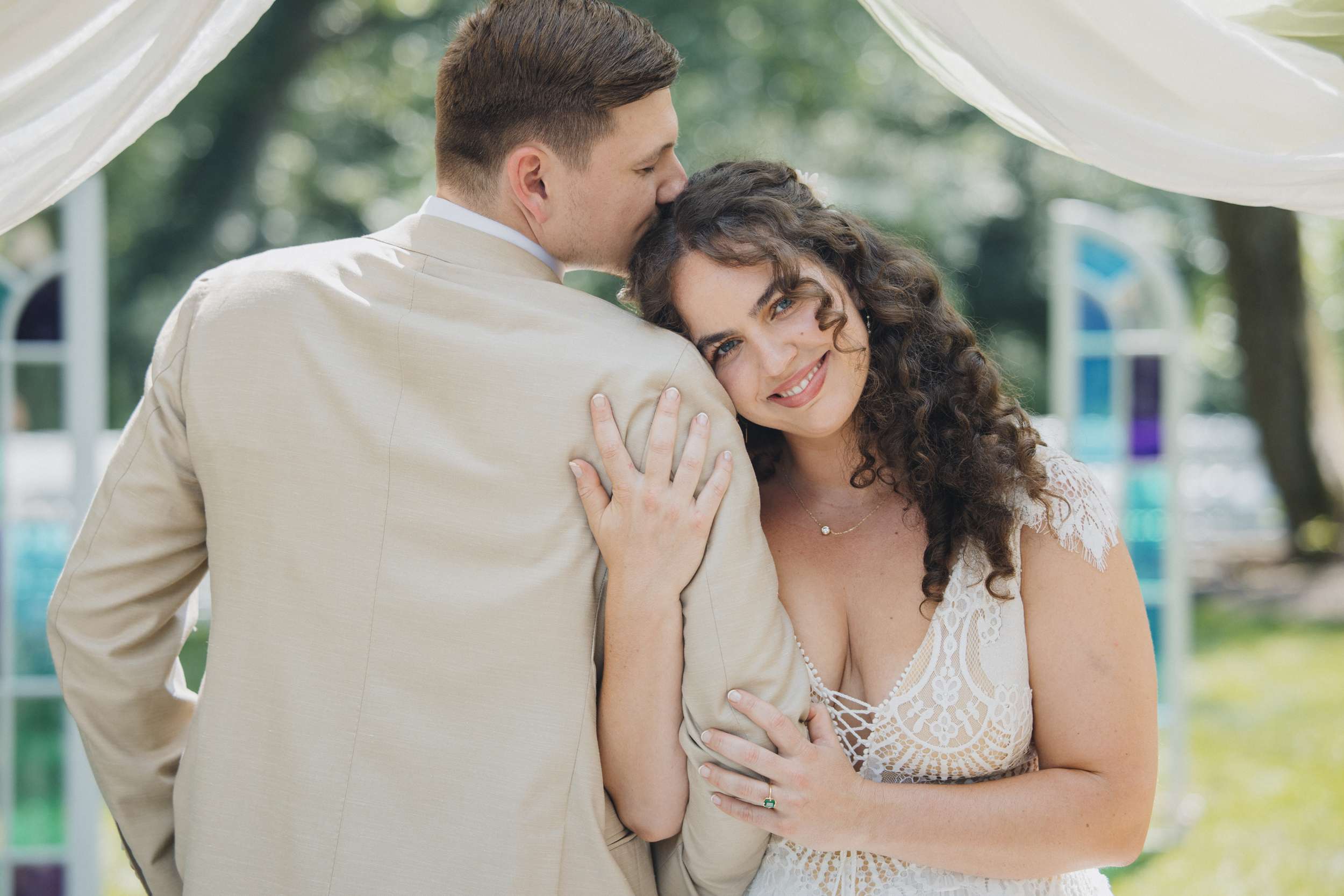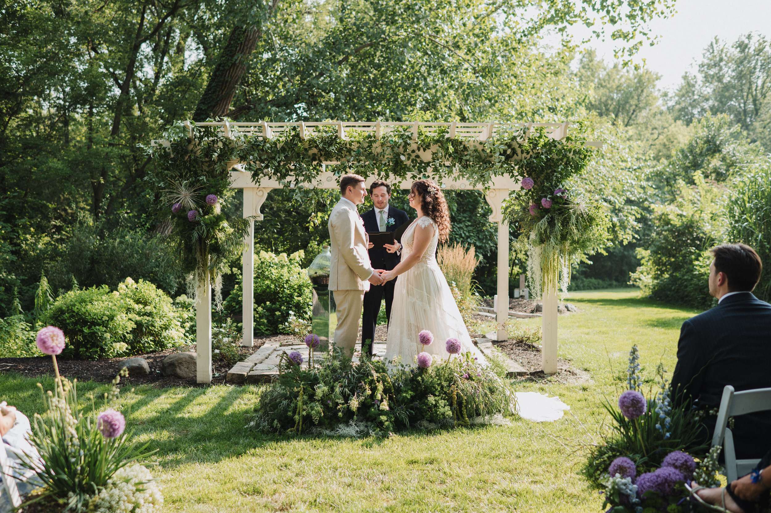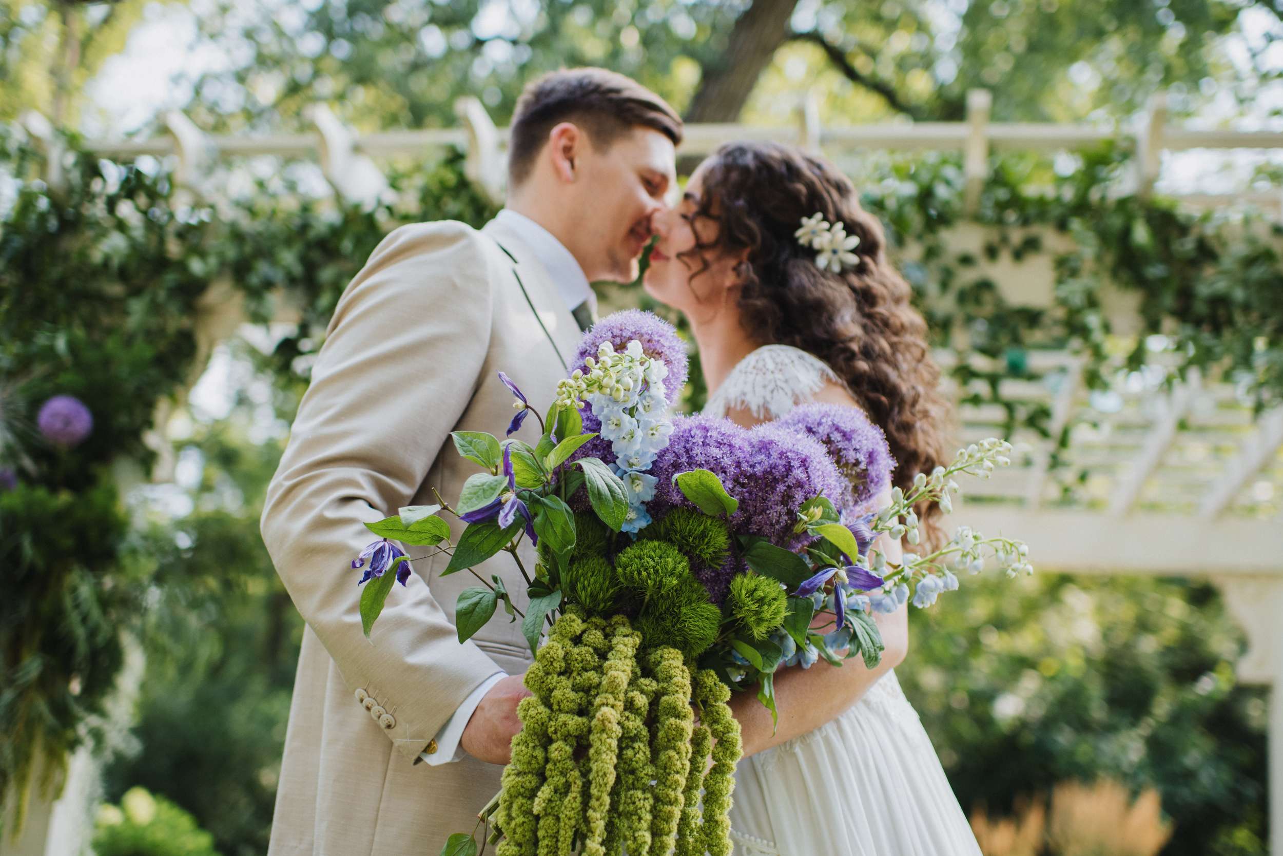 Mia and Jake arrived at their Illinois venue with two U-Hauls full of the bride’s creations to decorate the space. From the décor to the table plan, the flowers to the stained glass ceremony structures – she made it all herself. She had spent almost two years making the wedding by hand. Stained glass, thrifted lace, moss purses, fused flowers, watercolour name cards, terrariums, bouquets, signage, hair pieces, and décor for more than one hundred guests. She even did make-up and hair for herself, her mum, and the flower girl. Nothing about this day came from a shop. It all came from the art room in her apartment.