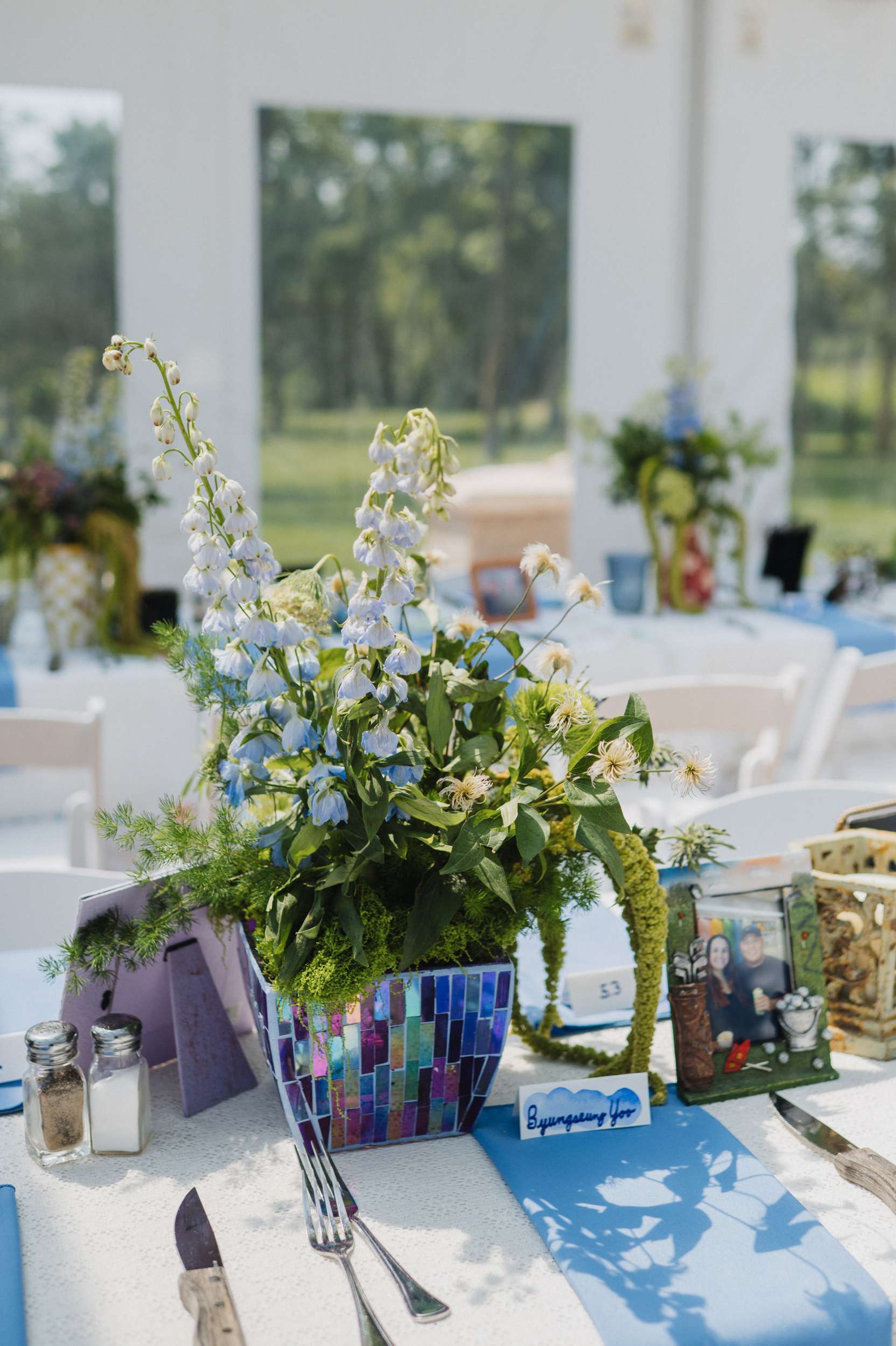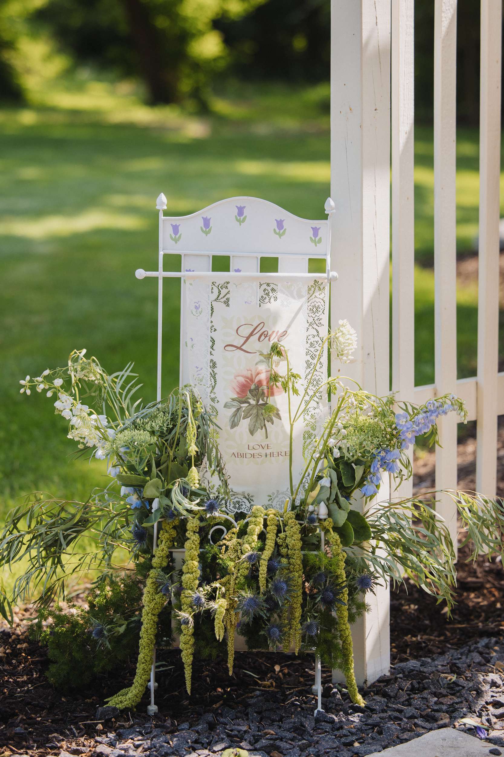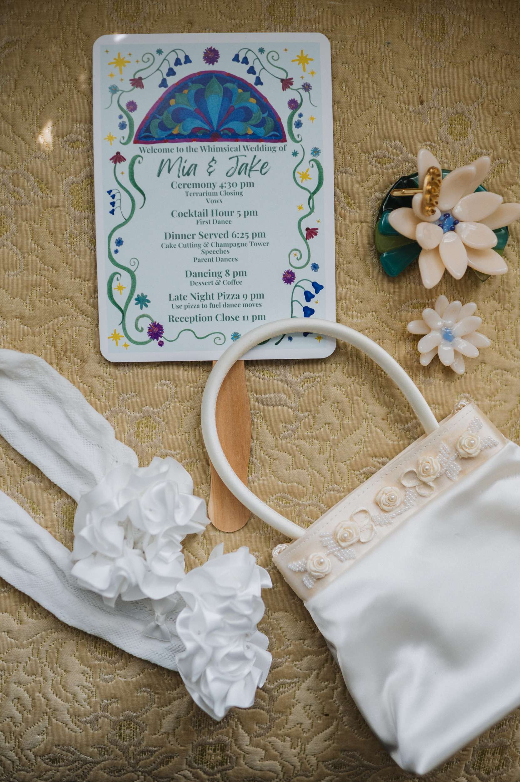 Mia had always called the theme ‘The Whimsical Wedding of Jake and Mia’. She and Jake grew up on fantasy books and loved the idea of a magical garden that felt alive. She said, “I don’t think its everyday you have a bride doing fused glass flowers, making all the signage by hand, doing all the florals, and doing her hair and make-up.”
