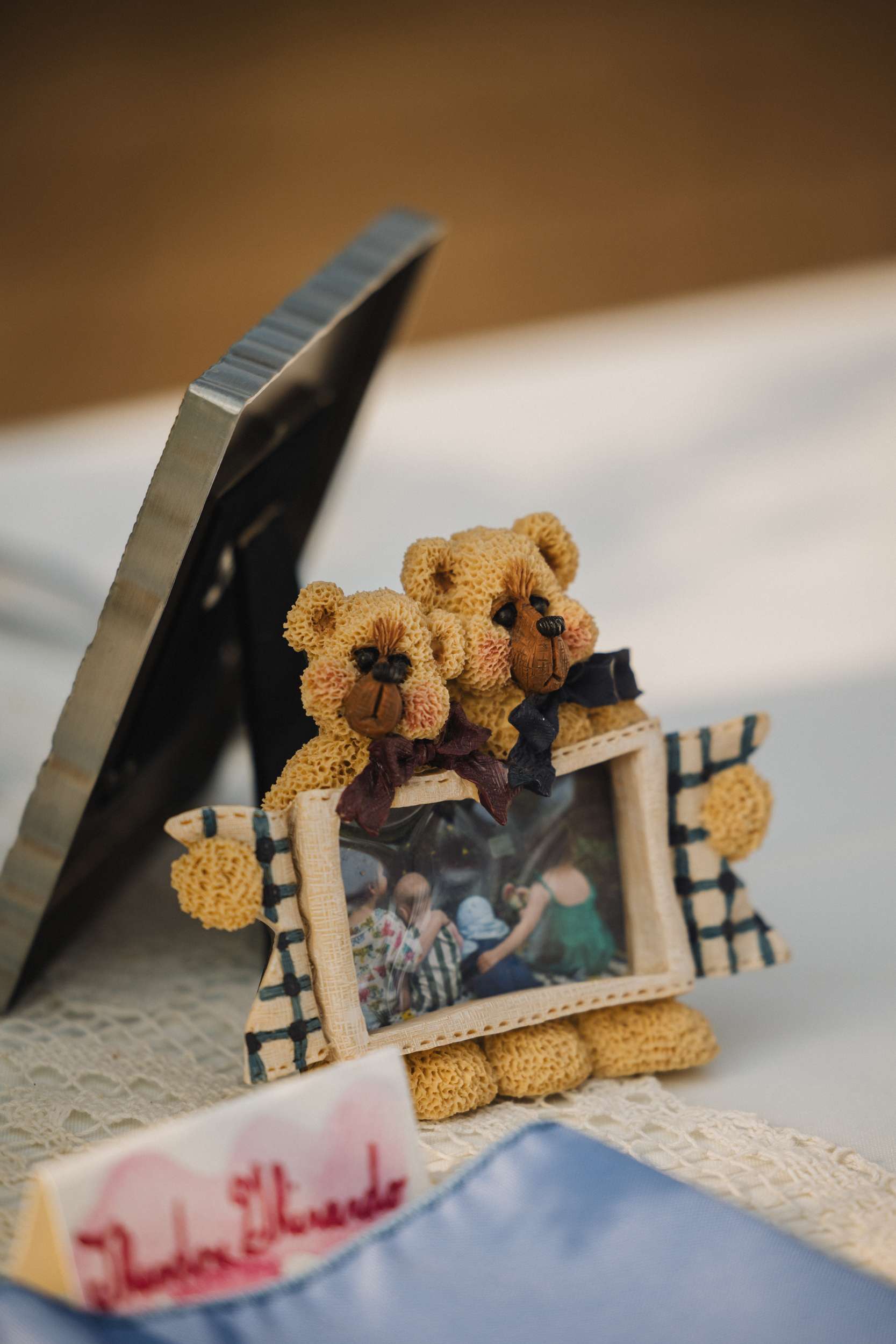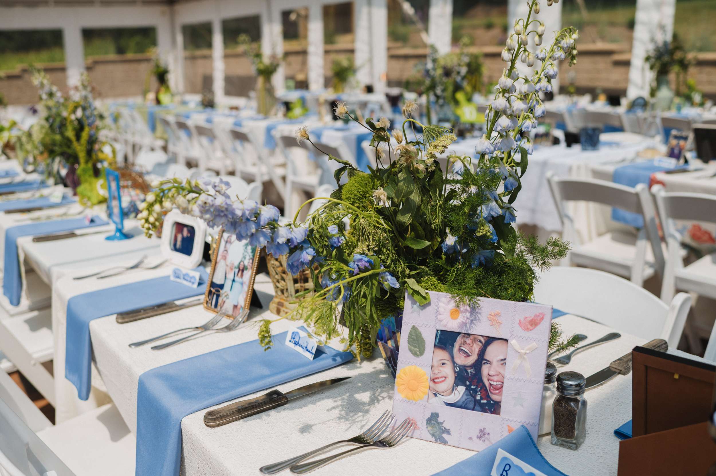 The reception then unfolded as a full-scale gallery of their lives. Every guest received a thrifted frame chosen specifically for them, filled with a photo of that person with the couple. Some frames held family portraits. She wanted people to take something real home, not a token.