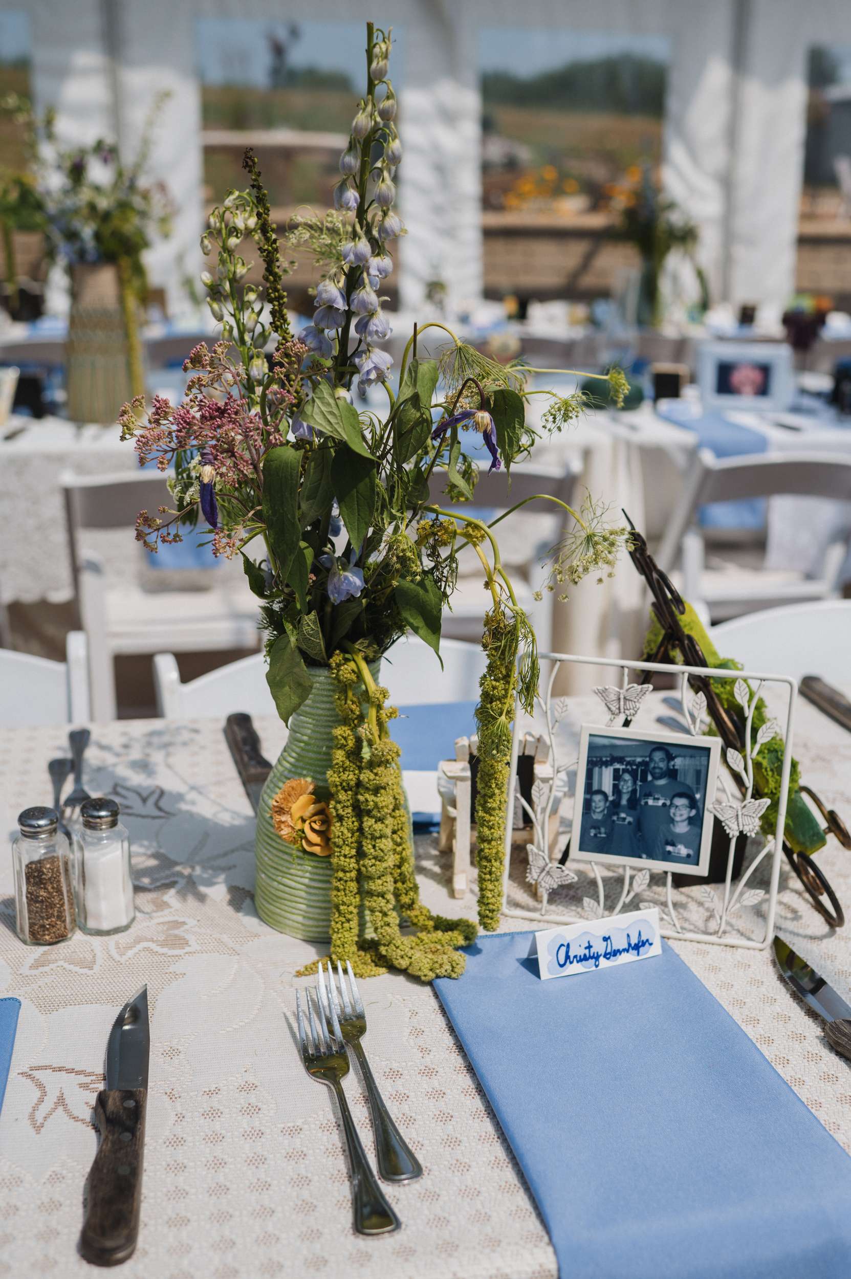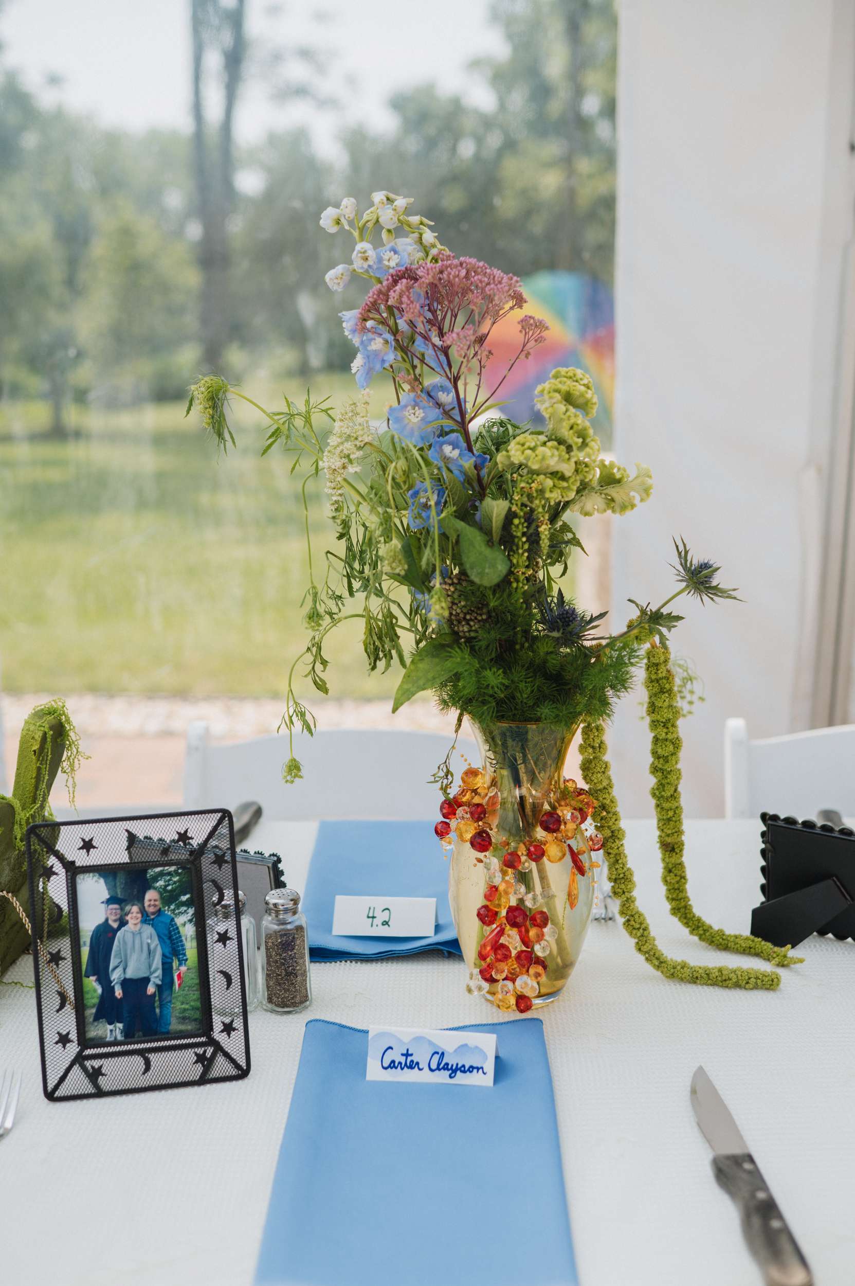 Her prized Facebook Marketplace mirror became the seating chart. She had collected décor for each table, coordinating style and colour across the room. She said, “I wasn’t interested in buying any décor so I knew if I wanted something I had to make it myself. Doing our own florals was a very big money saver, however it added on a lot of extra work. We had to prep all the flowers the week before, change waters, and then transport them to the venue, and then actually set them all up. It saved us money, but we lost a little sanity!”