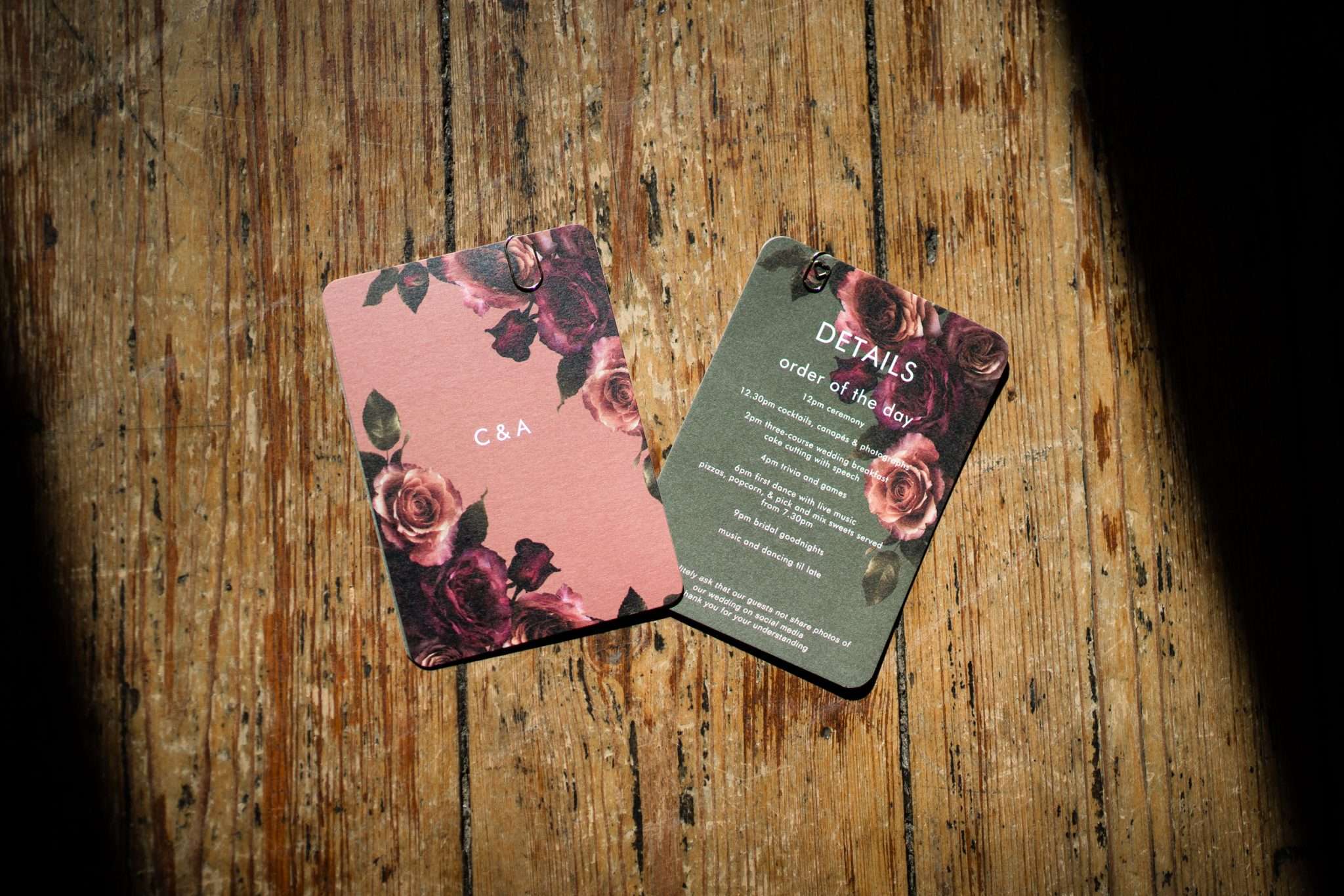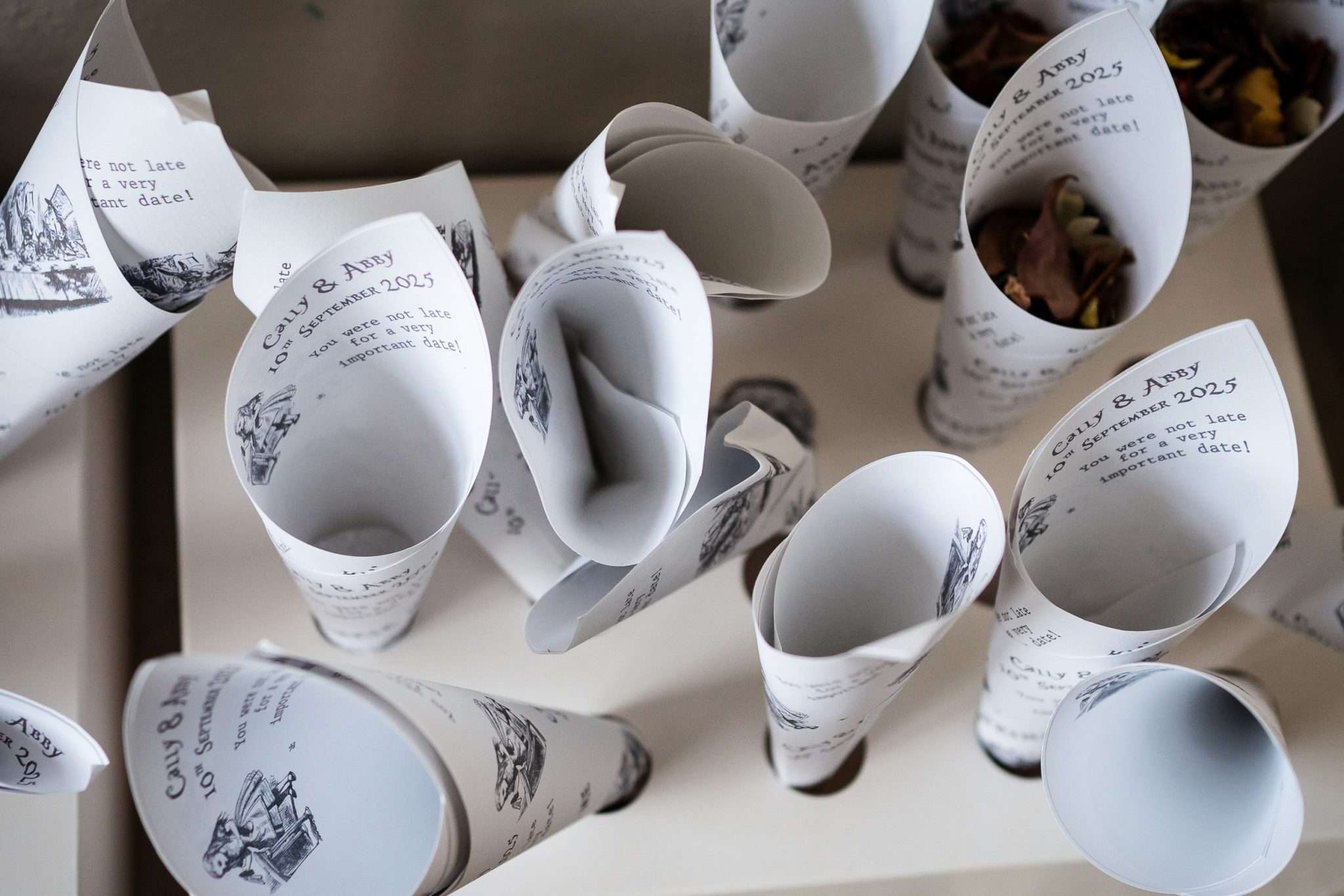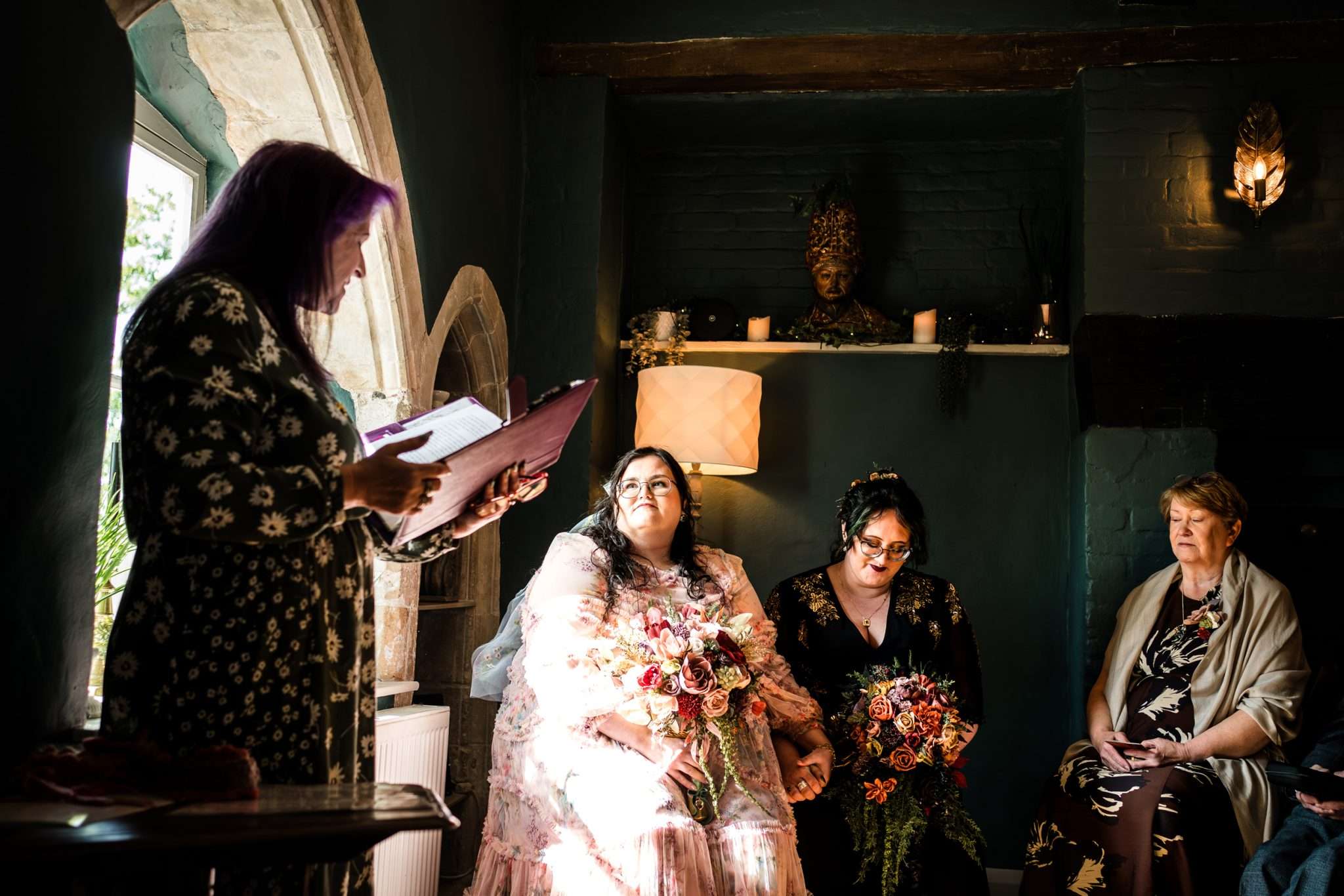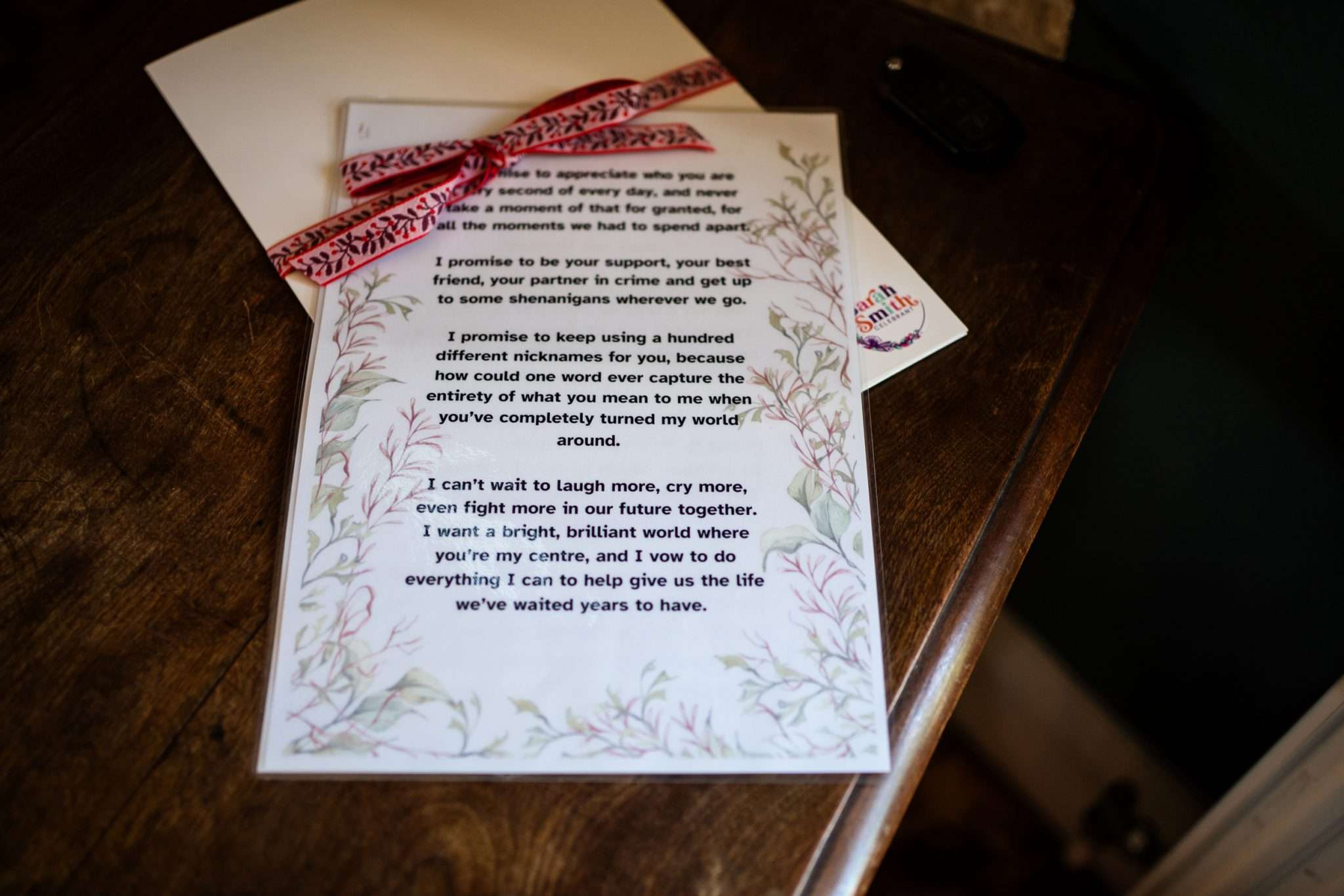 “We took a lot of guidance from our celebrant for the ceremony”, Cally told us. “We knew we didn’t want traditional vows, but Sarah really steered us towards a story style with readings, a speech from my mum, and handfasting ceremony with a very special handfasting cord crocheted by my grandmother (now an item we’ll treasure forever). We’re laid back, cosy and quiet as a couple so we just let her take the lead on structure and what we were comfortable with.” After the ceremony came a confetti toss which was made from dried flower petals and leaves that came from places they’d been together or flowers they’d sent each other over the years.